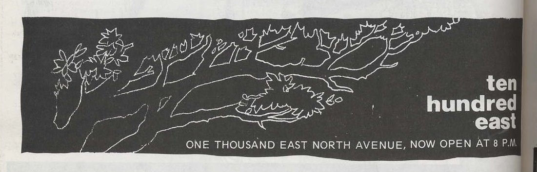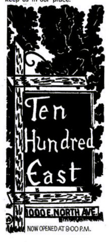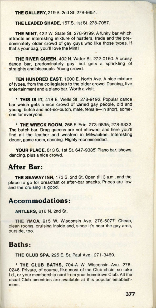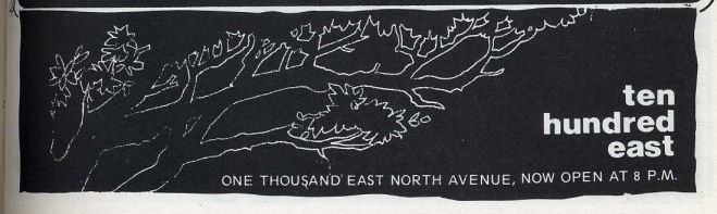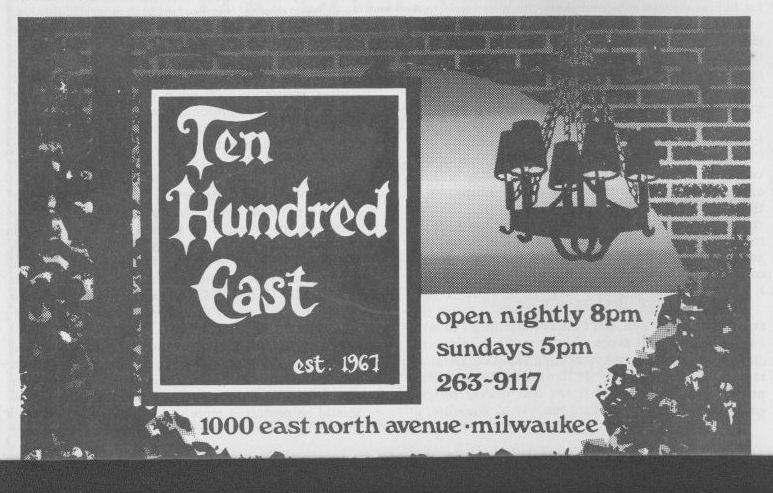 Although the first advertising for the "Ten Hundred East" bar found is in the January 1973 issue of GPU News, reports are that this bar opened as early as 1968 or 1969. Ten Hundred East was "the" bar to be in and be seen in by gay men, prior to the opening of the first Milwaukee gay mega-bar and disco/ dance bar, the Factory, in 1973. But even after that and other bars opened, Ten Hundred East continued to be popular-- especially earlier in the night. After a few drinks at 1000East, some people left to go downtown to the dance bars. The August 1976 issue of the local "GLIB Guide" describes the business as follows: "One of the longer lived bars has remodeled into brickwork motif. Neighborhood group, dancing." And the Spartacus American Bicentennial Gay Guide (1976) described it as "A nice mixture of types, from the collegiates to the older crowd. Dancing, live entertainment and a piano bar. Worth a visit." More information about this business is welcomed from anyone who can contribute it.
