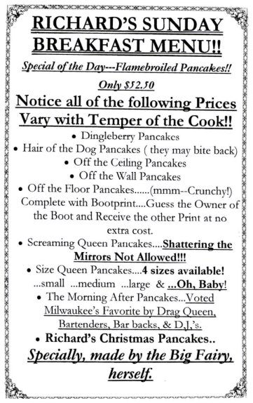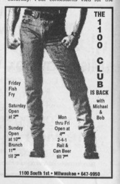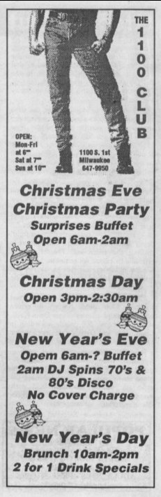 The 1100 Club was a moderately popular bar, moreso with the leather community although it didn't fit the traditional model of a levi/leather bar, as did the Wreck Room (opened in 1977) and Boot Camp (opened in 1984). 1100 Club was a friendly place that held any number of shows and similar events, and this is where the leather community embraced it: it was another good venue for leather man title contests and similar events for the leather community. This was especially true after the Wreck Room closed in 1996. Although the address faced First Street and the main entrance was on the corner, the side entrance off East Washington Street was more commonly used- especially for men dressed in leather. In mid-1996 rumors began to circulate that the bar was closing. But co-owners Bob Minzloff and Mike Petri told 'Wisconsin Light' newspaper that they were in the process of buying the building, and the closing was only to refinish the floors as a condition lof the sale, and do some other remodeling prior to reopening. The bar went on in business for another 7 years. More information about this business is welcomed from anyone who can contribute it. |