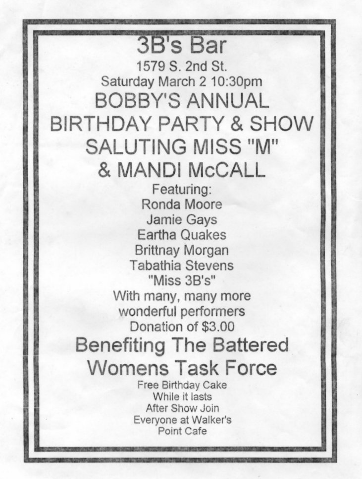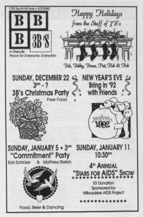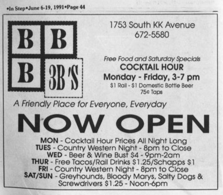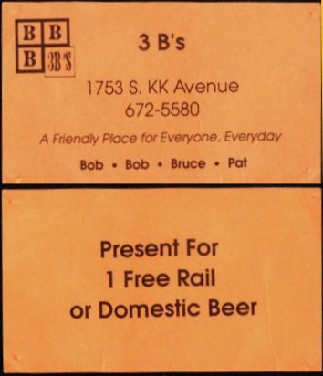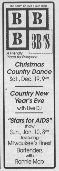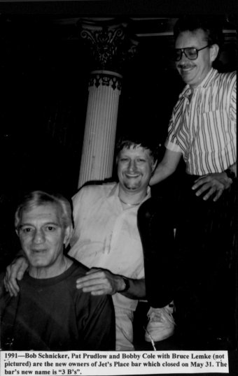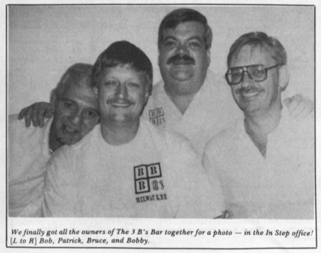 3B's came about when Jeanette sold her interest in Jet's Place, and 4 friends opened the bar under a new name in May 1991 as "3B's" since 3 of the 4's names started with the letter "B". Owners Bob Schnicker, Bruce Lemke, Bobby Cole and Patrick Prudlow had a good clientele, and the bar was especially popular with western dancers; lessons were held for line dancing and pattern dancing every Friday night. The 1753 S KK building has been the site of at least four LGBT bars over the years: In May 1995, 3B's held a Moving Sale and Closing Party, when 'Rob' retired. The remaining owners relocated to 2nd and Lapham on June 1, 1995 and planned to open the bar as "B's".
