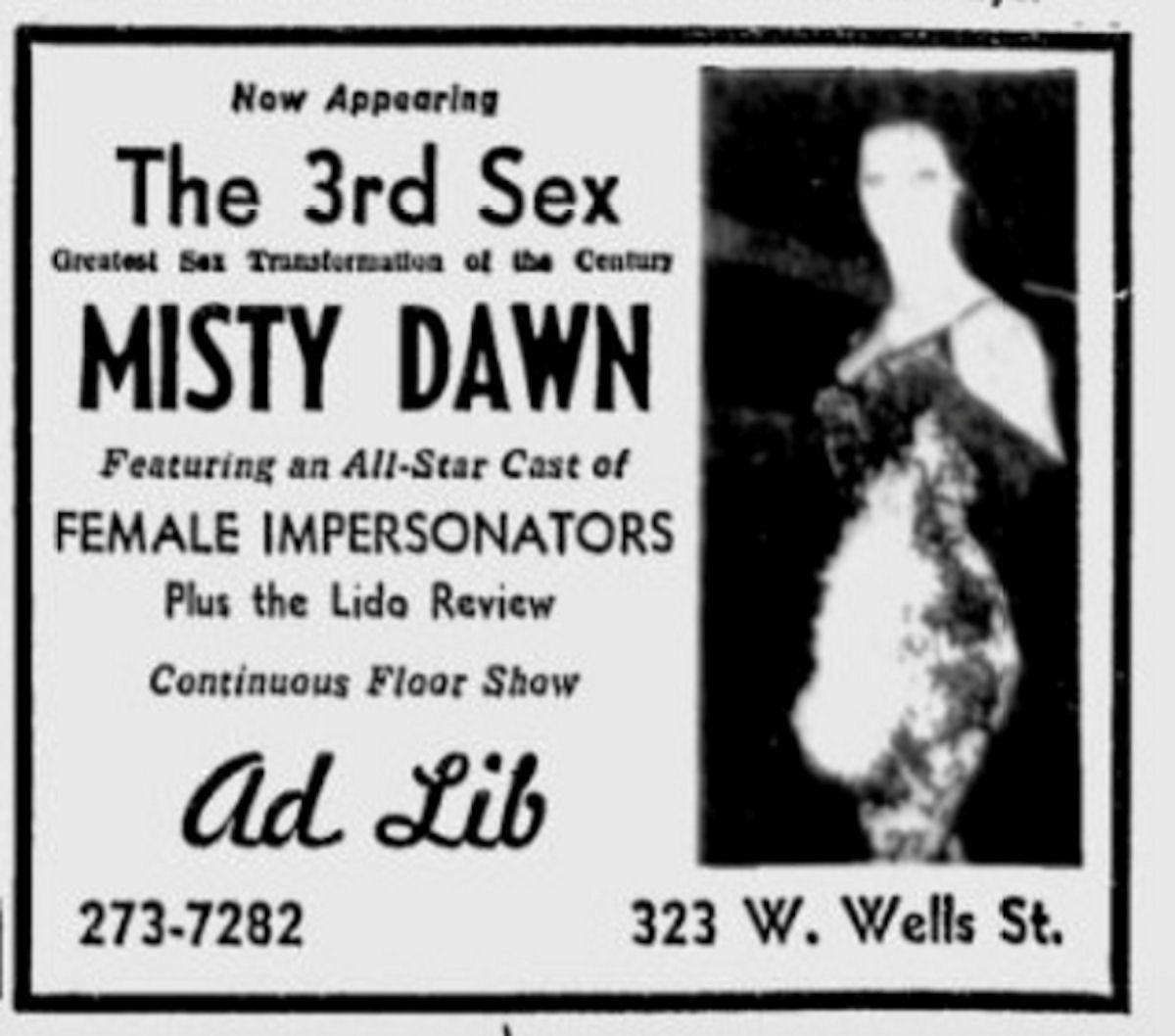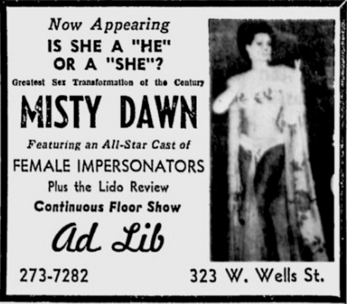 The Ad Lib was not a "gay" or "lesbian" bar per se. But it has an important place in LGBT life in Milwaukee due to a 1969 surprise: the emcee announced "The Third Sex!.. an all-star cast of female impersonators!”. In time a transgender defense also made news. Background On June 10, 1966, the Ad Lib Nightclub opened in the historic Commerce Building at 323 W. Wells, kicking off ten years of non-stop go-go drama. Formerly an army surplus store, the Ad Lib storefront was beautifully redesigned as a cocktail lounge, supper club and cabaret. “Richly gilded in golds and scarlets, the Ad Lib is brassy classy with ornate glass chandeliers, a big mirrored wall, and soft pink lighting,” said the Milwaukee Journal. “The setting is both plush and posh.” The Ad Lib delivered topnotch talent in an intimate and respectable setting. Within its first year, the highly-regarded nightclub welcomed Miles Davis, Thelonious Monk, Wes Montgomery, Dizzy Gillespie, Count Basie, Herbie Mann, Lionel Hampton, Dorothy Donnegan, Henny Youngman, Rusty Warren, Art Van Damme, Gene Krupa and many, many more. Although multiple people were eventually licensed as the bar’s legal owner, the Ad Lib was always part of Frank Balistrieri’s nightlife syndicate. Balistrieri, his family and associates had deep involvement in almost a dozen bars between the 1950s and 1980s. By 1966, Balistrieri was truly one of the most powerful men in Milwaukee, and 4th and Wells was the heart of a growing empire. The Ad Lib’s heart beat like a jazz drum. With a 225-person capacity, the venue was frequently oversold, and reservations became a hot commodity. Keeping up this momentum became very challenging for promoters, and nightlife critics wondered how long they could keep the names coming. And then, just like that, the Ad Lib abruptly switched to an all-striptease format in August 1967. “We’re only doing this temporarily,” promised manager Jimmy Jennaro. “I already have jazzmen booked for September and November.” But this wasn’t exactly true, as the Ad Lib remained a strip joint for the next six years. There was money to be made in the Sexual Revolution. The Ad Lib joined a growing red light district that already included the Brass Rail (744 N. 3rd St.,) the Downtowner Bar (340 W. Wells,) the Princess Theater (738 N. 3rd St.) and many, many adult bookstores. What had been Milwaukee’s Theater Row was quickly becoming a city of night. At the time, strict ordinances made it illegal for female entertainers to sit at any table, in any booth, or elsewhere on the premises of a tavern with a male customer, or for performers to solicit drinks from anyone of the opposite sex. Female performers -- including singers and musicians -- were not allowed to accept drinks from the audience, although their male companions were encouraged to do so. This didn’t stop the Ad Lib B-Girls, who were as famous for drink hustling as they were for losing their tops. Hostesses hawked private meetings between dancers and patrons that were little more than wallet heists. Easy marks saw their $20 bills disappear as the giggling gals double-fisted shot after shot of overpriced “liquor” and raced back to the dressing room. (The house always wins, after all, when the shots are secretly tap water.) The Ad Lib became known for having a higher class of stripper than the Brass Rail (“rough trade”) or the Downtowner (“where strippers go to die.”) It was also known for remarkably racy floorshows. “Vice squads are cracking down on strip clubs,” said the Milwaukee Sentinel. “The city allows dancers to strip down to their underwear, but at the Ad Lib many dance in G-strings or less.” Shortly thereafter, a dancer was arrested for appearing bottomless on stage, and another was arrested for “inappropriately” touching a police officer. Female Impersonators Then one night, the Ad Lib reassigned its regular girls to the Brass Rail and announced three new “Go-Go Girls” would replace them. As the so-called go-gos took the stage for the first time, the music cranked up, and heads spun in disbelief. “Now appearing: The Third Sex!” yelled the emcee, “an all-star cast of female impersonators!” “I was a stripper there for years,” said Jamie Gays, one of Milwaukee’s LGBTQ elders, who auditioned at the Ad Lib with Frank Balistrieri himself. “During the Vietnam War…guys would throw their dog tags up on the stage. I’d charge them a dollar to get them back. If they only knew that I was a guy…they would have killed me.” “They were all guys except for one: Misty.” Misty Dawn, a transgender performer billed as “The World’s Most Beautiful Boy,” quickly became the star of the floorshow. “Is She a ‘He’ or a ‘She?’” screamed the ads. With a stage presence that was bigger than life, Misty brought big-city Chicago burlesque that audiences would never forget. “She twists and wriggles to the tune of a scratchy record,” reported the Milwaukee Journal. “Wearing only a G-string and a mesh bra, Misty squirms towards the stairway leading off stage. With a suggestive smile over her shoulder, she unfastens the G-string and wiggles it off. She flips it over her shoulder and makes a naked posterior exit up the stairs and out of sight.” Switching out the cast was smart business for the Ad Lib. The nightclub was busier than ever, with a sexually charged mix of clueless straights, clued-in gays, made men, vice cops and FBI detectives. The “female impersonators” were far cheaper talent than national jazz performers or burlesque dancers. Gay men were loyal customers, generous spenders and less likely to cause trouble. Best of all, the flexible gender identities of the performers provided a flexible defense as the Ad Lib’s owners continued to push legal boundaries. Ushering in the New Year with “the most unusual show of the century,” Misty Dawn exposed her breasts and buttocks on January 20, 1970 and was promptl