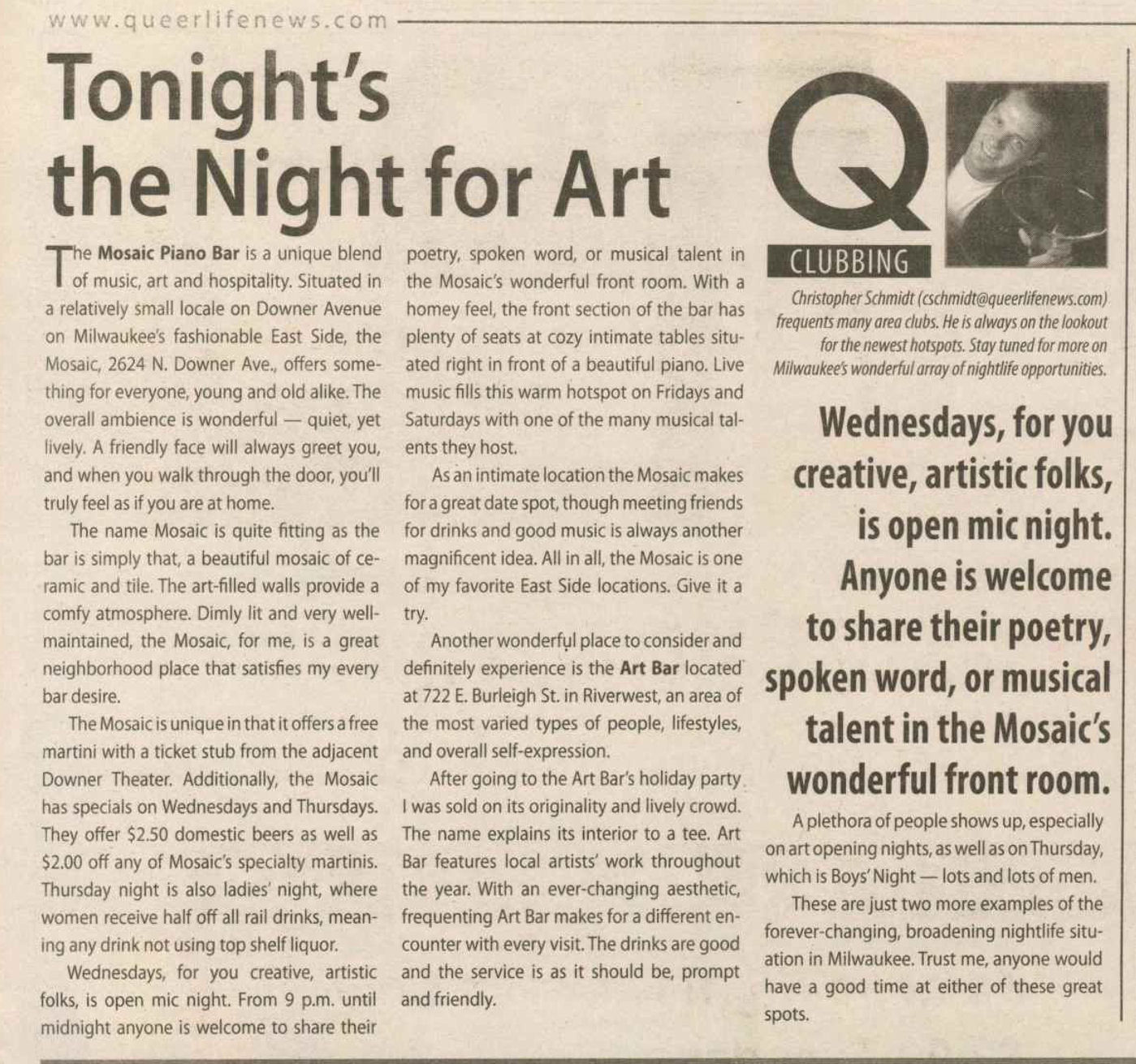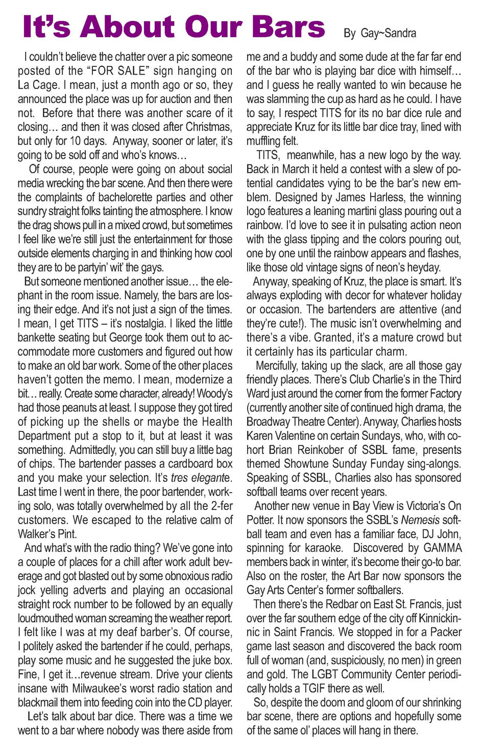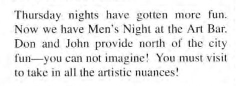 Article: About Bars; Art Bar takes over Gay Arts Center's former softball team (lower right of article)