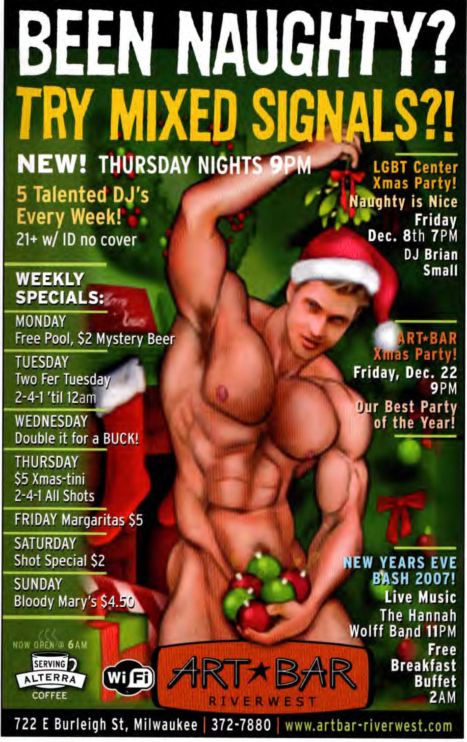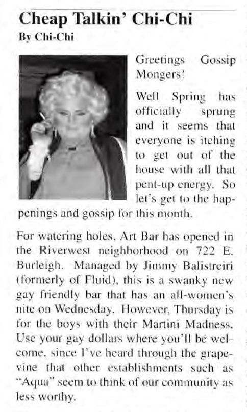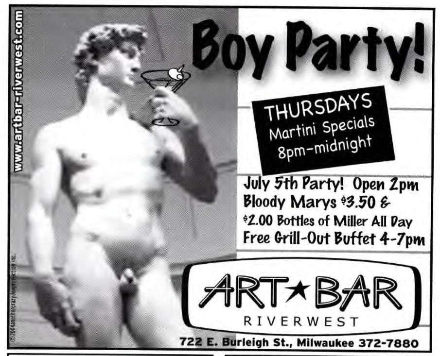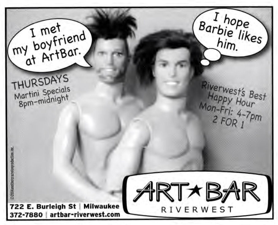 Art Bar was opened well off the "beaten path" of LGBT bars at the time- and is still well outside the typical LGBTQ bar neighborhood. While advertised and focusing on the LGBTQ community, Art Bar has always been welcoming to the entire surrounding neighborhood and the "straight" community at large. Opened by lovers and partners Don Krause and John Tomlinson, the bar had an inviting, slightly 'artsy' atmosphere. One entered from the street facing north, entering a reception room, which housed several tables and stacks of community literature on the right. Directly ahead (north) a few steps up placed one in the main bar area- an island bar, surrounded by bar stools, with art work displayed on the west and north walls. To the east was a slightly smaller side room, with tables bordered with wine-bottle corks, and additional artwork on the walls. Down a side stairway led to a room to the east of the main entry room- cozy, with a sofa, comfy chairs, and more artwork- which also connected back to the main entry area. Artwork was changed frequently, whether featuring a local artist or another, or a particular theme. The Art Bar was an early supporter of LGBTQ groups and events. Even in the same issue in which the bar wasa first mentioned (OutBound magazine vol. 3-05, April 2004), an article mentioned that the bar had hosted a bowling team for the recent 'Rita Bowl' to raise money for the Holiday Invitational Tournament. Another example: they hosted an "after party" for a "takeover" of the Milwaukee Guerilla Gay Bar group on January 4, 2008. (The MGGB for two years held events that "On the first Friday of every month, MGGB takes over the hippest straight bar we can find in Milwaukee. We don't tell 'em we're coming- we'll just show up- by the hundreds- and make ourselves at home. Trick is, we don't announce our shindig's digs until the day of the party- we don't wanna give them any notice." The group often held a party at a supportive gay bar afterward. While some gay bars were annoyed, thinking they were losing some business on those nights- it was an early trend of LGBT people exploring alternatives for bar entertainment.) (Multiple examples of events and causes the bar hosted events for are on the Images and Articles page. Countless other examples are not documented herein.) In 2009, the couple also opened another bar, named "Two Bar & Lounge" (or "2") one door to the west, at 718 E. Burleigh. That bar, "a cozy speakeasy with a focus on ice cream drinks and well-crafted cocktails. Ideal for a date night, an after-dinner drink, or somewhere to simply relax...", primarily caters to the neighborhood rather than a primarily LGBT focus. The couple also own the "Wonderland Diner" restaurant to the east, at 730 E. Burleigh (the corner of Fratney). All three businesses continue to operate successfully as of 2024. They represent a model of how what starts as an LGBTQ focused business can be turned into an entire block of businesses open to and successful with the broader community. |