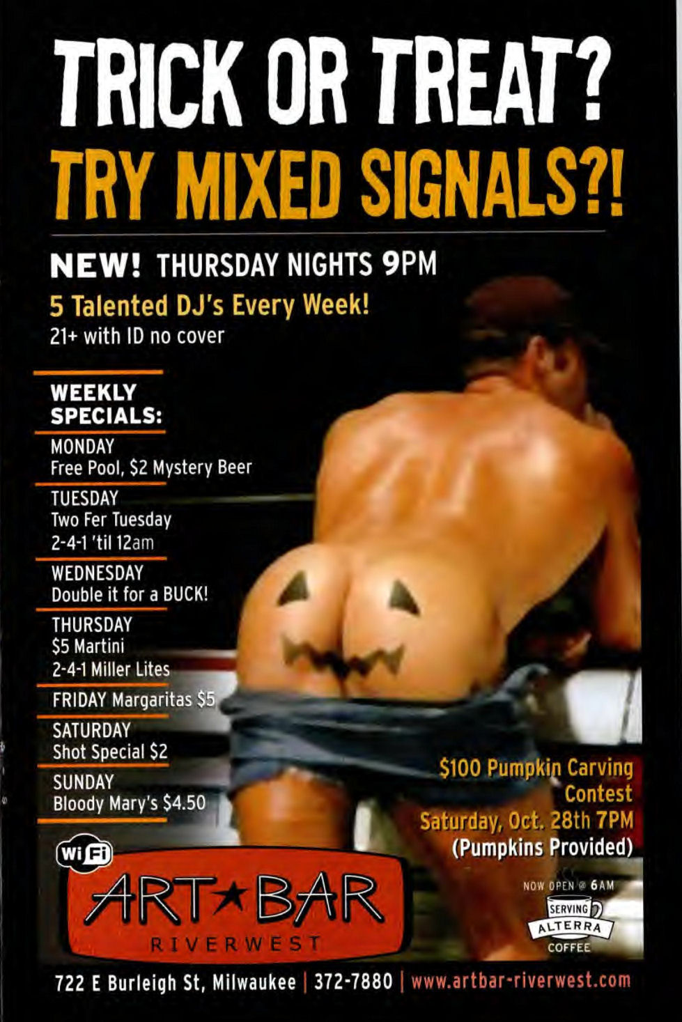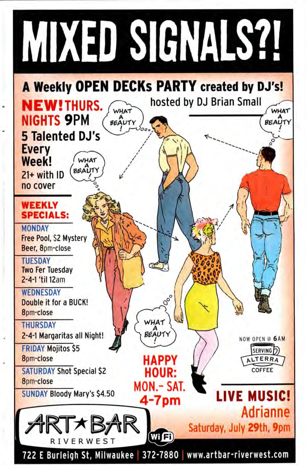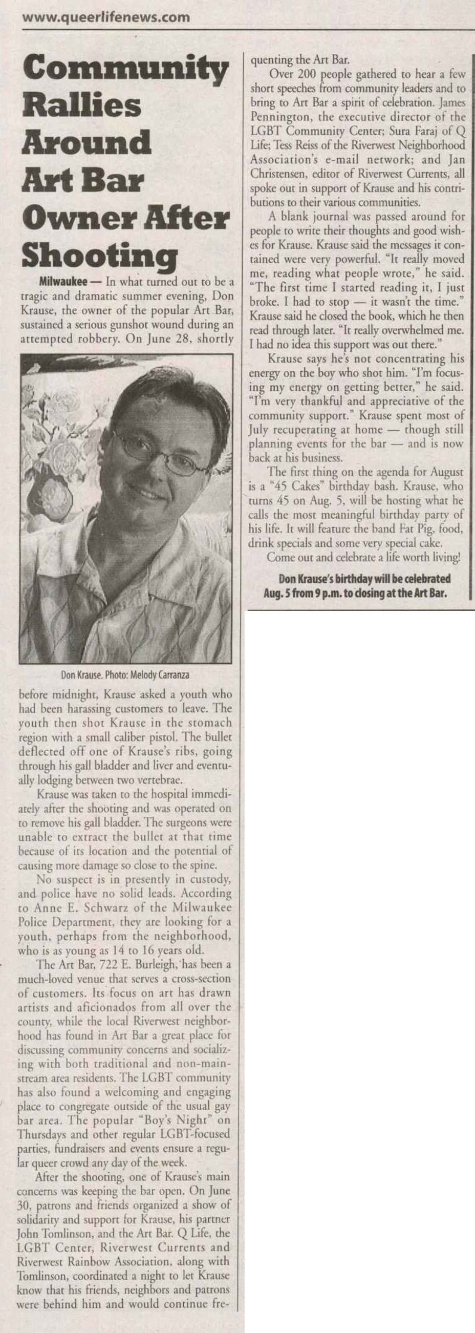 Art Bar was opened well off the "beaten path" of LGBT bars at the time- and is still well outside the typical LGBTQ bar neighborhood. While advertised and focusing on the LGBTQ community, Art Bar has always been welcoming to the entire surrounding neighborhood and the "straight" community at large. Opened by lovers and partners Don Krause and John Tomlinson, the bar had an inviting, slightly 'artsy' atmosphere. One entered from the street facing north, entering a reception room, which housed several tables and stacks of community literature on the right. Directly ahead (north) a few steps up placed one in the main bar area- an island bar, surrounded by bar stools, with art work displayed on the west and north walls. To the east was a slightly smaller side room, with tables bordered with wine-bottle corks, and additional artwork on the walls. Down a side stairway led to a room to the east of the main entry room- cozy, with a sofa, comfy chairs, and more artwork- which also connected back to the main entry area. Artwork was changed frequently, whether featuring a local artist or another, or a particular theme. The Art Bar was an early supporter of LGBTQ groups and events. Even in the same issue in which the bar wasa first mentioned (OutBound magazine vol. 3-05, April 2004), an article mentioned that the bar had hosted a bowling team for the recent 'Rita Bowl' to raise money for the Holiday Invitational Tournament. Another example: they hosted an "after party" for a "takeover" of the Milwaukee Guerilla Gay Bar group on January 4, 2008. (The MGGB for two years held events that "On the first Friday of every month, MGGB takes over the hippest straight bar we can find in Milwaukee. We don't tell 'em we're coming- we'll just show up- by the hundreds- and make ourselves at home. Trick is, we don't announce our shindig's digs until the day of the party- we don't wanna give them any notice." The group often held a party at a supportive gay bar afterward. While some gay bars were annoyed, thinking they were losing some business on those nights- it was an early trend of LGBT people exploring alternatives for bar entertainment.) (Multiple examples of events and causes the bar hosted events for are on the Images and Articles page. Countless other examples are not documented herein.) In 2009, the couple also opened another bar, named "Two Bar & Lounge" (or "2") one door to the west, at 718 E. Burleigh. That bar, "a cozy speakeasy with a focus on ice cream drinks and well-crafted cocktails. Ideal for a date night, an after-dinner drink, or somewhere to simply relax...", primarily caters to the neighborhood rather than a primarily LGBT focus. The couple also own the "Wonderland Diner" restaurant to the east, at 730 E. Burleigh (the corner of Fratney). All three businesses continue to operate successfully as of 2024. They represent a model of how what starts as an LGBTQ focused business can be turned into an entire block of businesses open to and successful with the broader community. |