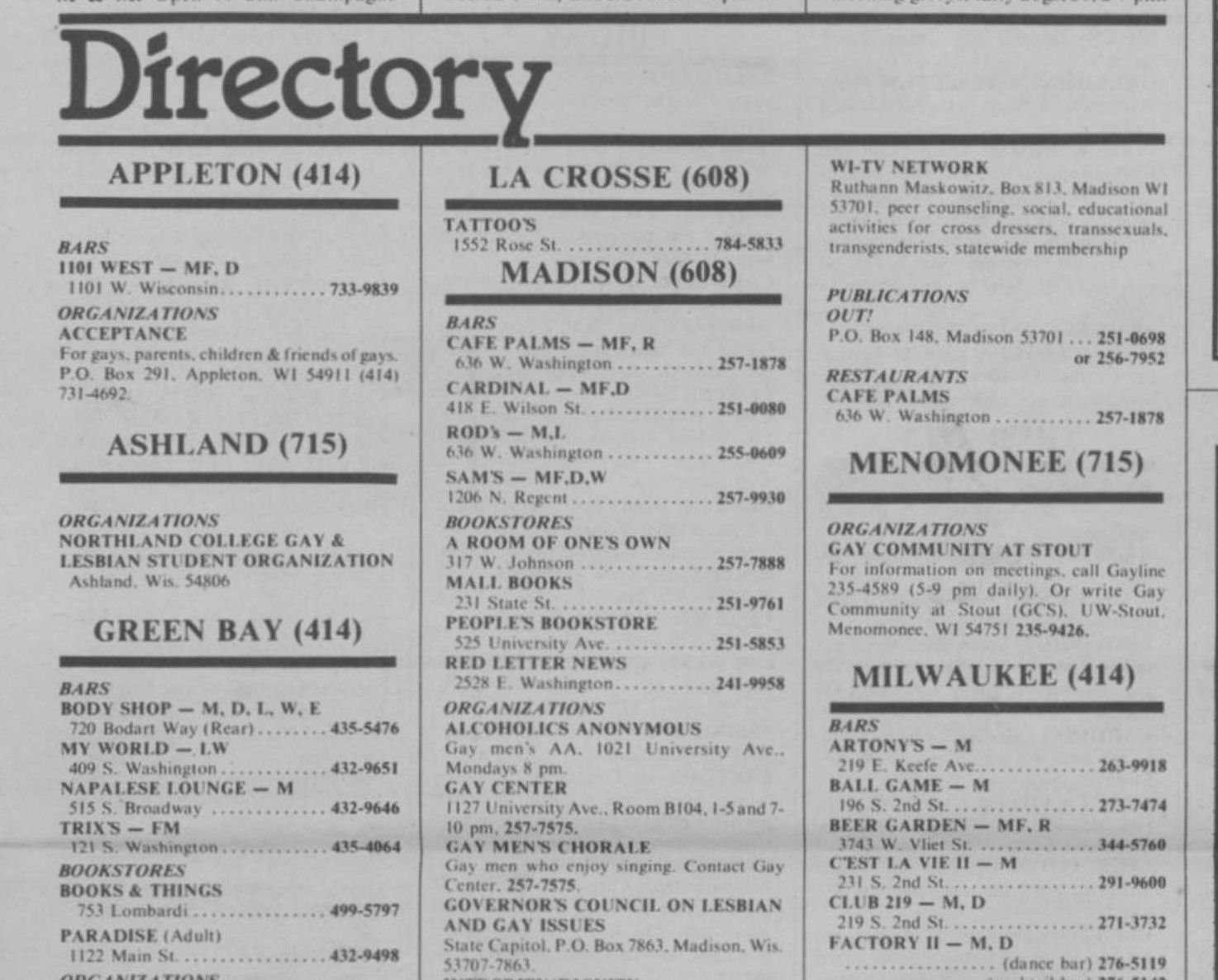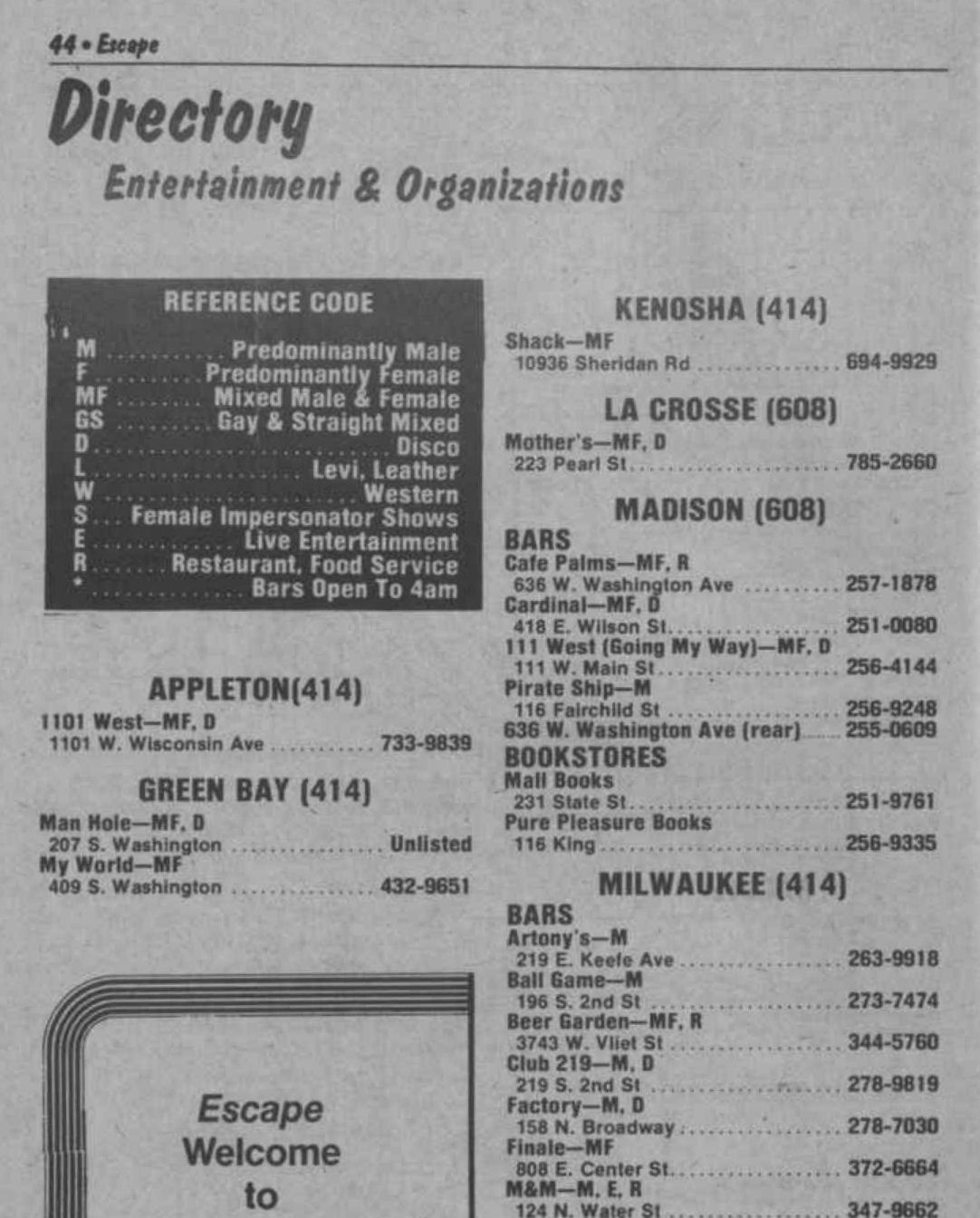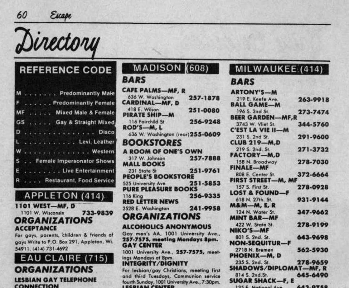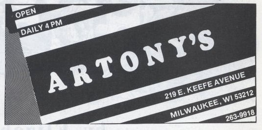 The bar bought advertisements in the publication 'GPU News' starting in the August 1980 issue through that publication's final issue of January 1981 (the identical ad image in all those issues, see image to right). It was then listed in the Directory of 'Escape' magazine (from November 1981 to July 1982) and then 'Escape' newspaper (May-July 1983). Although a new gay publication named 'In Step' appeared in Milwaukee in February 1984, it never listed Artony's in its business Directory.