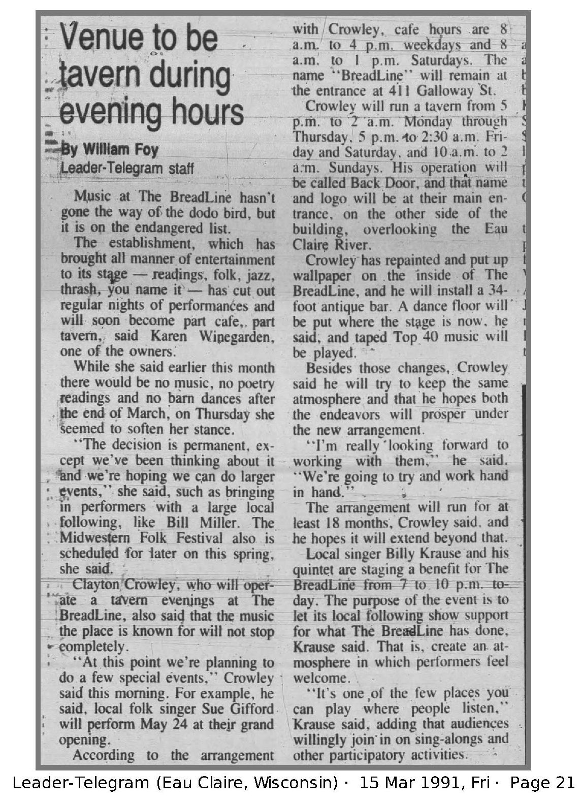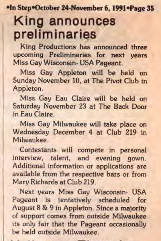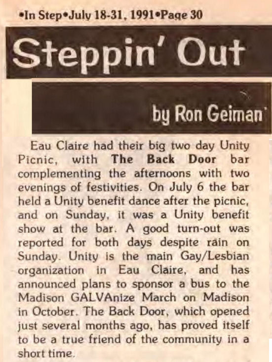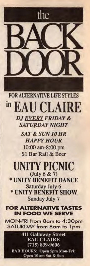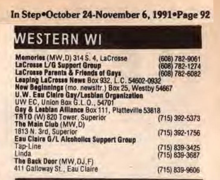 In 1990 Eau Claire, there was a cafe/restaurant/music venue called the Breadline that wasn't doing too well. A man named Clay Crowley, who had worked as a bartender at Downtown Express, offered to help the Breadline with the rent if he could use the place as a bar at night. Thus on March 1st, 1991 the "Back Door" opened as a gay bar: there was a sign on the front with the original business name (Breadline), while the rear door faced a public parking lot. The 'Back Door' began to appear in the Guide of the state's primary LGBT periodical, 'In Step' magazine, in issue 8-12 (June 20, 1991). The bar must have found some success, and by April 1992 Clay Crowley had taken over the lease and held a "name the bar" contest- with the winning name being 'Scruples', that name first appearing in 'In Step' magazine's Guide starting in the August-September 1992 issue (vol. 9-17). Listings for the bar in the state's LGBT media took some time to be updated; for a time, the business was listed twice, under both the new and old bar names (see examples below). The last listing as "Back Door' was in the Guide of 'In Step' magazine in issue 10-07 (April, 1993). As of April 2022, an LGBT bar continues to operate in this space-- since 1996 under the name Scooters. More information about this business is welcome from anyone who can contribute same. |