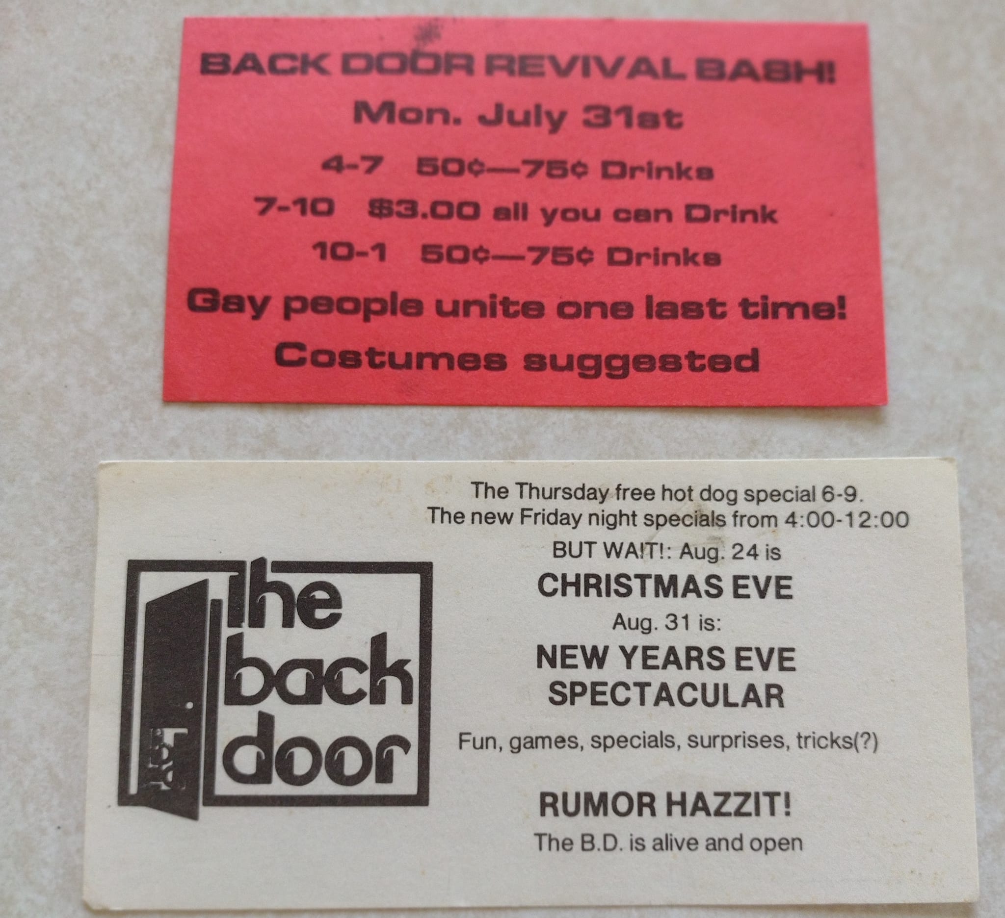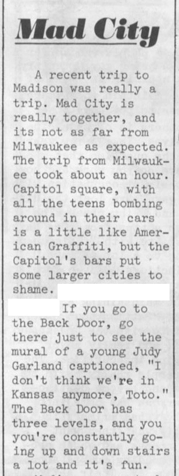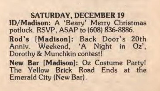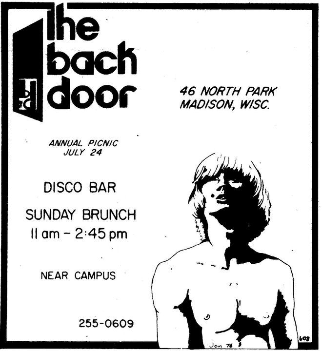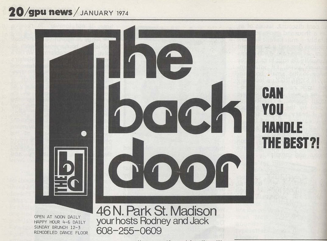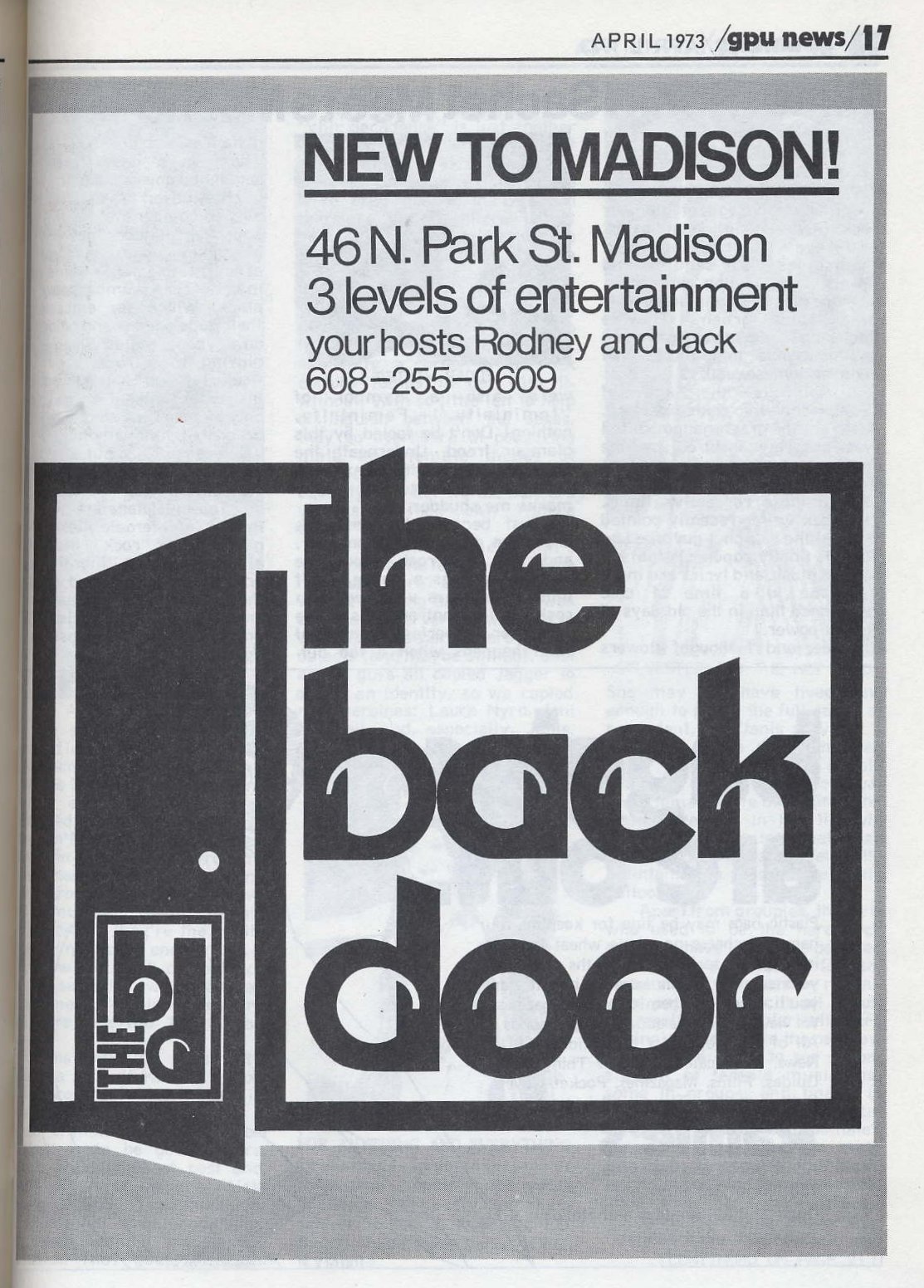 The April 1973 issue of GPU News advertised the opening of the Back Door bar with an ad, "New to Madison! The Back Door", touting "3 levels of entertainment" and listing proprietors Rodney and Jack. According to a bio of Rodney Scheel years later, the bar went through "its share of experimental phases- bar, restaurant, piano bar, dance club, and home-away-from-home for many of the newly-liberated Gay men and Lesbians and their friends of that era". The bar held an employee/customer appreciation party in 1973, which in 1977 became a city-wide fundraiser for Madison LGBT organizations known as the MAGIC Picnic. (MAGIC was an acronym for 'Madison Area Gay Interim Committee'.) The MAGIC picnic ran at least into the early 2000's. Meanwhile, 1977 was to be a year of transition in more ways than the MAGIC Picnic. In July 1977, a larger gay bar, Going My Way, opened. According to a later posting in a Facebook group, "When the larger 'Going My Way' on West Main Street opened, much of the dance crowd stopped going to the Back Door." For whatever reason, by October 1977 invitations went out for a "Good Bye To OZ" week at the Back Door, from October 24 to 30, and an invitation-only final evening party on Monday October 31. Two years later, Rodney Scheel would open Madison's legendary bar of the 1980's and 1990's: Rod's in the Hotel Washington, which was to become an LGBT landmark housing at three LGBT businesses: 2 bars and a cafe. Twenty years later, the Back Door was still a fond memory for Rodney: in December 1992, the Hotel Washington held a grand re-opening, culminating in a "20th Back Door anniversary party" (see ad below). More information about this business is welcomed from anyone who can contribute it.