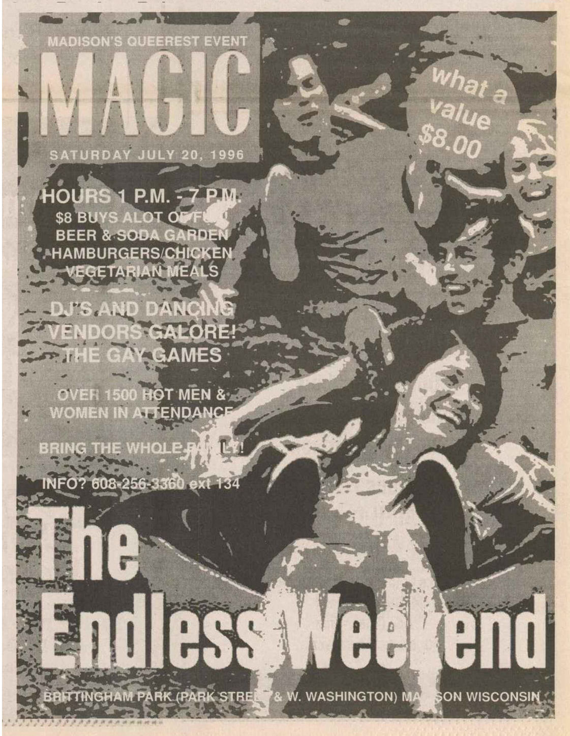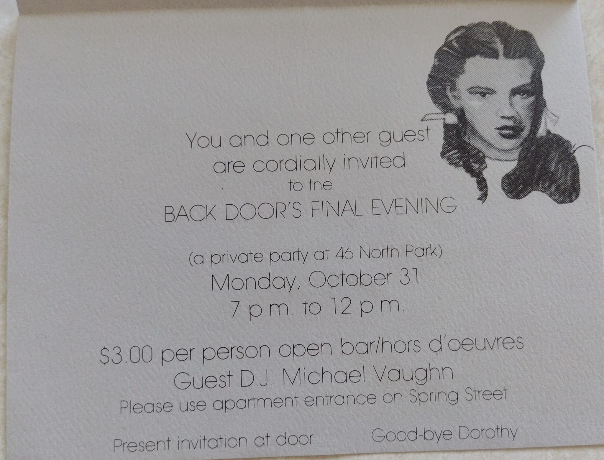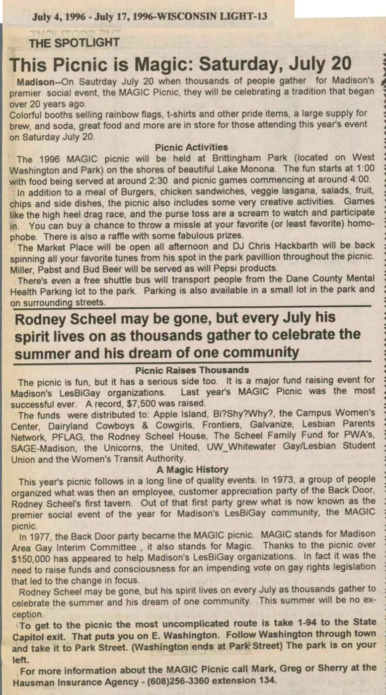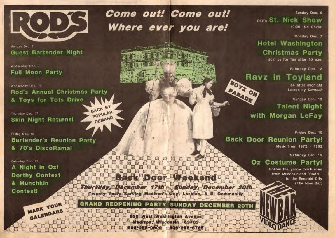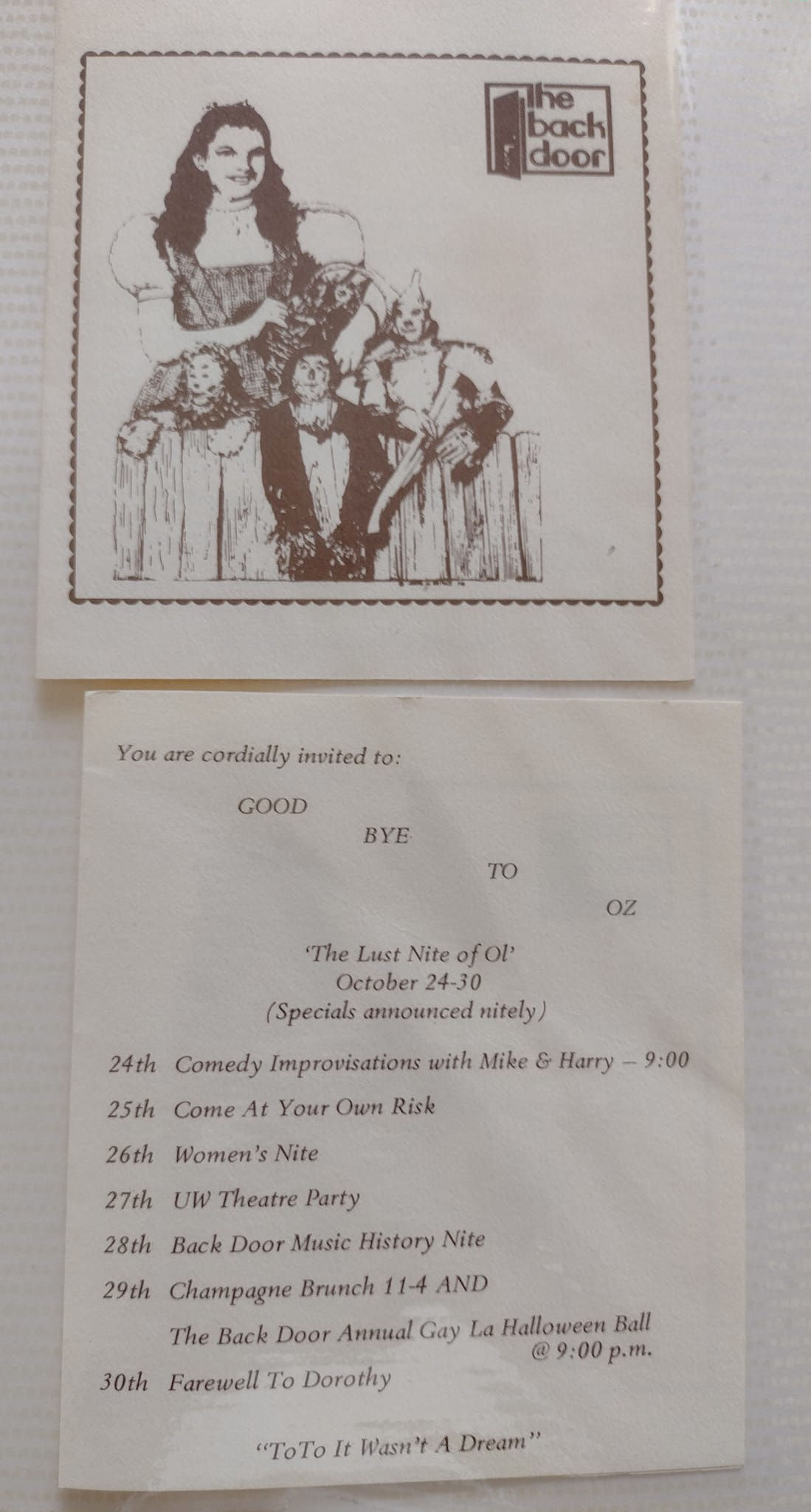 The April 1973 issue of GPU News advertised the opening of the Back Door bar with an ad, "New to Madison! The Back Door", touting "3 levels of entertainment" and listing proprietors Rodney and Jack. According to a bio of Rodney Scheel years later, the bar went through "its share of experimental phases- bar, restaurant, piano bar, dance club, and home-away-from-home for many of the newly-liberated Gay men and Lesbians and their friends of that era". The bar held an employee/customer appreciation party in 1973, which in 1977 became a city-wide fundraiser for Madison LGBT organizations known as the MAGIC Picnic. (MAGIC was an acronym for 'Madison Area Gay Interim Committee'.) The MAGIC picnic ran at least into the early 2000's. Meanwhile, 1977 was to be a year of transition in more ways than the MAGIC Picnic. In July 1977, a larger gay bar, Going My Way, opened. According to a later posting in a Facebook group, "When the larger 'Going My Way' on West Main Street opened, much of the dance crowd stopped going to the Back Door." For whatever reason, by October 1977 invitations went out for a "Good Bye To OZ" week at the Back Door, from October 24 to 30, and an invitation-only final evening party on Monday October 31. Two years later, Rodney Scheel would open Madison's legendary bar of the 1980's and 1990's: Rod's in the Hotel Washington, which was to become an LGBT landmark housing at three LGBT businesses: 2 bars and a cafe. Twenty years later, the Back Door was still a fond memory for Rodney: in December 1992, the Hotel Washington held a grand re-opening, culminating in a "20th Back Door anniversary party" (see ad below). More information about this business is welcomed from anyone who can contribute it.