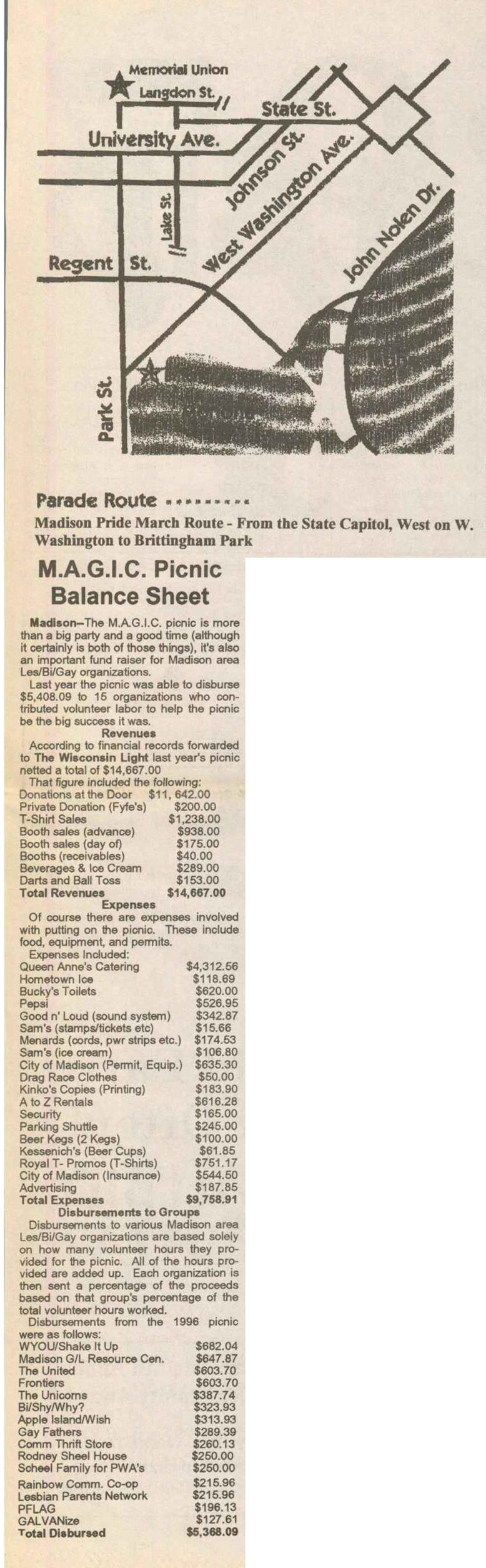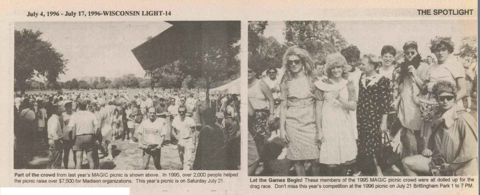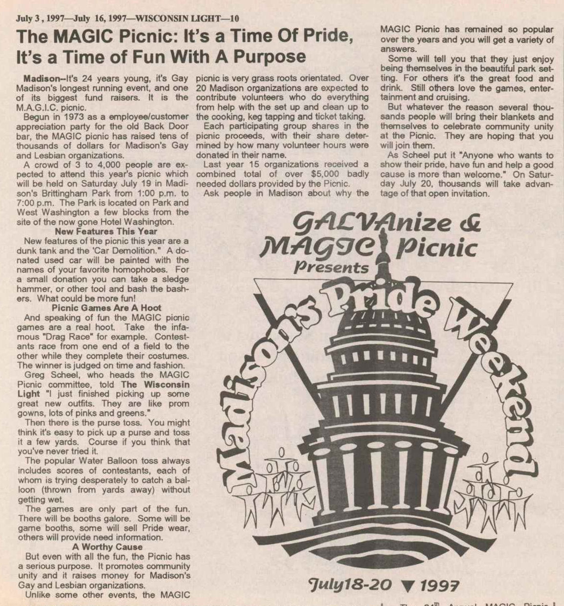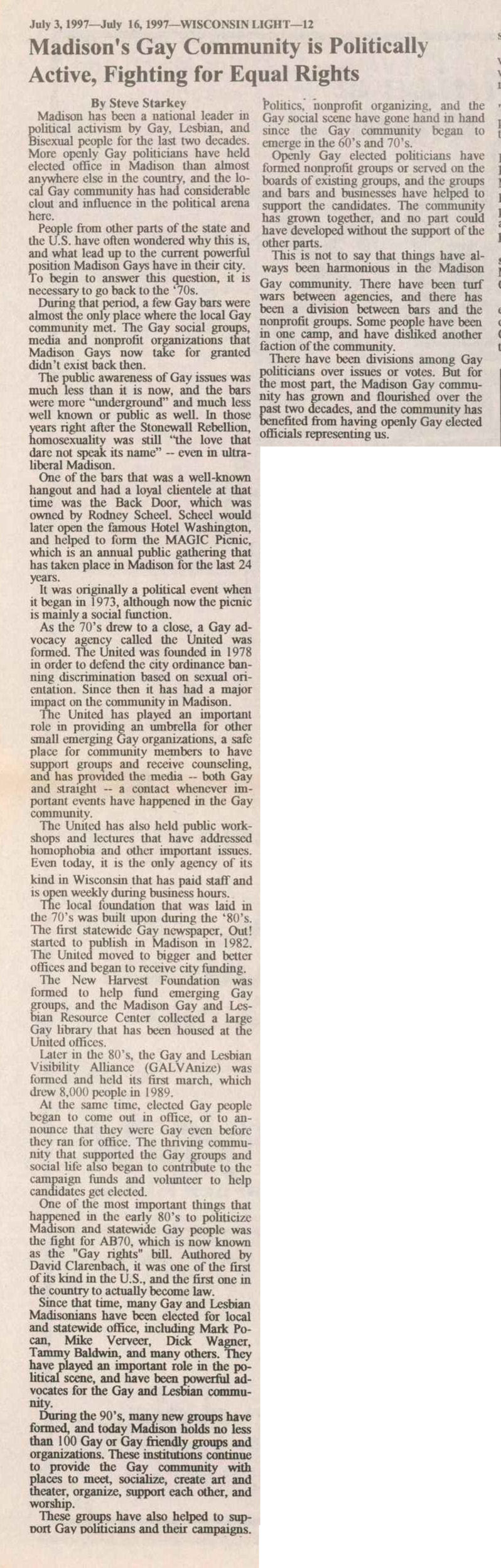 The April 1973 issue of GPU News advertised the opening of the Back Door bar with an ad, "New to Madison! The Back Door", touting "3 levels of entertainment" and listing proprietors Rodney and Jack. According to a bio of Rodney Scheel years later, the bar went through "its share of experimental phases- bar, restaurant, piano bar, dance club, and home-away-from-home for many of the newly-liberated Gay men and Lesbians and their friends of that era". The bar held an employee/customer appreciation party in 1973, which in 1977 became a city-wide fundraiser for Madison LGBT organizations known as the MAGIC Picnic. (MAGIC was an acronym for 'Madison Area Gay Interim Committee'.) The MAGIC picnic ran at least into the early 2000's. Meanwhile, 1977 was to be a year of transition in more ways than the MAGIC Picnic. In July 1977, a larger gay bar, Going My Way, opened. According to a later posting in a Facebook group, "When the larger 'Going My Way' on West Main Street opened, much of the dance crowd stopped going to the Back Door." For whatever reason, by October 1977 invitations went out for a "Good Bye To OZ" week at the Back Door, from October 24 to 30, and an invitation-only final evening party on Monday October 31. Two years later, Rodney Scheel would open Madison's legendary bar of the 1980's and 1990's: Rod's in the Hotel Washington, which was to become an LGBT landmark housing at three LGBT businesses: 2 bars and a cafe. Twenty years later, the Back Door was still a fond memory for Rodney: in December 1992, the Hotel Washington held a grand re-opening, culminating in a "20th Back Door anniversary party" (see ad below). More information about this business is welcomed from anyone who can contribute it.