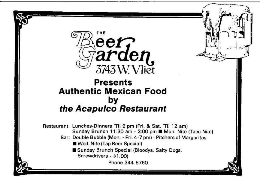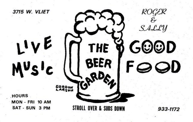 Recollections: The following are recollections of others who have been kind enough to submit their personal memories to the webmaster. You are welcome to do the same! The Beer Garden - Reminded me of a typical Milwaukee Tavern. They had great Sunday brunches. R Chris