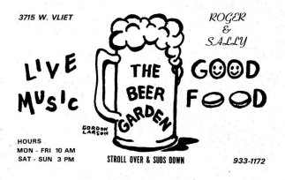 The Beer Garden was a mainstay of Milwaukee's gay life in the 1970's and 1980's. Although widely considered primarily a lesbian bar, it also attracted a strong men's presence. The original proprietors were Roger and Sally, and they opened the original bar at 3715 W. Vliet. Late in 1971 or early in 1972, bar advertising changed to read 3743 W. Vliet, possibly because it took over additional space next door. The Beer Garden held numerous dances and special events, contests, and particiapted in sports leagues, most notably hosting softball teams each year. The Beer Garden also served great food. The August 1976 issue of the local "GLIB Guide" describes the business as follows: "Mostly gals bar with lots of guys reinforcing the crowd. Cozy canopied bar. Great Sunday brunch." In 1986, an ad appeared stating that "After 20 years of serving the Milwaukee Gay and Lesbian community, Roger & Sally pass on the Beer Garden Tradition to New Owners". A "change of ownership" party on July 20, 1986 ushered in the new owners: Carole, Gloria & Sandy. Unfortunately, the end came in March 1989. 'In Step' magazine vol. 6-06 (March 1989) reported in the "Steppin' Out" column that the Beer Garden had closed within the previous two weeks. A "Beer Garden Reunion" party was held at Loose Ends bar in March 1993, to celebrate the famous and long-popular Beer Garden bar and restaurant which had closed 3 years earlier. More information about the Beer Garden is welcome from anyone who can contribute it.