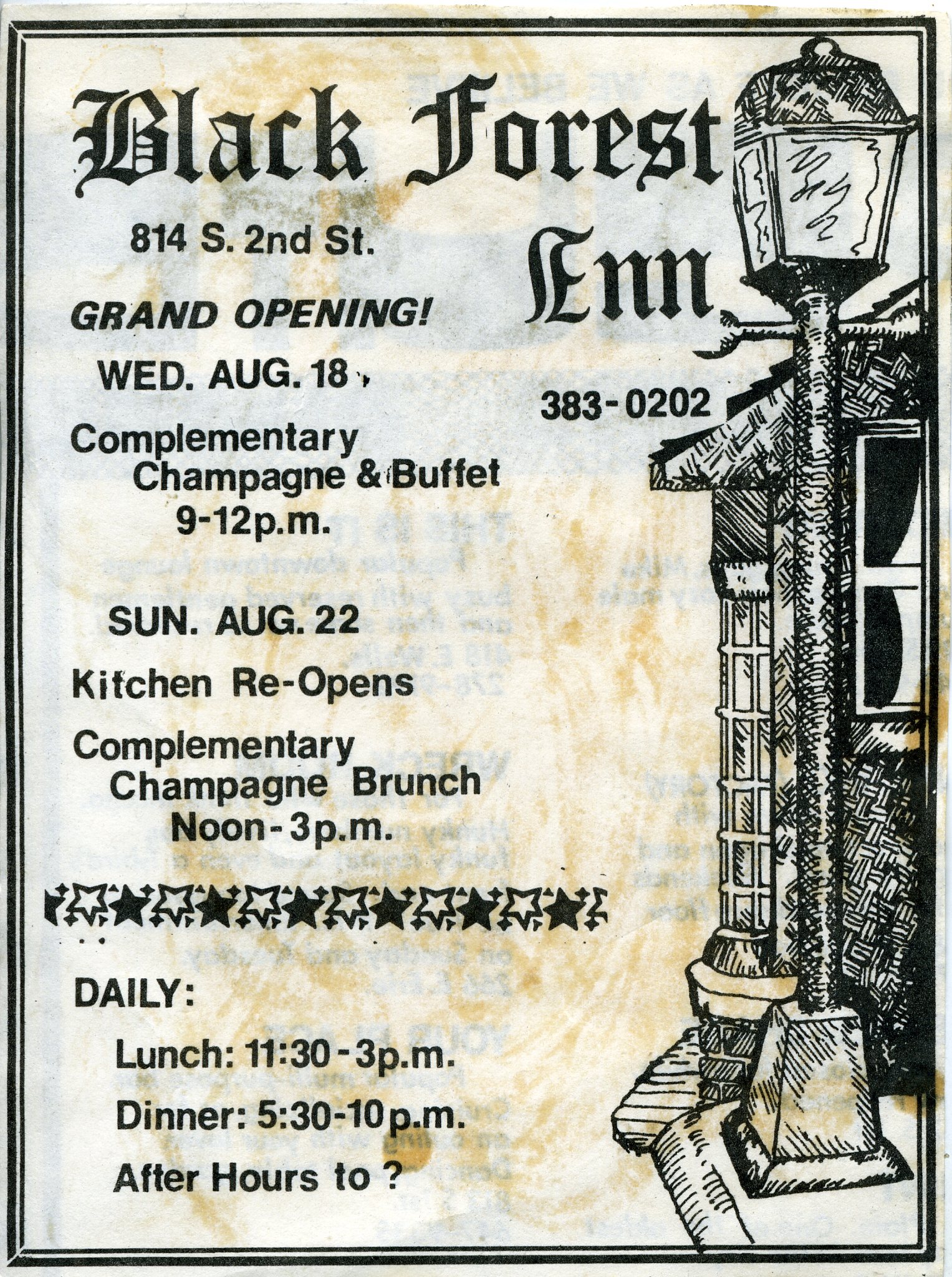 Black Forest Inn was owned by two lovers, and was a bar with an excellent reataurant as well. The Black Forest first advertised in the September 1976 issue of the GPU News. The ad describes the ambience the owners created within the bar/ restaurant: "Return to yesteryear; enjoy an evening of fine food and drinks on the streets of Old Milwaukee". This is a good description: the decor featured tree trunks and branches, and various memorabilia and collectibles in cases from the Black Forest region of Europe/ Germany. The August 1976 issue of the local "GLIB Guide" describes the business as follows: "Novel idea, bar in the streets of Old Milwaukee. After hours restaurant. May really catch on as word spreads." The bar is fondly recalled by the author for a comfortable and relaxed atmosphere, offering good drinks and excellent food. More information about this business is welcomed from anyone who can contribute it. |