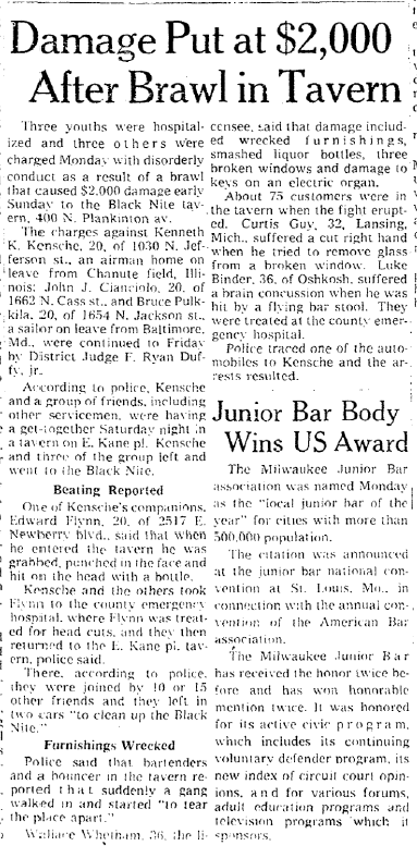 In 1960, Wally Whetham reopened what had been known as "Mary’s Tavern" (and before that the "Old Mill Inn") as "the Black Nite" to celebrate its gay customers. Patrons remember a more protective police presence than at other bars. On a Saturday night, August 5, 1961, Black Nite was the scene of a sensational bar brawl. When a serviceman was thrown out of the bar, he returned with friends, looking for a fight. They found 74 customers ready and willing to defend their turf. "My boyfriend was a bouncer," said Josie Carter, "and we did not run from a fight. We didn’t start anything, but we sure as hell finished it. I could fight an Army off in a bathrobe." That 'bar brawl' is documented in an article by Michail Takach in OnMilwaukee. A general summary of the facts reads as follows: The Black Nite wasn’t just a tavern that tolerated homosexuals; it was, from the start, a tavern that embraced and welcomed them. Wally Whetham, a twice-married man with children, became well-known for creating a safe and generous space for his customers. All sexual and gender expressions were welcome– something extremely rare to find in mid-century Milwaukee– and customers were fiercely protective of their turf. That fierceness made itself known on Saturday, Aug. 5, 1961. After partying at a Kane Place tavern, four 20-year-old 'straight' servicemen decided to check out the Black Nite on a dare. Despite being asked several times, they refused to show any identification to the bouncer and wound up being forcibly removed. One of the servicemen would later claim that he was grabbed, punched and hit on the head with a bottle for no reason. But that’s not exactly what happened. "We didn’t start anything, but we sure as hell finished it," said Josie Carter in 2011. "Those guys only came down there to cause trouble. When (the bouncer) tried to kick them out, they all tried to fight him. And I thought, 'Oh no, you’re not going to hurt MY husband.' I went out there with a beer bottle in each hand, ready to knock some heads. "This man turned on me. I thought, I can’t let him put his hands on me. He was big, and he kept coming at me. I thought he would kill me. In that moment, I could fight off an army in a bathrobe. I let him have everything that was in that bottle. He went down." The servicemen fled the bar, took their injured friend to the County Emergency Hospital and went back to the Kane Place tavern. They rounded up a dozen men and decided to go back Downtown and "clean up the Black Nite." Wally Whetham later reported that "this gang came in and started tearing the bar apart, and the bar fought back." Earlier that night, the servicemen had found a nearly empty bar and a 4-1 fight against the bouncer. This time, they found a packed bar of 75 patrons ready and willing to defend their turf by any means necessary. The battle didn’t last long, but it was intense: One patron suffered extreme lacerations when he was thrown through a broken window; another patron experienced a brain concussion when he was hit in the head with a barstool. He would remain in critical condition for weeks after the brawl. In the end, over $2,000 in losses were reported, including the bar’s entire bottled liquor inventory, an electric organ, a jukebox and all windows. While Whetham and his patrons cleaned up the carnage, the four servicemen were charged with disorderly conduct. Unfortunately, homophobic Judge Christ T. Seraphim later dismissed their charges due to "lack of evidence." Many of Milwaukee's earliest gay rights activists spoke about how the Black Nite Brawl inspired them. It was a call to arms for many community leaders, including Eldon Murray and Alyn Hess, founders of Gay People's Union. It was also the first time they saw a Milwaukee gay bar mentioned in the newspaper. Like many men of their generation, they sought out news stories mentioning gay people and places throughout their childhoods, only to find negative indictments of gay people as "criminals," "perverts" or "sexual deviates." For the gay rights generation, the Black Nite offered a glimmer of hope and a spark of revolution. View the Eldon Murray Papers online at UWM by Clicking Here. The Black Nite brawl haunted the property for months, affecting the bar’s business and reputation, and Whetham was urged by the Common Council to change the business name in order to keep his liquor license. The Black Nite relaunched as Bourbon Beat from late in 1961 to 1966, when the building was torn down for the extension of St. Paul Avenue. (The same owner also later opened Captain's Cabin gay bar, which closed amid a scandal.) That 'bar brawl' is more fully documented in this Event page. On August 5, 2021, the Black Nite was commemorated by the County Board, County Executive, City Council, Mayor and Governor at a press conference on the 60th anniversary of the Brawl on the former site of the building. In 2022 the brawl was recognized as an historical event and the site as a landmark by the Milwaukee County Landmarks Committee. In 2023 an official state Historical Marker was created by the Wisconsin Historical Society as the state's first LGBTQ-related marker. The marker was erected on the 63rd anniversary of the brawl (August 5, 2024) across the street from the site. (The actual site is now partly in the footprint of the St. Paul Avenue, and the land is slated for construction of a new restaurant- and thus the location across the street was deemed a more suitable location for the time being.) (A book, "LGBT Milwaukee" by Michail Takach, seeks to make the story of LGBT Milwaukee accessible, visible, and portable for future generations--before it is too late. The Black Nite is one of many early LGBT landmarks documented in the book.) |