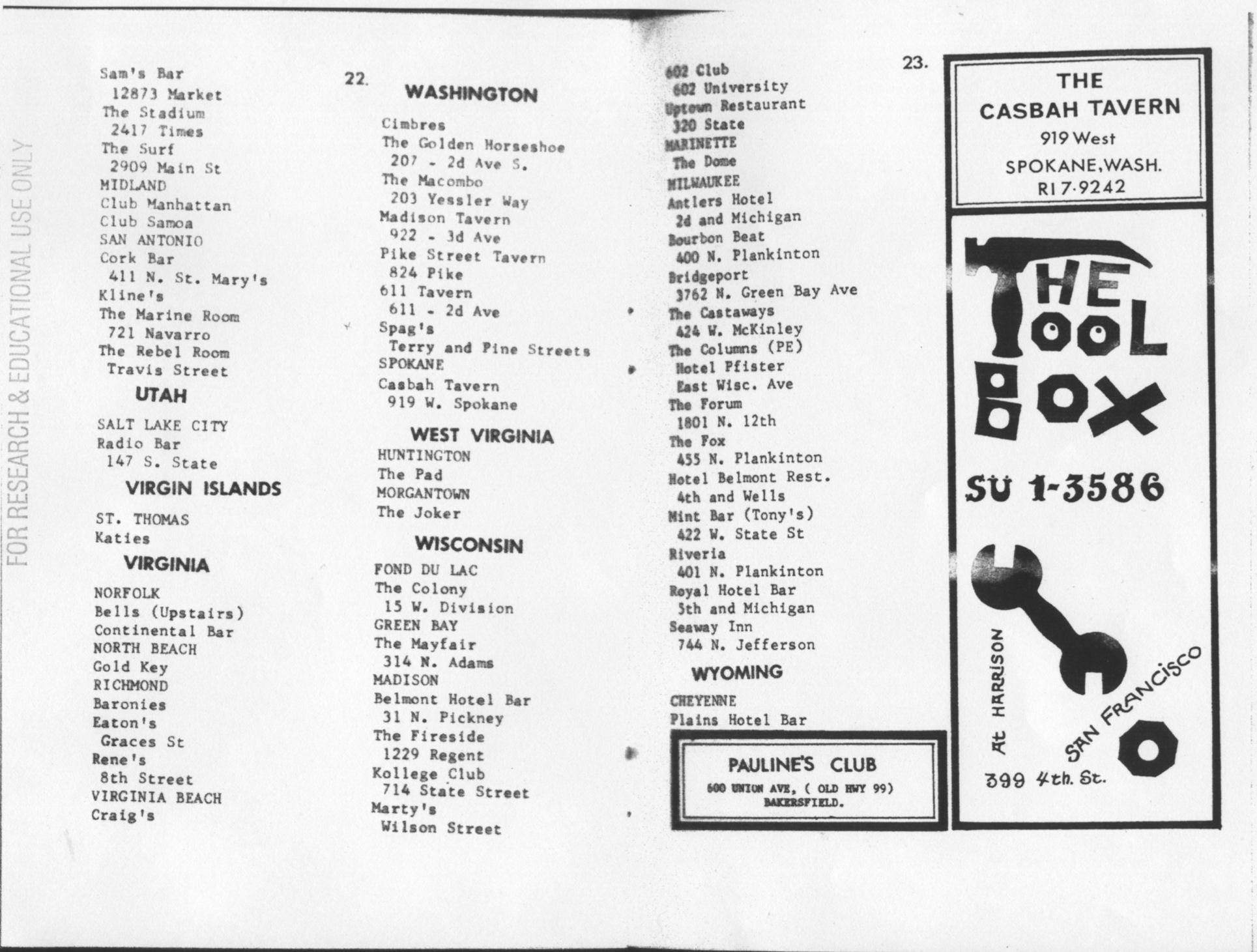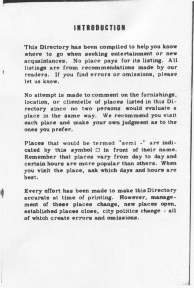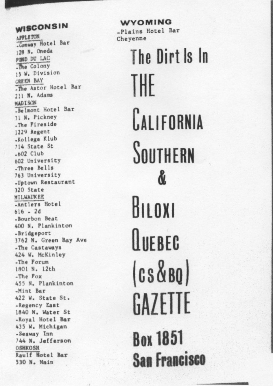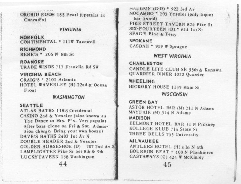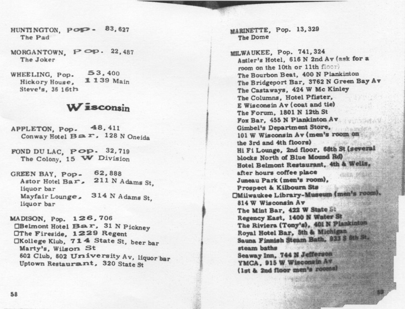 The Bourbon Beat is listed in several national 'Gay Bar Guides' from 1963 to 1966. Research has determined that the bar had previously been known as Black Nite, once a fairly openly 'gay' bar. But the Black Nite's reputation had been marred by an incident in 1961, so a new name was mandated by the Milwaukee Common Council in order to keep its liquor license. That 'incident' was Milwaukee's version of 'Stonewall', eight years before that more famous New York City incident. (See the Black Nite page for details.) After successfully relaunching the controversial Black Nite as the "Bourbon Beat", operator Wally Whetham moved his bar to the nearby corner of 2nd Street and Florida, and opened the "Captain's Cabin" at 400 N. 2nd St. Meanwhile, the building at 400 N. Plankinton was torn down in 1966 for the extension of St. Paul Avenue. More information about this business is welcomed from anyone who can contribute it.
