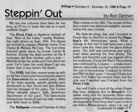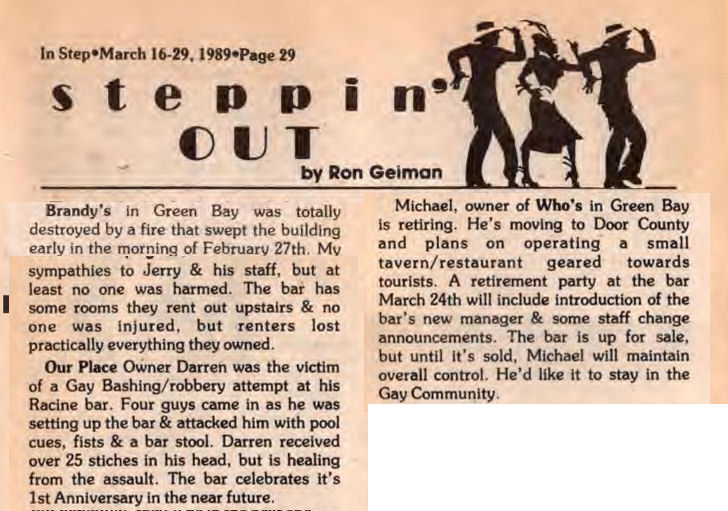 Brandy's, a Green Bay country/leather/levi bar, was owned by Jerry Hoffman and Duane. Unfortunately, a fire totally destroyed "Brandy's" bar early in the morning of February 27, 1989. A new location was found and owner Jerry Hoffman opened the new location in May 1989 as Brandy's II. The history of LGBT bars in Northeastern Wisconsin was the subject of an excellent article in the Green Bay Press Gazette in 2020. More information about this business is welcome from anyone who can contribute same. |