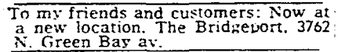 The Bridgeport is known primarily from being listed in several national 'Gay Bar Guides' from 1962 to 1966. Through extensive research, just two local references have been found thus far. First, a 'personal ad' has been located from August 1962 reading: "To my friends and customers: Now at a new location. The Bridgeport, 3762 N. Green Bay av.". We have no information yet on where the bar moved from or why. Finally, advertisements have been found offering the vacant tavern and apartment for immediate rental from December 15-18, 1964. More information about this business is welcomed from anyone who can contribute it.