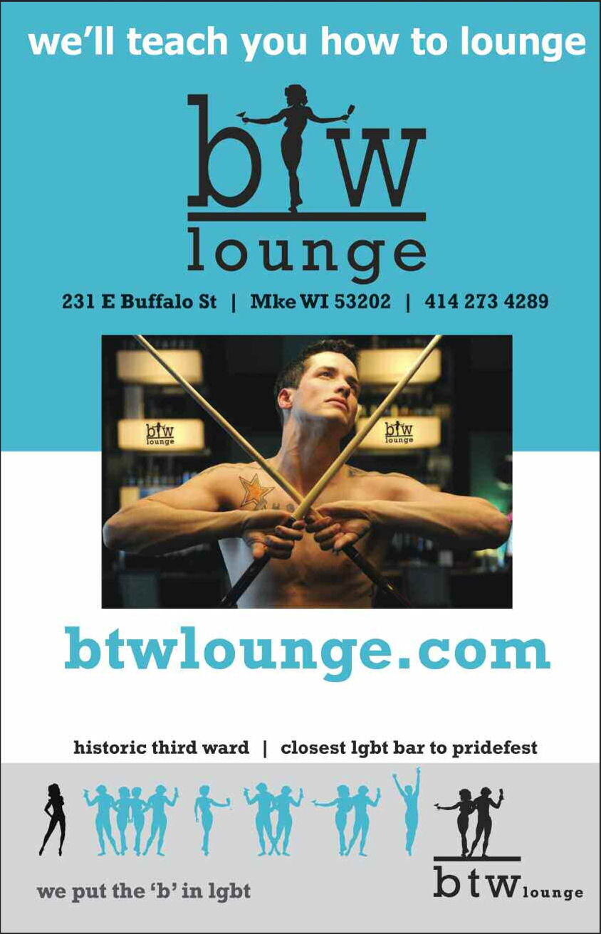 Early on, it wasn't always clear what kind of place BTW wanted to be: was it a gay bar? was it a straight bar? Like other short-lived bars of this era, BTW didn't really declare itself immediately. By summer 2011, BTW was advertising intermittently in LGBT media 'the Wisconsin Gazette' and 'Quest'. BTW was also listed in their nightlife directories. But the ads were often confusing: one invites customers to wear jean short cut-offs and tank tops; another advertises classier events like a Kentucky Derby party, a WhiteStar men's fashion show, and a poetry slam.