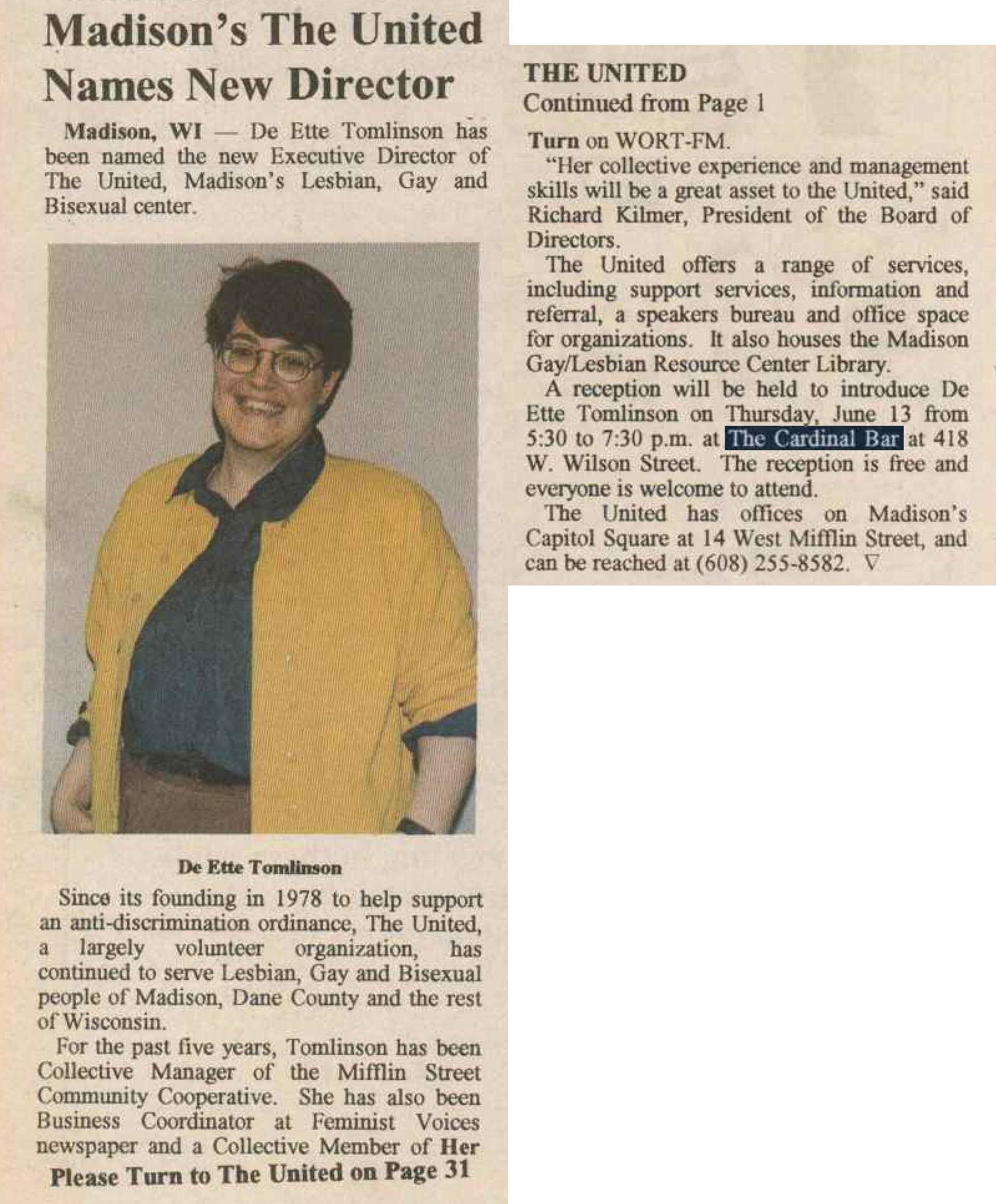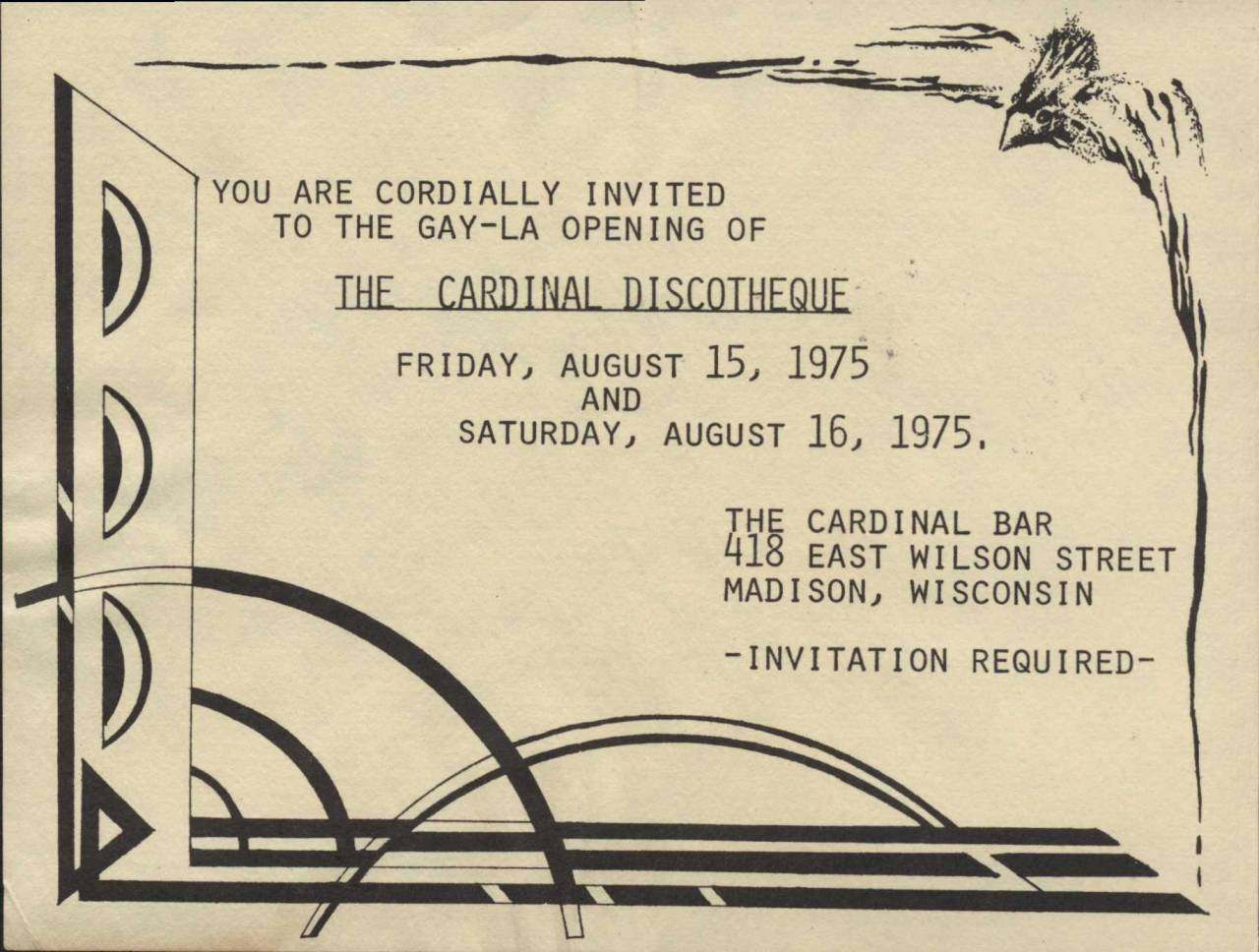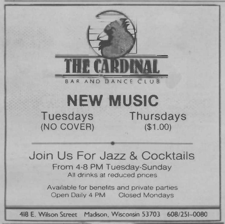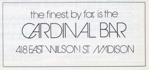 The Cardinal Bar became known as that "funky little dance bar with a jukebox in the back." In August 1975, it became Madison's first real disco: "The Cardinal Discotheque".