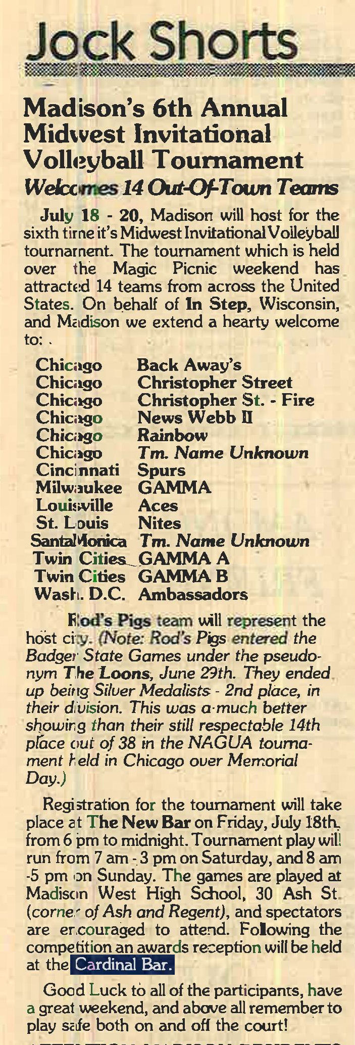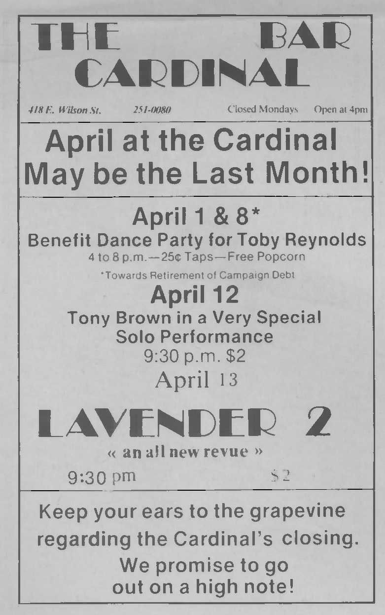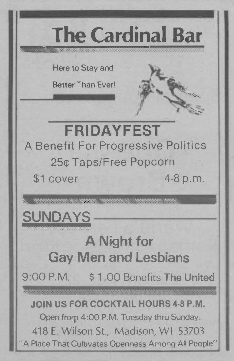 Opened in 1975 by Ricardo Gonzalez, The Cardinal Bar was for many years THE dance bar for Gay Madison. Opened in the space that once housed the original restaurant, the long wooden bar and mirrored backbar was considered one of the finest in Madison, and original mosaic floor was especially memorable. During the first half of the 1980's, Rod's bar was the best gay men's bar in Madison; but for high energy dancing, people often started the evening at The Cardinal Bar.