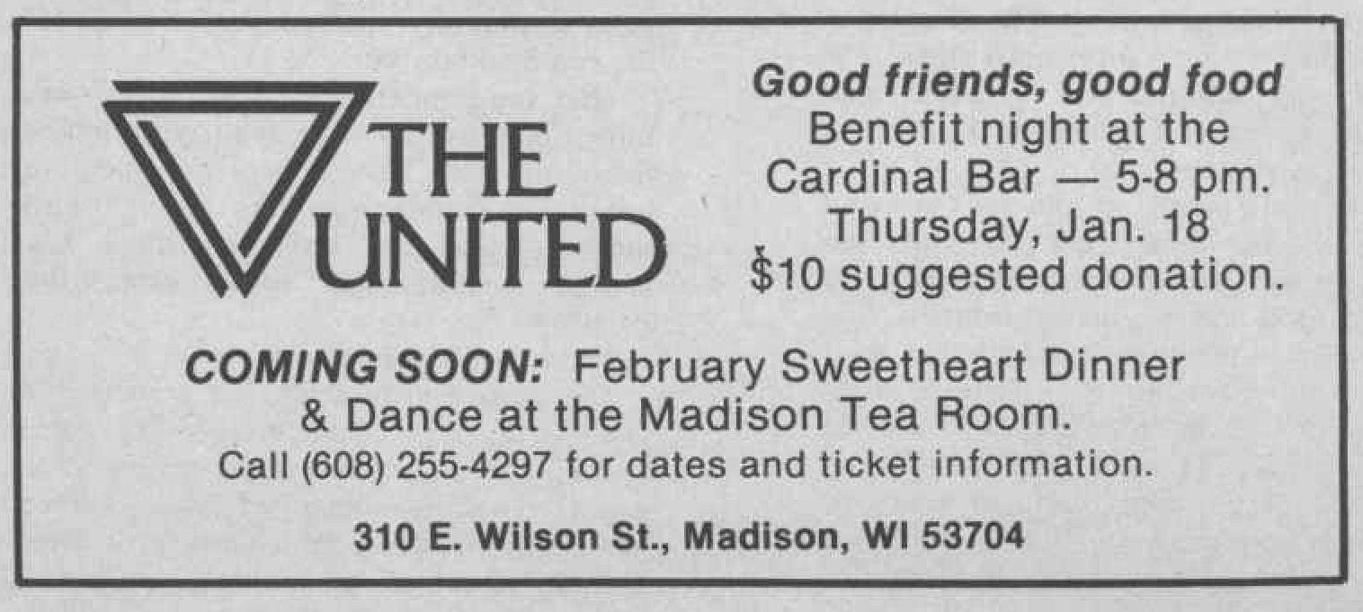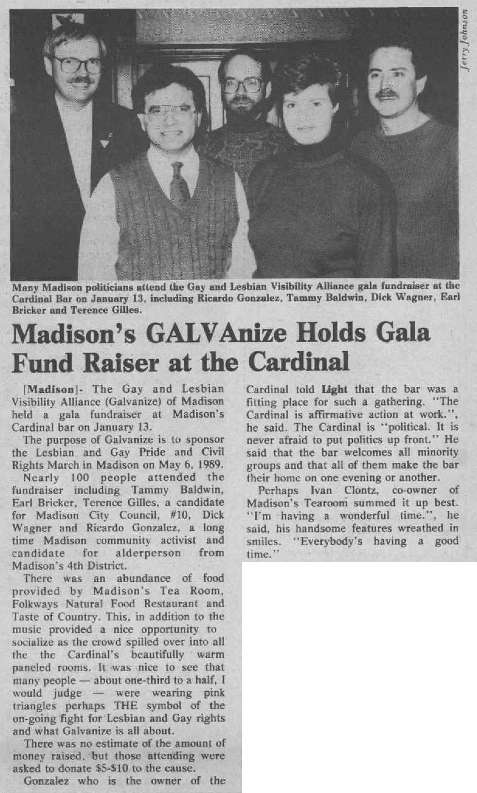 In May 1974, Gonzalez toured the aging Cardinal Hotel (418 E. Wilson St.) He signed a lease, redecorated Skid Row chic with ferns and mirrors, traded dining for dancing, and reopened the Cardinal Bar as Madison's first Latin gay bar in December 1974.
