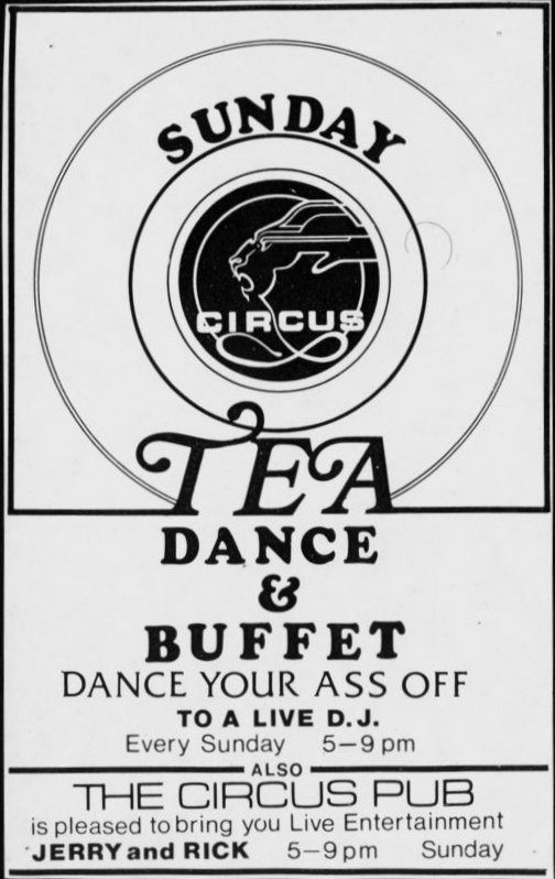 The Planet Circus began advertising in July 1976 as "Milwaukee's Newest and Finest Disco". It was the boom disco years, and patrons of the Factory were both excited and skeptical about the opening of another disco/ dance club. This same location had in the previous 12 months held 2 other bars, another disco dance bar called Gary's Dance Club from June to August 1976, then Mister Z's. This venture was that of two men, George Prentice and Jim Seeboth. But Circus was here to stay, and was a smash success (although there were frequent name adjustments, to variations of "Circus": from Planet Circus, it became Club Circus, Circus-Circus, and simply Circus). The August 1976 issue of the local "GLIB Guide" describes the business as follows: "Near to the Oregon House, a new disco called Circus-Circus is also open for business. What was formerly Gary's and Mr. Z's has enlarged the bar slightly and improved the decor. Female disc-jockeys are also featured." The Guide in the same issue sums it up: "Lively nightly crowd jams newly-refurbished den. Young. Disco your body up; lounge down; drinks in the middle." In October 1978 the bar took out a 2-page advertisement explaining a transfer in ownership: George Prentice and Jim Seeboth had sold the business to managers Mike and Rick, and it would re-open on Wed. November 1st as "Club Circus". Club Circus advertised for about 6 months, but after an ad in the July-August issue of "Milwaukee Calendar", the bar stopped advertising and disappeared from LGBT bar media. (Starting in August 1980, a new bar "Trash" began advertising in the same location, and that bar quickly morphed into "Club 219". See the Club 219 page for information about this bar's later years.)