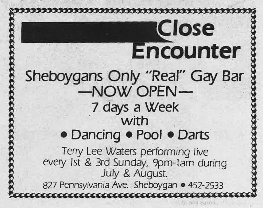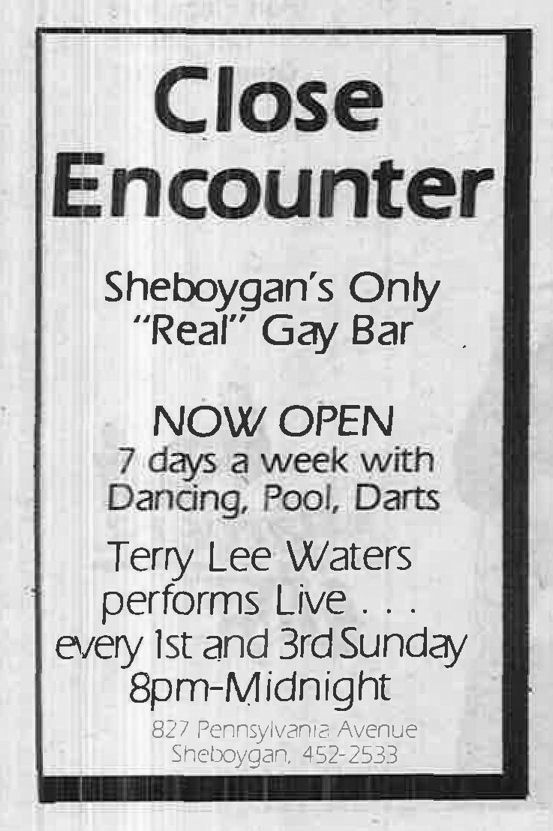 Close Encounter advertised as "Sheboygan's Only 'Real' Gay Bar" when it opened in June 1986, being welcomed in In Step's "Steppin' Out" column in the June 26-July 9, 1986 issue. But the bar was short-lived. It was last listed in In Step's "Guide" in the December 1986 issue. More information about this business is welcomed from anyone who can contribute it. |