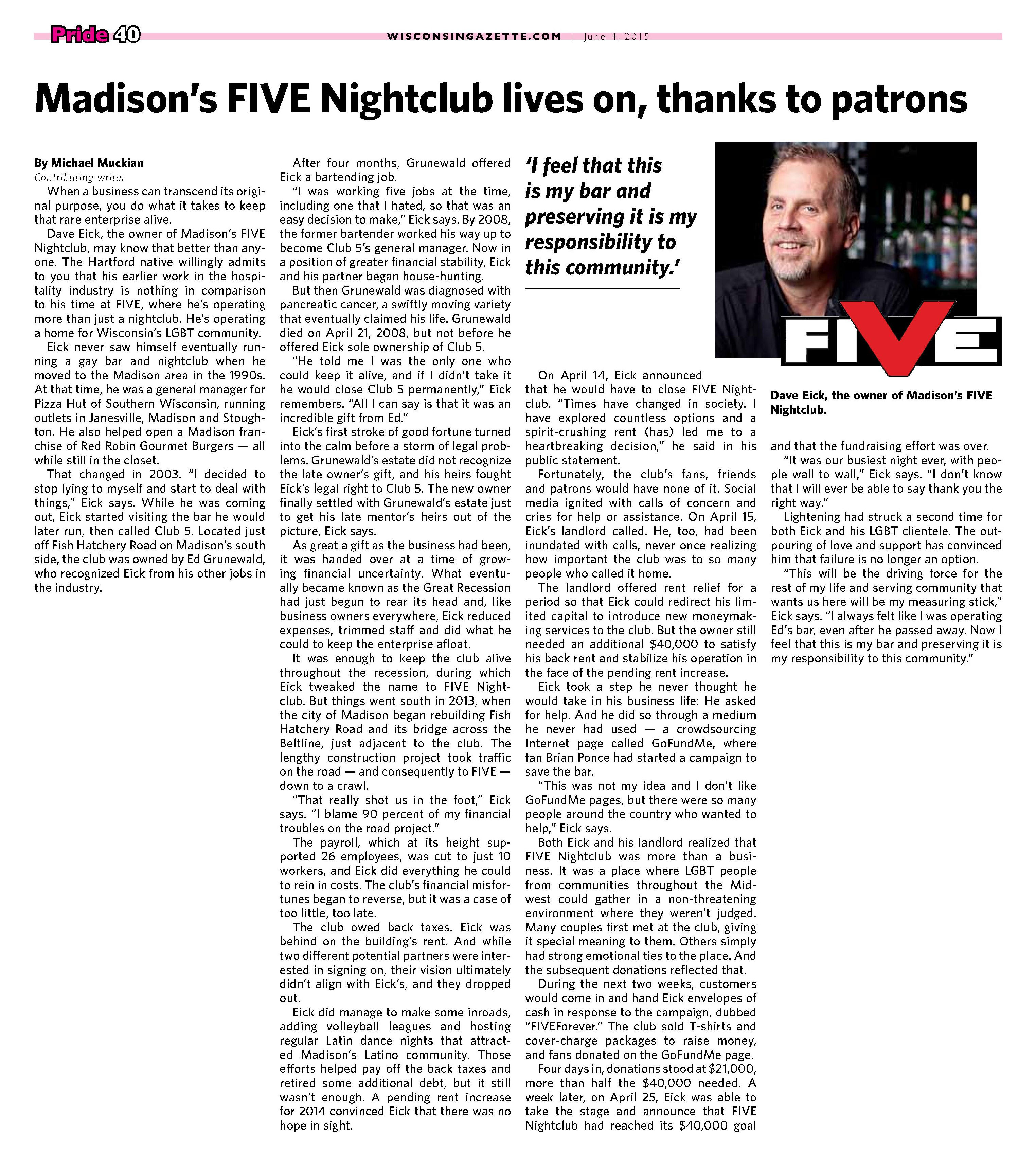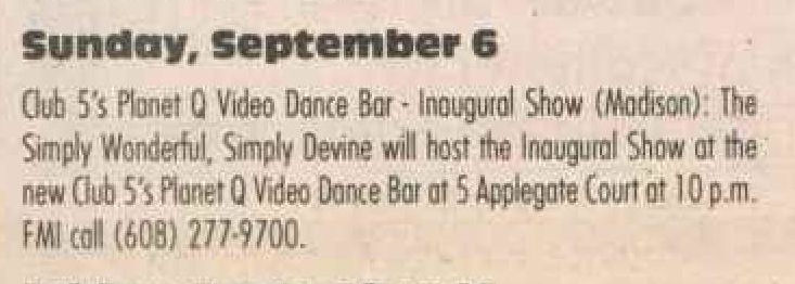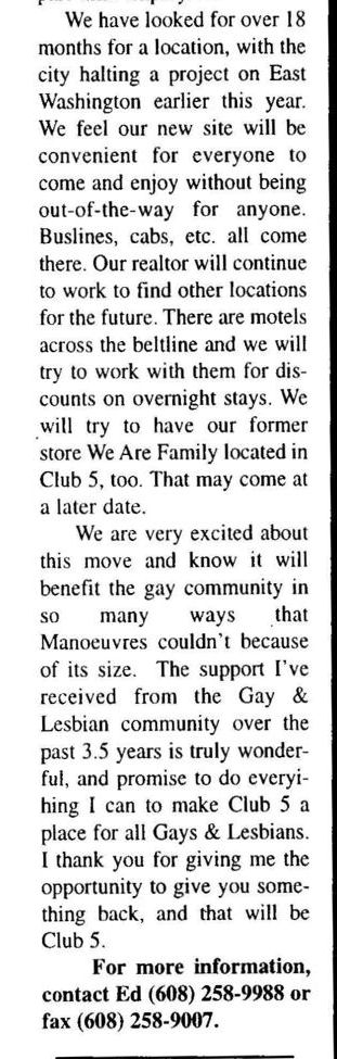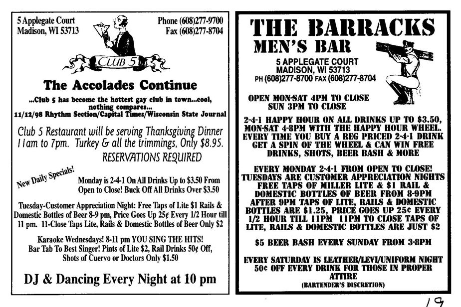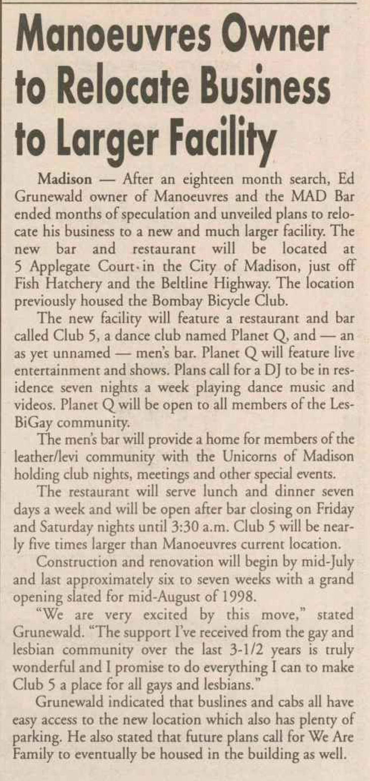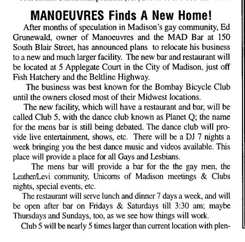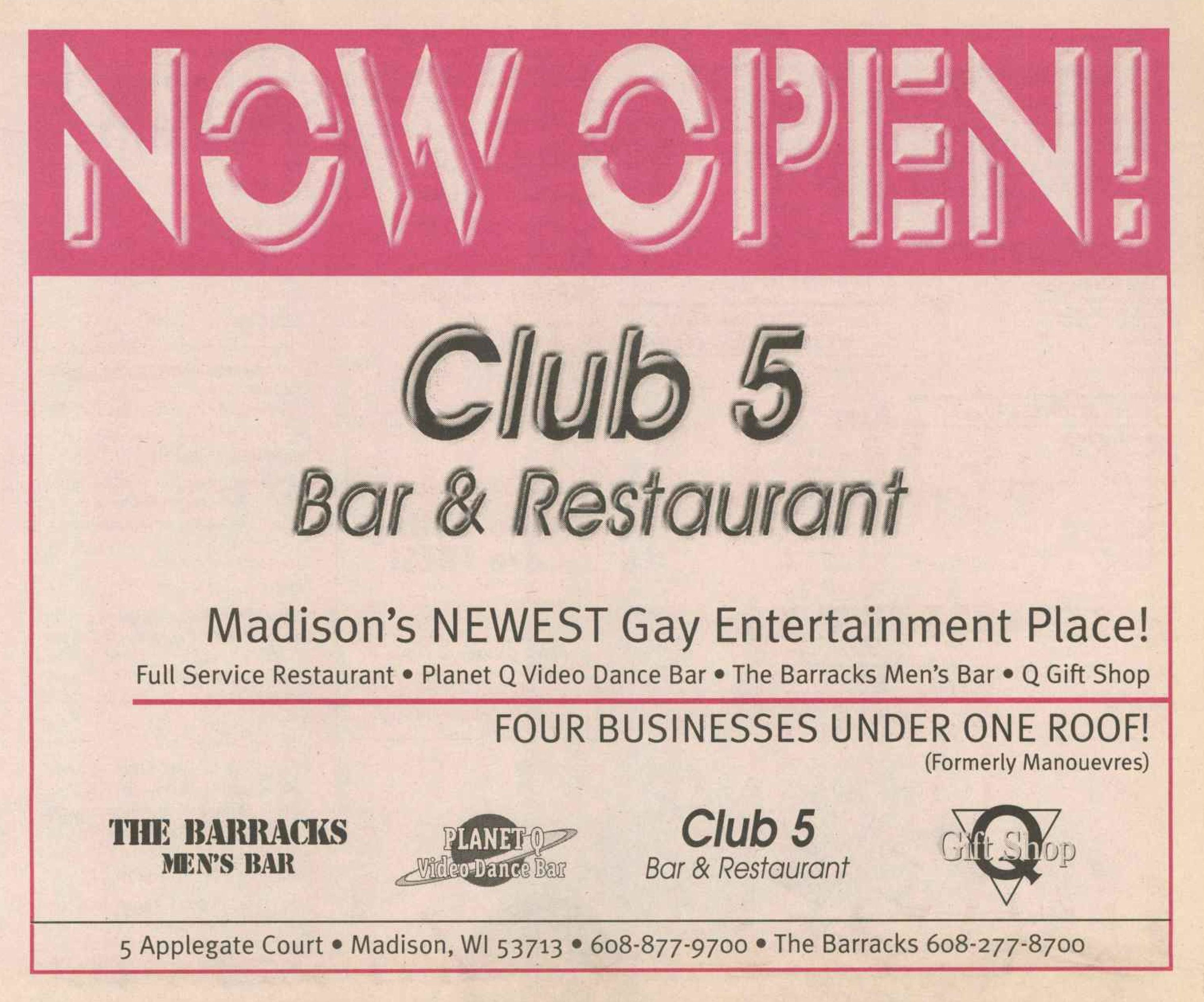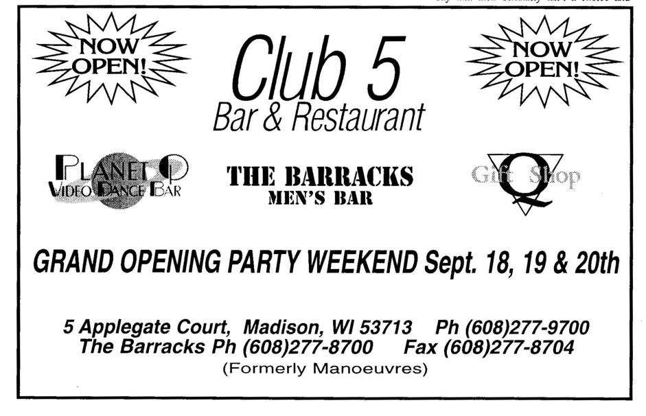 The Club 5 Complex was opened by Ed Grunewald as a replacement for his 'Manoeuvres' bar, which needed more room for expansion. He created a large complex of several separate serving bars, a restaurant, and outside space for volleyball etc. From the beginning, the business had three separate identities within the building, specifically: Club 5 restaurant and Bar: The major portion of the space was a DJ area and large dance floor area with a couple of bars. The "full service restaurant... serves lunch, dinner and Fri./Sat. after hours". Barracks: Men's bar, rustic setting. A place for the Levi/Leather community, Unicorns of Madison meetings and club nights, special events, etc. Always had many guys in jeans and t-shirts, or often shirtless. At times showed X-rated/ 'Adult' movies. Planet Q Video Dance Bar: with pool tables, dart boards, etc. Early ads also mentioned a "Q Gift Shop". And in April 1999, Ed added The Fox Hole womyn's bar to the building. Club 5 came about largely to fulfill a desperate need. During the 1980s and the first half of the 1990s, the main LGBTQ bars in the Madison area were Rod's (levi/ leather bar), the New Bar (dance bar), and the Cafe Palms restaurant-- all located in the Hotel Washington building. But early in 1996, a fire destroyed that entire building, and Madison's LGBTQ community needed gathering places to replace those facilities. The next largest bar to the 'New Bar' was Manoeuvres bar-- but even it wasn't large enough for all the new customers looking for a replacement to New Bar, Rod's, and Cafe Palms. Thus the Manoeuvres owner looked to expand his business space to meet that need. For its first ten years, business was great. 'Club 5' was Madison's primary dance venue and the complex was Madison LGBTQ community's 'place to be', with its restaurant, drag shows and contests, a separate bar (Barracks) for levi/ leather men, and an outside patio for drinks, dining, and a sand volleyball court. In 2007, bartender Dave Eick, a Hartford native now living in Madison and working in the restaurant industry, was promoted to general manager of Club 5. Shortly after, owner Ed Grunewald was diagnosed with a swiftly moving form of pancreatic cancer- and he offered Eick sole ownership of the business. Grunewald died April 21, 2008. While Grunewald's heirs did not originally recognize the legality of the gift, Eick eventually settled and had sole ownership of the business. But it was soon to be the beginning of some difficult times. First, the recession of 2008 took its toll, when staff and expenses had to be cut back. Eick added some events and made some changes to the bar's image. For example, in August 2011, a Facebook post stated: "Brand new Absolut Lounge/dance floor put in, one of many renovations the owner has done. If you haven't been here in a while it's worth checking out again! Madison's true LGBT hot spot!" In May 2012, Eick and his life partner Matt Couper tweaked the name to simply "FIVE Nightclub", although many LGBT periodicals continued to list the bar as "Club 5" in their bar directories. According to an article in Isthmus.com: "The south-side venue rechristened last week as Five Nightclub & Showbar, formerly Club 5, has a new dance floor, stage and sound system. That's not all: Totally dismantled is the Barracks, a backroom leather bar that for years played porn on six screens and served as a refuge for gay men behind boarded-up windows." "These changes are not merely cosmetic. Promos advertising the May 16 grand opening made a point of calling Five an "environment where everyone is welcome." The club's new tagline is "step up, and step out, Madison!" "The Barracks was a tough one to let go, (Eick) says, but necessary. On a practical level, it was a relic of a time when men needed bars to hook up... the Barracks (had) provided the sense of privacy now readily available online." Then in 2013, the city of Madison began rebuilding Fish Hatchery Road and its bridge across the Beltline, just adjacent to the club. The lengthy construction project took traffic on the road-- and to FIVE-- down to a crawl. Still struggling to recover from the 2008 recession and the costs incurred in the 2012 remodeling, expenses continued to pile up and the bar fell behind in taxes and rent. In 2014 a rent increase loomed, and the bar was on the verge of closing: on April 14, 2014, Eick announced the bar would soon be closing permanently. Madison's LGBTQ community wasn't ready to lose its largest gathering place, and a fan of the bar started a crowdsource fundraising campaign. By April 25, 2014 Eick was able to announce that FIVE Nightclub had been saved, by a combination of funds raised from the community, as well as temporary rent relief from the building owner. It looked like FIVE was destined to live on, and five busy and relatively successful years saw its business gradually rebuilding. But the difficult times weren't over yet. In February-March 2020, the COVID-19 pandemic hit, and the bar (along with millions of other bars, restaurants and other businesses around the world) was temporarily forced to close in March 2020 to reduce the spread of the disease. When it reopened around July 2020, legal capacity was temporarily greatly reduced and customers had to remain seated with social distancing and face mask use by staff and customers enforced. Through the Thanksgiving, Christmas and New Years holidays, crowds were essentially banned and (like all bars) the ambiance was subdued. COVID restrictions were gradually reduced, and around June 1, 2021, mask use by those vaccinated was often lifted (at the discretion of management) and capacity limits raised back to pre-pandemic levels. FIVE had survived the pandemic-- but many bars and restaurants across the country had been forced to close permanently, having been unable to sustain a year or more of no or greatly reduced business. Even such national gay bar landmarks as The Stonewall and Julius' in New York City had nearly gone 