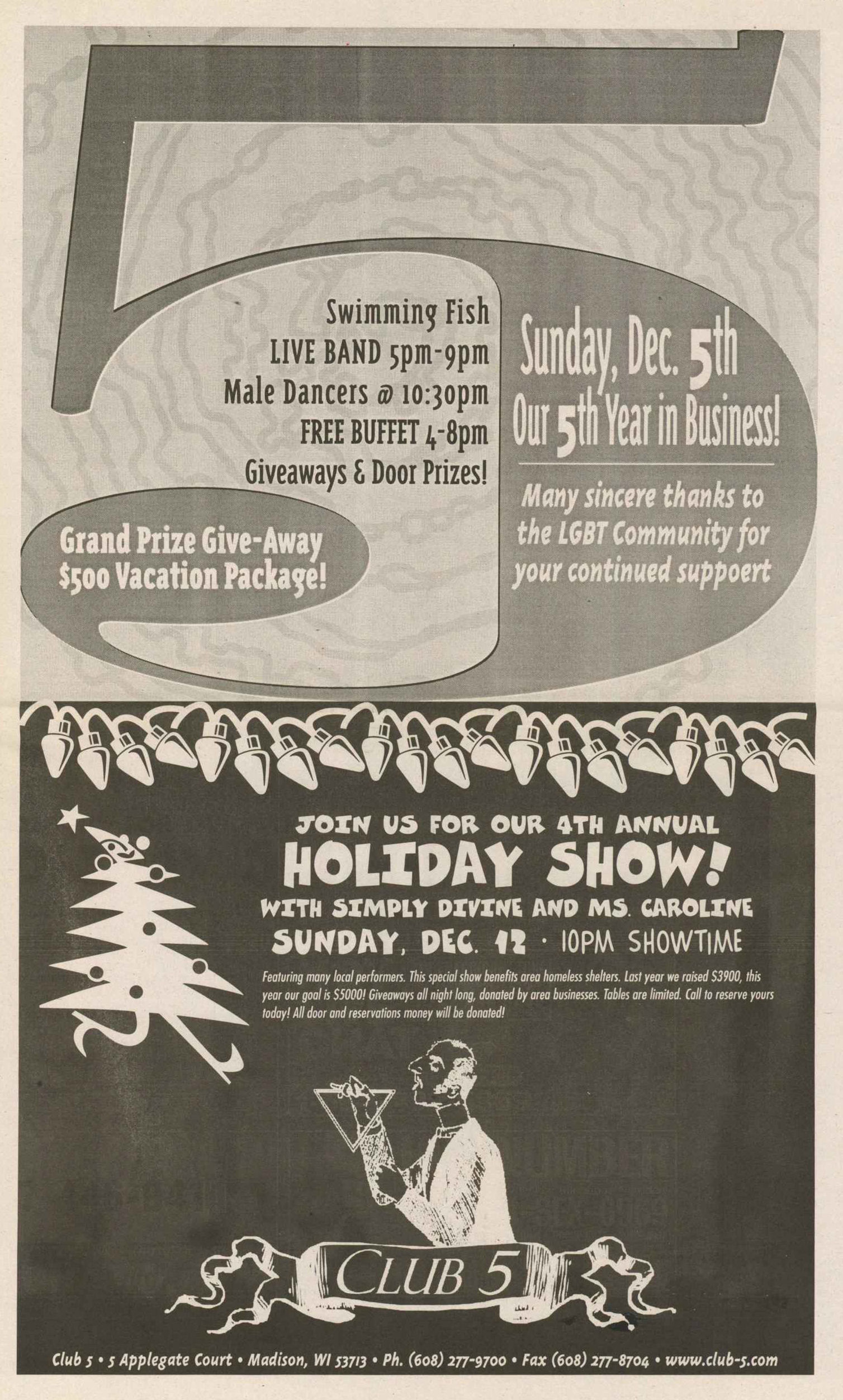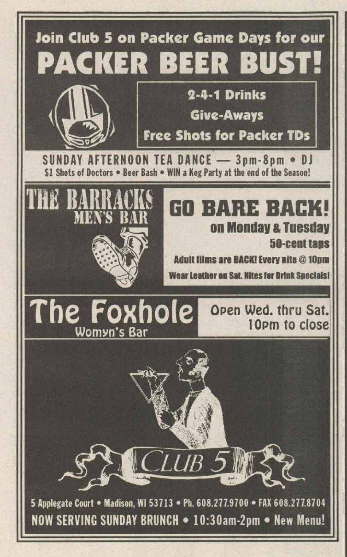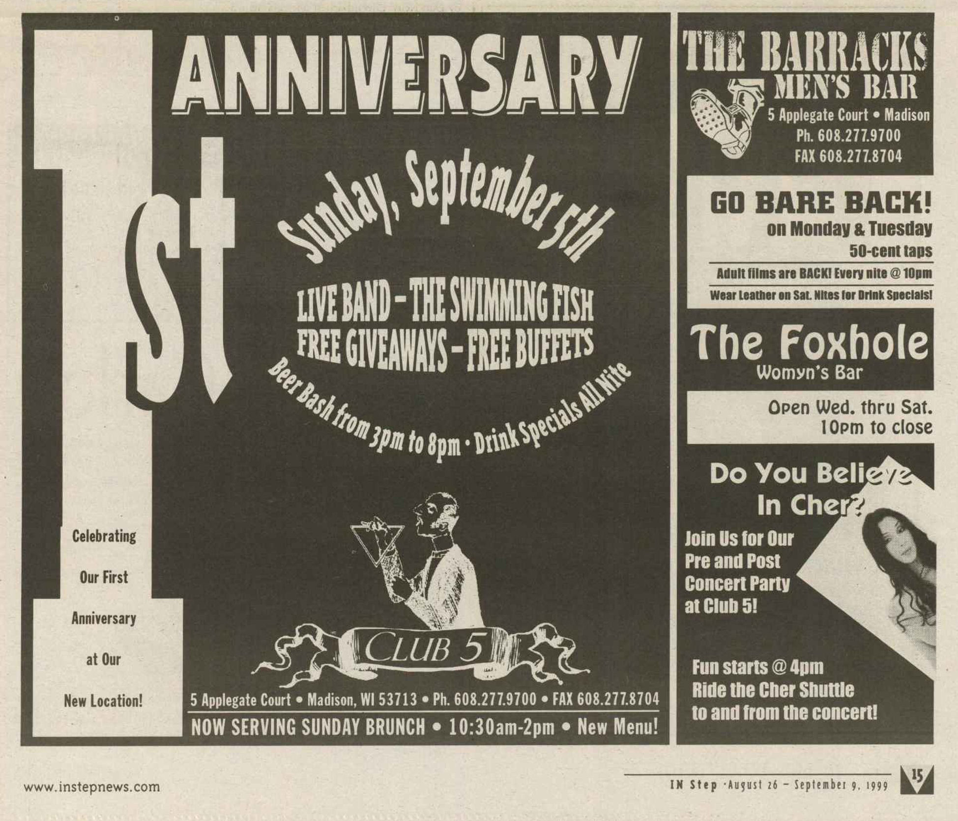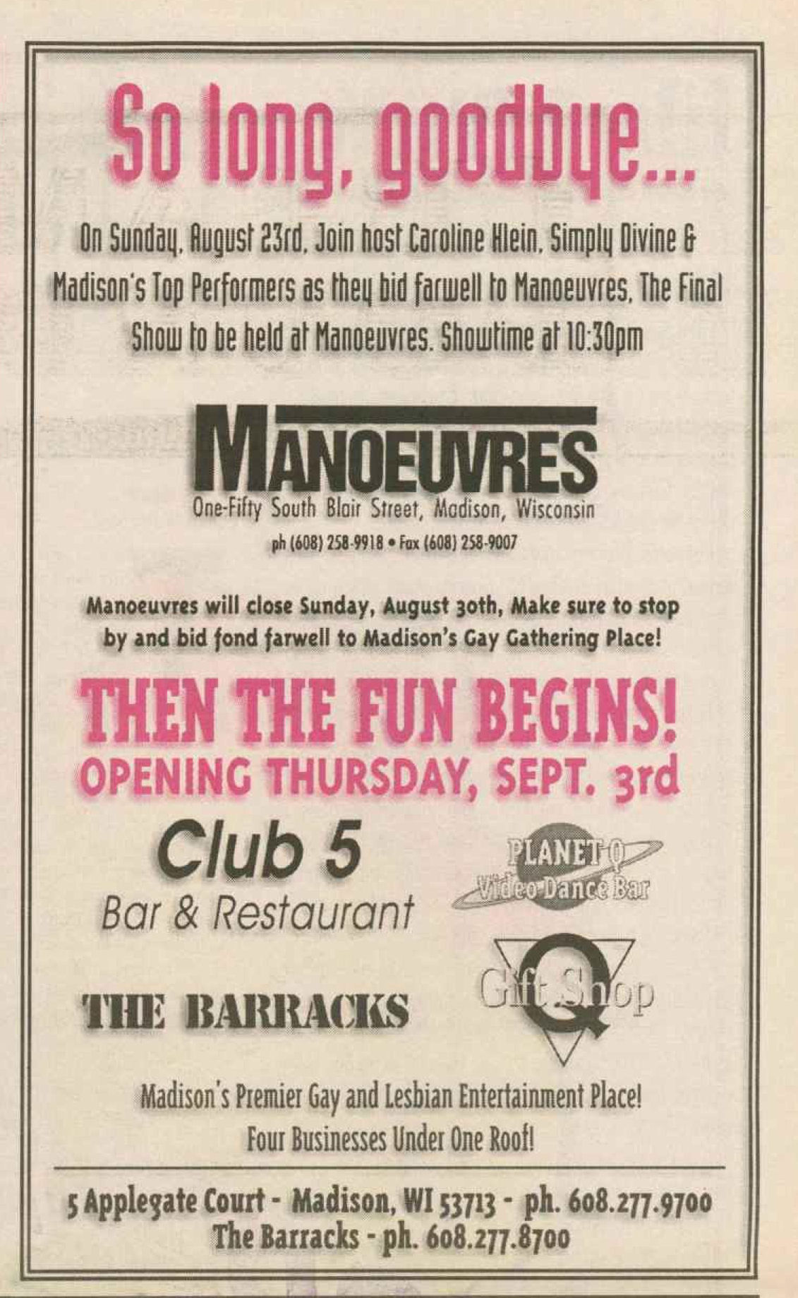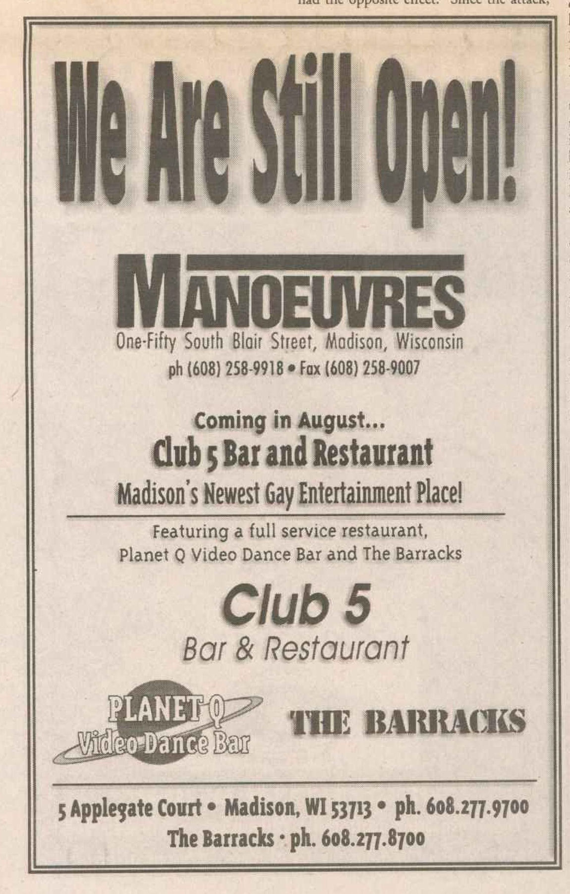 The Club 5 Complex was opened by Ed Grunewald as a replacement for his 'Manoeuvres' bar, which needed more room for expansion. He created a large complex of several separate serving bars, a restaurant, and outside space for volleyball etc. From the beginning, the business had three separate identities within the building, specifically: Club 5 restaurant and Bar: The major portion of the space was a DJ area and large dance floor area with a couple of bars. The "full service restaurant... serves lunch, dinner and Fri./Sat. after hours". Barracks: Men's bar, rustic setting. A place for the Levi/Leather community, Unicorns of Madison meetings and club nights, special events, etc. Always had many guys in jeans and t-shirts, or often shirtless. At times showed X-rated/ 'Adult' movies. Planet Q Video Dance Bar: with pool tables, dart boards, etc. Early ads also mentioned a "Q Gift Shop". And in April 1999, Ed added The Fox Hole womyn's bar to the building. Club 5 came about largely to fulfill a desperate need. During the 1980s and the first half of the 1990s, the main LGBTQ bars in the Madison area were Rod's (levi/ leather bar), the New Bar (dance bar), and the Cafe Palms restaurant-- all located in the Hotel Washington building. But early in 1996, a fire destroyed that entire building, and Madison's LGBTQ community needed gathering places to replace those facilities. The next largest bar to the 'New Bar' was Manoeuvres bar-- but even it wasn't large enough for all the new customers looking for a replacement to New Bar, Rod's, and Cafe Palms. Thus the Manoeuvres owner looked to expand his business space to meet that need. For its first ten years, business was great. 'Club 5' was Madison's primary dance venue and the complex was Madison LGBTQ community's 'place to be', with its restaurant, drag shows and contests, a separate bar (Barracks) for levi/ leather men, and an outside patio for drinks, dining, and a sand volleyball court. In 2007, bartender Dave Eick, a Hartford native now living in Madison and working in the restaurant industry, was promoted to general manager of Club 5. Shortly after, owner Ed Grunewald was diagnosed with a swiftly moving form of pancreatic cancer- and he offered Eick sole ownership of the business. Grunewald died April 21, 2008. While Grunewald's heirs did not originally recognize the legality of the gift, Eick eventually settled and had sole ownership of the business. But it was soon to be the beginning of some difficult times. First, the recession of 2008 took its toll, when staff and expenses had to be cut back. Eick added some events and made some changes to the bar's image. For example, in August 2011, a Facebook post stated: "Brand new Absolut Lounge/dance floor put in, one of many renovations the owner has done. If you haven't been here in a while it's worth checking out again! Madison's true LGBT hot spot!" In May 2012, Eick and his life partner Matt Couper tweaked the name to simply "FIVE Nightclub", although many LGBT periodicals continued to list the bar as "Club 5" in their bar directories. According to an article in Isthmus.com: "The south-side venue rechristened last week as Five Nightclub & Showbar, formerly Club 5, has a new dance floor, stage and sound system. That's not all: Totally dismantled is the Barracks, a backroom leather bar that for years played porn on six screens and served as a refuge for gay men behind boarded-up windows." "These changes are not merely cosmetic. Promos advertising the May 16 grand opening made a point of calling Five an "environment where everyone is welcome." The club's new tagline is "step up, and step out, Madison!" "The Barracks was a tough one to let go, (Eick) says, but necessary. On a practical level, it was a relic of a time when men needed bars to hook up... the Barracks (had) provided the sense of privacy now readily available online." Then in 2013, the city of Madison began rebuilding Fish Hatchery Road and its bridge across the Beltline, just adjacent to the club. The lengthy construction project took traffic on the road-- and to FIVE-- down to a crawl. Still struggling to recover from the 2008 recession and the costs incurred in the 2012 remodeling, expenses continued to pile up and the bar fell behind in taxes and rent. In 2014 a rent increase loomed, and the bar was on the verge of closing: on April 14, 2014, Eick announced the bar would soon be closing permanently. Madison's LGBTQ community wasn't ready to lose its largest gathering place, and a fan of the bar started a crowdsource fundraising campaign. By April 25, 2014 Eick was able to announce that FIVE Nightclub had been saved, by a combination of funds raised from the community, as well as temporary rent relief from the building owner. It looked like FIVE was destined to live on, and five busy and relatively successful years saw its business gradually rebuilding. But the difficult times weren't over yet. In February-March 2020, the COVID-19 pandemic hit, and the bar (along with millions of other bars, restaurants and other businesses around the world) was temporarily forced to close in March 2020 to reduce the spread of the disease. When it reopened around July 2020, legal capacity was temporarily greatly reduced and customers had to remain seated with social distancing and face mask use by staff and customers enforced. Through the Thanksgiving, Christmas and New Years holidays, crowds were essentially banned and (like all bars) the ambiance was subdued. COVID restrictions were gradually reduced, and around June 1, 2021, mask use by those vaccinated was often lifted (at the discretion of management) and capacity limits raised back to pre-pandemic levels. FIVE had survived the pandemic-- but many bars and restaurants across the country had been forced to close permanently, having been unable to sustain a year or more of no or greatly reduced business. Even such national gay bar landmarks as The Stonewall and Julius' in New York City had nearly gone 