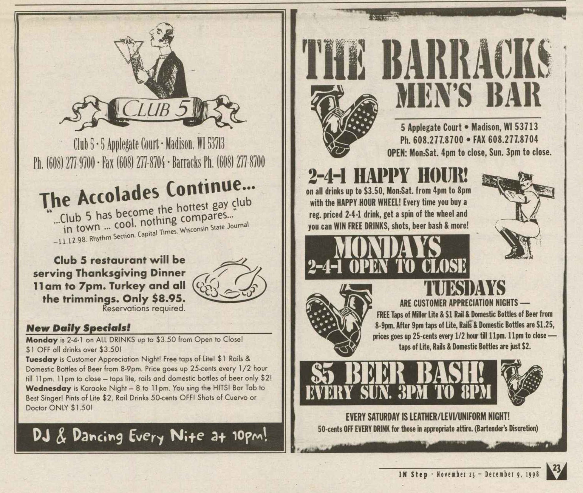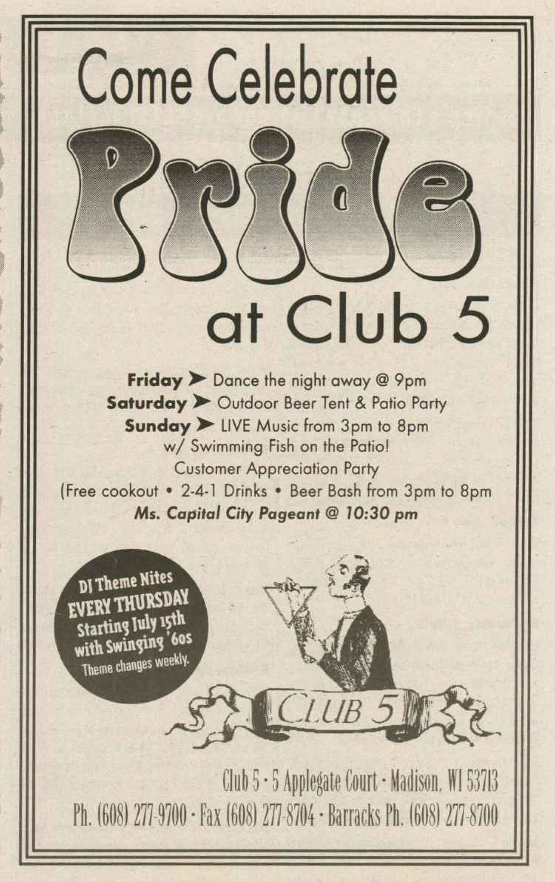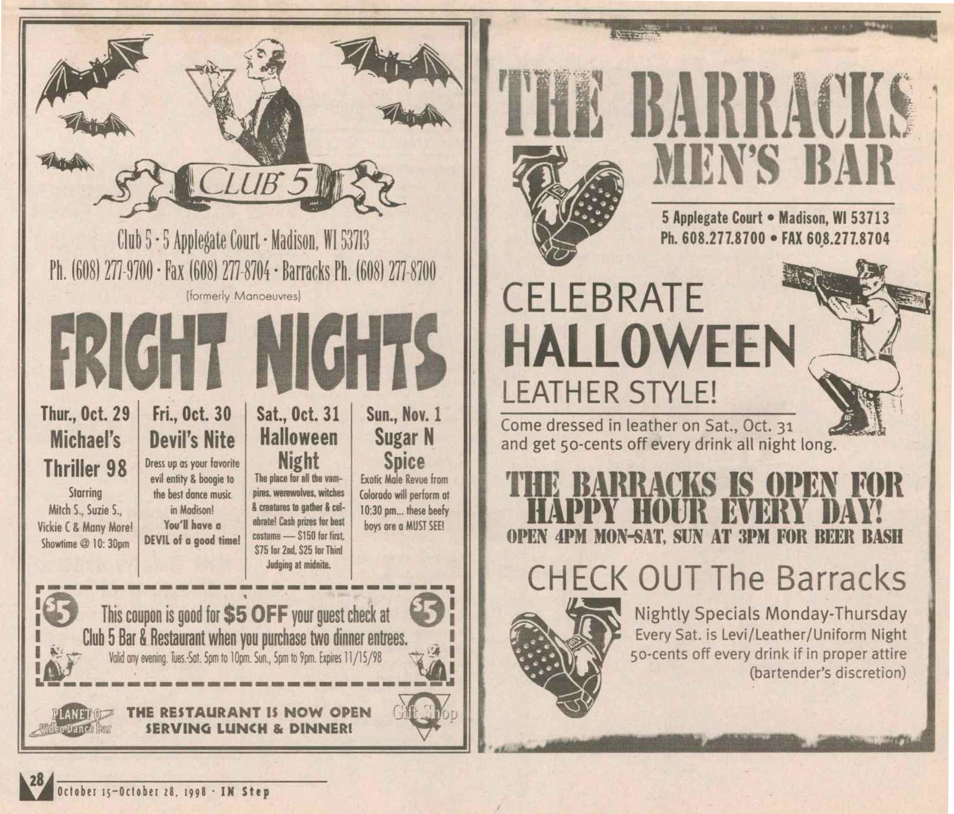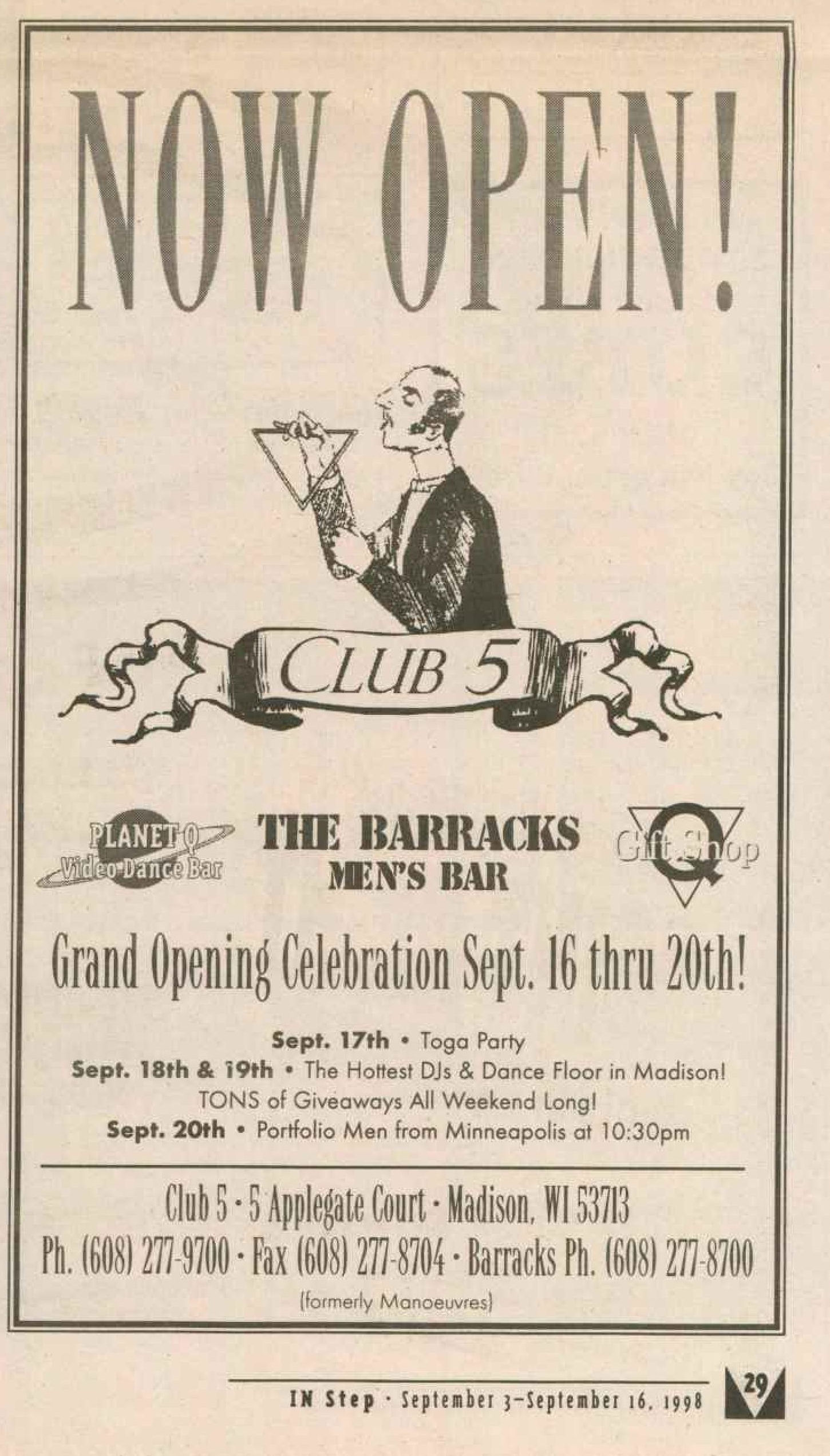 The Club 5 Complex was opened by Ed Grunewald as a replacement for his 'Manoeuvres' bar, which needed more room for expansion. He created a large complex of several separate serving bars, a restaurant, and outside space for volleyball etc. From the beginning, the business had three separate identities within the building, specifically: Club 5 restaurant and Bar: The major portion of the space was a DJ area and large dance floor area with a couple of bars. The "full service restaurant... serves lunch, dinner and Fri./Sat. after hours". Barracks: Men's bar, rustic setting. A place for the Levi/Leather community, Unicorns of Madison meetings and club nights, special events, etc. Always had many guys in jeans and t-shirts, or often shirtless. At times showed X-rated/ 'Adult' movies. Planet Q Video Dance Bar: with pool tables, dart boards, etc. Early ads also mentioned a "Q Gift Shop". And in April 1999, Ed added The Fox Hole womyn's bar to the building. Club 5 came about largely to fulfill a desperate need. During the 1980s and the first half of the 1990s, the main LGBTQ bars in the Madison area were Rod's (levi/ leather bar), the New Bar (dance bar), and the Cafe Palms restaurant-- all located in the Hotel Washington building. But early in 1996, a fire destroyed that entire building, and Madison's LGBTQ community needed gathering places to replace those facilities. The next largest bar to the 'New Bar' was Manoeuvres bar-- but even it wasn't large enough for all the new customers looking for a replacement to New Bar, Rod's, and Cafe Palms. Thus the Manoeuvres owner looked to expand his business space to meet that need. For its first ten years, business was great. 'Club 5' was Madison's primary dance venue and the complex was Madison LGBTQ community's 'place to be', with its restaurant, drag shows and contests, a separate bar (Barracks) for levi/ leather men, and an outside patio for drinks, dining, and a sand volleyball court. In 2007, bartender Dave Eick, a Hartford native now living in Madison and working in the restaurant industry, was promoted to general manager of Club 5. Shortly after, owner Ed Grunewald was diagnosed with a swiftly moving form of pancreatic cancer- and he offered Eick sole ownership of the business. Grunewald died April 21, 2008. While Grunewald's heirs did not originally recognize the legality of the gift, Eick eventually settled and had sole ownership of the business. But it was soon to be the beginning of some difficult times. First, the recession of 2008 took its toll, when staff and expenses had to be cut back. Eick added some events and made some changes to the bar's image. For example, in August 2011, a Facebook post stated: "Brand new Absolut Lounge/dance floor put in, one of many renovations the owner has done. If you haven't been here in a while it's worth checking out again! Madison's true LGBT hot spot!" In May 2012, Eick and his life partner Matt Couper tweaked the name to simply "FIVE Nightclub", although many LGBT periodicals continued to list the bar as "Club 5" in their bar directories. According to an article in Isthmus.com: "The south-side venue rechristened last week as Five Nightclub & Showbar, formerly Club 5, has a new dance floor, stage and sound system. That's not all: Totally dismantled is the Barracks, a backroom leather bar that for years played porn on six screens and served as a refuge for gay men behind boarded-up windows." "These changes are not merely cosmetic. Promos advertising the May 16 grand opening made a point of calling Five an "environment where everyone is welcome." The club's new tagline is "step up, and step out, Madison!" "The Barracks was a tough one to let go, (Eick) says, but necessary. On a practical level, it was a relic of a time when men needed bars to hook up... the Barracks (had) provided the sense of privacy now readily available online." Then in 2013, the city of Madison began rebuilding Fish Hatchery Road and its bridge across the Beltline, just adjacent to the club. The lengthy construction project took traffic on the road-- and to FIVE-- down to a crawl. Still struggling to recover from the 2008 recession and the costs incurred in the 2012 remodeling, expenses continued to pile up and the bar fell behind in taxes and rent. In 2014 a rent increase loomed, and the bar was on the verge of closing: on April 14, 2014, Eick announced the bar would soon be closing permanently. Madison's LGBTQ community wasn't ready to lose its largest gathering place, and a fan of the bar started a crowdsource fundraising campaign. By April 25, 2014 Eick was able to announce that FIVE Nightclub had been saved, by a combination of funds raised from the community, as well as temporary rent relief from the building owner. It looked like FIVE was destined to live on, and five busy and relatively successful years saw its business gradually rebuilding. But the difficult times weren't over yet. In February-March 2020, the COVID-19 pandemic hit, and the bar (along with millions of other bars, restaurants and other businesses around the world) was temporarily forced to close in March 2020 to reduce the spread of the disease. When it reopened around July 2020, legal capacity was temporarily greatly reduced and customers had to remain seated with social distancing and face mask use by staff and customers enforced. Through the Thanksgiving, Christmas and New Years holidays, crowds were essentially banned and (like all bars) the ambiance was subdued. COVID restrictions were gradually reduced, and around June 1, 2021, mask use by those vaccinated was often lifted (at the discretion of management) and capacity limits raised back to pre-pandemic levels. FIVE had survived the pandemic-- but many bars and restaurants across the country had been forced to close permanently, having been unable to sustain a year or more of no or greatly reduced business. Even such national gay bar landmarks as The Stonewall and Julius' in New York City had nearly gone 