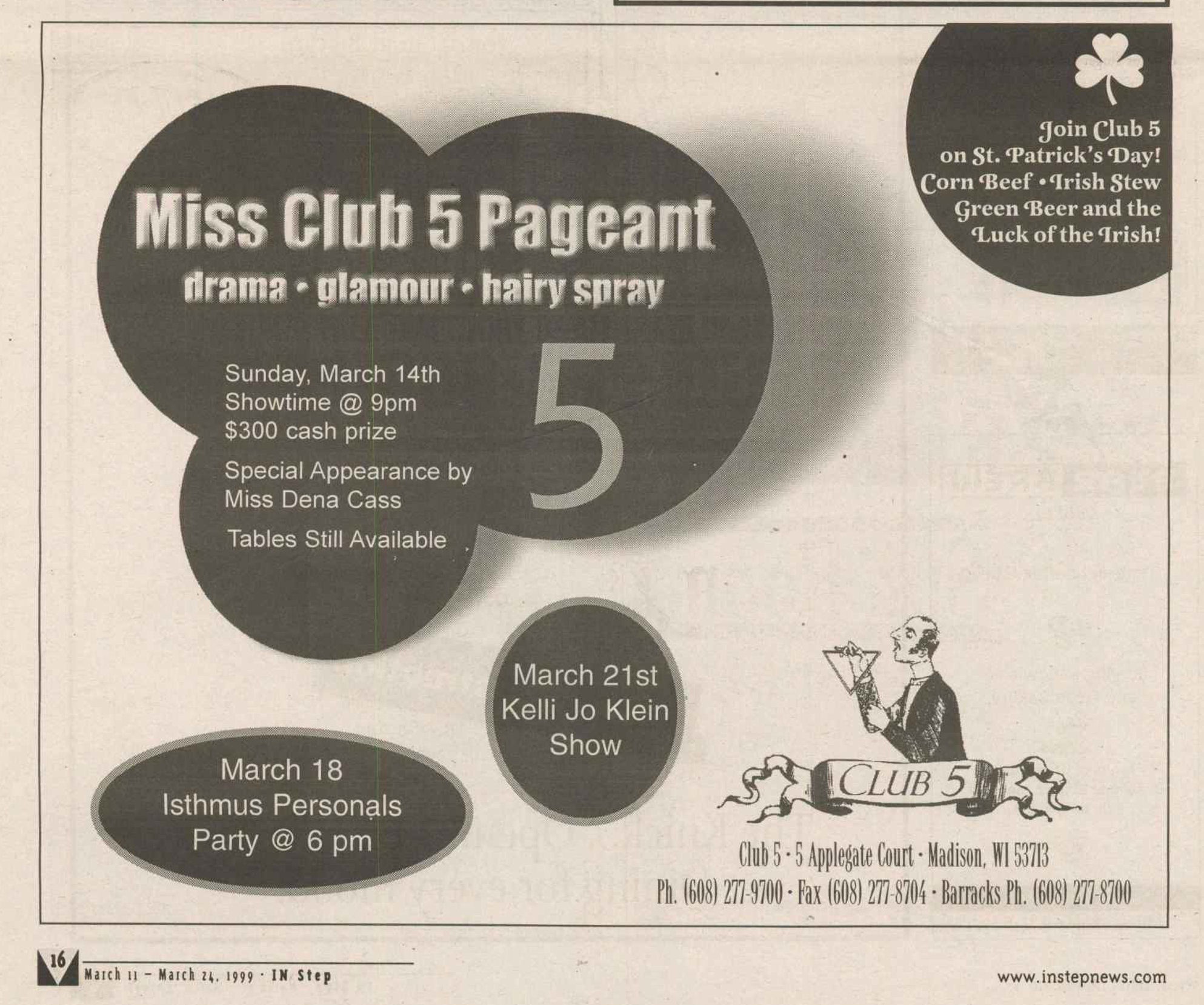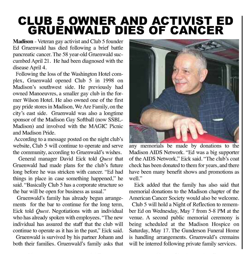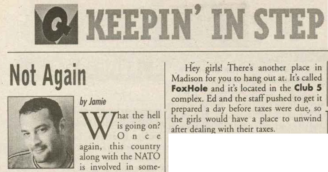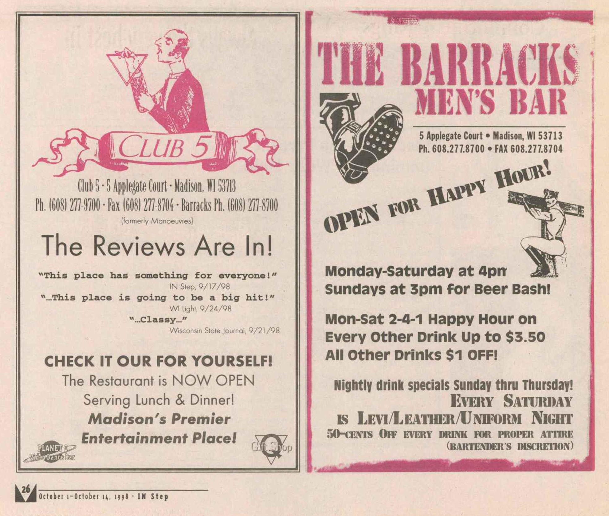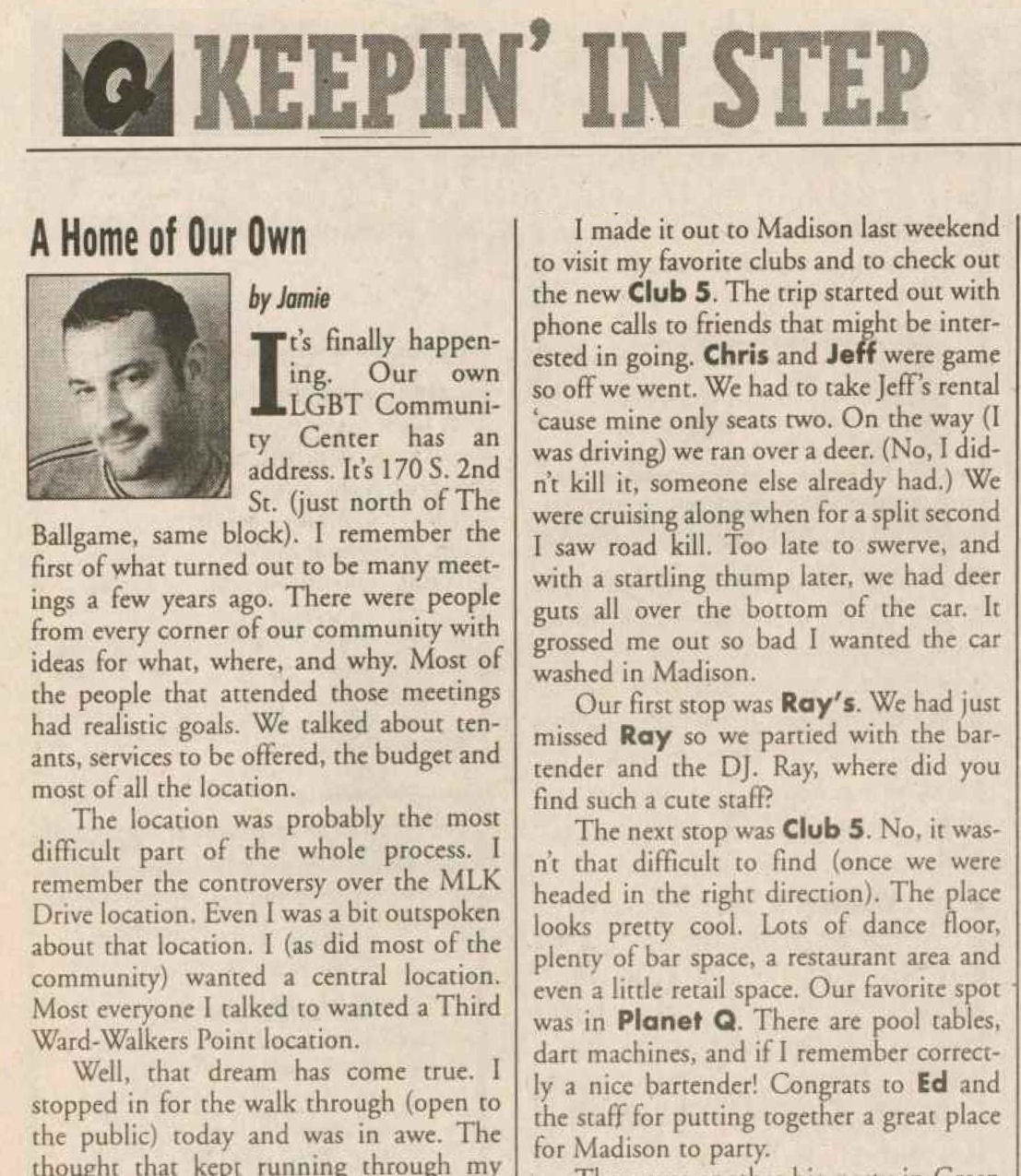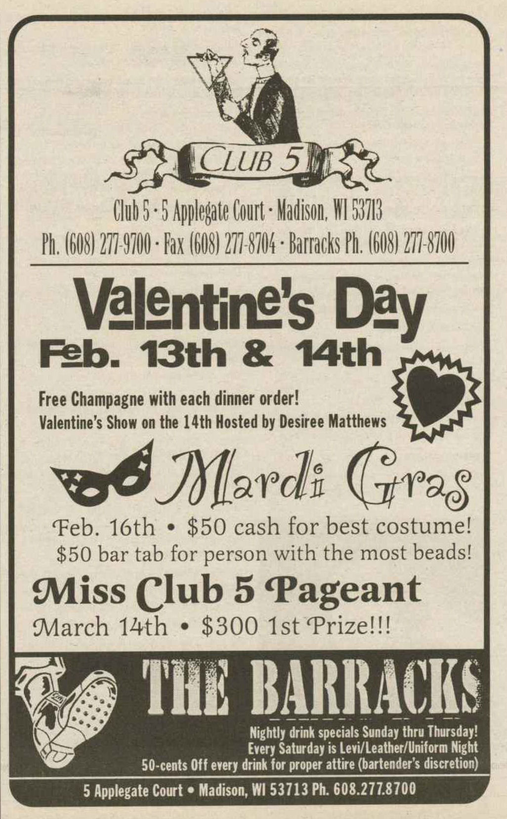 The Club 5 Complex was opened by Ed Grunewald as a replacement for his 'Manoeuvres' bar, which needed more room for expansion. He created a large complex of several separate serving bars, a restaurant, and outside space for volleyball etc. From the beginning, the business had three separate identities within the building, specifically: Club 5 restaurant and Bar: The major portion of the space was a DJ area and large dance floor area with a couple of bars. The "full service restaurant... serves lunch, dinner and Fri./Sat. after hours". Barracks: Men's bar, rustic setting. A place for the Levi/Leather community, Unicorns of Madison meetings and club nights, special events, etc. Always had many guys in jeans and t-shirts, or often shirtless. At times showed X-rated/ 'Adult' movies. Planet Q Video Dance Bar: with pool tables, dart boards, etc. Early ads also mentioned a "Q Gift Shop". And in April 1999, Ed added The Fox Hole womyn's bar to the building. Club 5 came about largely to fulfill a desperate need. During the 1980s and the first half of the 1990s, the main LGBTQ bars in the Madison area were Rod's (levi/ leather bar), the New Bar (dance bar), and the Cafe Palms restaurant-- all located in the Hotel Washington building. But early in 1996, a fire destroyed that entire building, and Madison's LGBTQ community needed gathering places to replace those facilities. The next largest bar to the 'New Bar' was Manoeuvres bar-- but even it wasn't large enough for all the new customers looking for a replacement to New Bar, Rod's, and Cafe Palms. Thus the Manoeuvres owner looked to expand his business space to meet that need. For its first ten years, business was great. 'Club 5' was Madison's primary dance venue and the complex was Madison LGBTQ community's 'place to be', with its restaurant, drag shows and contests, a separate bar (Barracks) for levi/ leather men, and an outside patio for drinks, dining, and a sand volleyball court. In 2007, bartender Dave Eick, a Hartford native now living in Madison and working in the restaurant industry, was promoted to general manager of Club 5. Shortly after, owner Ed Grunewald was diagnosed with a swiftly moving form of pancreatic cancer- and he offered Eick sole ownership of the business. Grunewald died April 21, 2008. While Grunewald's heirs did not originally recognize the legality of the gift, Eick eventually settled and had sole ownership of the business. But it was soon to be the beginning of some difficult times. First, the recession of 2008 took its toll, when staff and expenses had to be cut back. Eick added some events and made some changes to the bar's image. For example, in August 2011, a Facebook post stated: "Brand new Absolut Lounge/dance floor put in, one of many renovations the owner has done. If you haven't been here in a while it's worth checking out again! Madison's true LGBT hot spot!" In May 2012, Eick and his life partner Matt Couper tweaked the name to simply "FIVE Nightclub", although many LGBT periodicals continued to list the bar as "Club 5" in their bar directories. According to an article in Isthmus.com: "The south-side venue rechristened last week as Five Nightclub & Showbar, formerly Club 5, has a new dance floor, stage and sound system. That's not all: Totally dismantled is the Barracks, a backroom leather bar that for years played porn on six screens and served as a refuge for gay men behind boarded-up windows." "These changes are not merely cosmetic. Promos advertising the May 16 grand opening made a point of calling Five an "environment where everyone is welcome." The club's new tagline is "step up, and step out, Madison!" "The Barracks was a tough one to let go, (Eick) says, but necessary. On a practical level, it was a relic of a time when men needed bars to hook up... the Barracks (had) provided the sense of privacy now readily available online." Then in 2013, the city of Madison began rebuilding Fish Hatchery Road and its bridge across the Beltline, just adjacent to the club. The lengthy construction project took traffic on the road-- and to FIVE-- down to a crawl. Still struggling to recover from the 2008 recession and the costs incurred in the 2012 remodeling, expenses continued to pile up and the bar fell behind in taxes and rent. In 2014 a rent increase loomed, and the bar was on the verge of closing: on April 14, 2014, Eick announced the bar would soon be closing permanently. Madison's LGBTQ community wasn't ready to lose its largest gathering place, and a fan of the bar started a crowdsource fundraising campaign. By April 25, 2014 Eick was able to announce that FIVE Nightclub had been saved, by a combination of funds raised from the community, as well as temporary rent relief from the building owner. It looked like FIVE was destined to live on, and five busy and relatively successful years saw its business gradually rebuilding. But the difficult times weren't over yet. In February-March 2020, the COVID-19 pandemic hit, and the bar (along with millions of other bars, restaurants and other businesses around the world) was temporarily forced to close in March 2020 to reduce the spread of the disease. When it reopened around July 2020, legal capacity was temporarily greatly reduced and customers had to remain seated with social distancing and face mask use by staff and customers enforced. Through the Thanksgiving, Christmas and New Years holidays, crowds were essentially banned and (like all bars) the ambiance was subdued. COVID restrictions were gradually reduced, and around June 1, 2021, mask use by those vaccinated was often lifted (at the discretion of management) and capacity limits raised back to pre-pandemic levels. FIVE had survived the pandemic-- but many bars and restaurants across the country had been forced to close permanently, having been unable to sustain a year or more of no or greatly reduced business. Even such national gay bar landmarks as The Stonewall and Julius' in New York City had nearly gone 