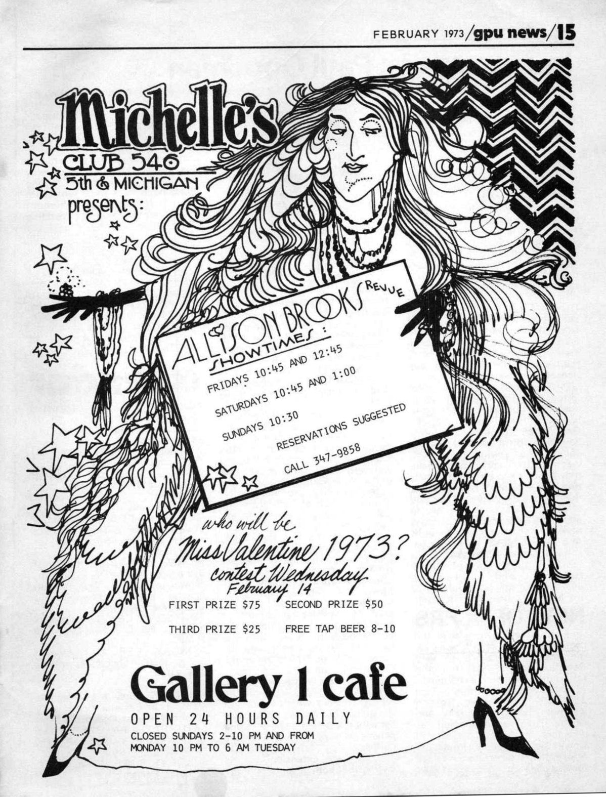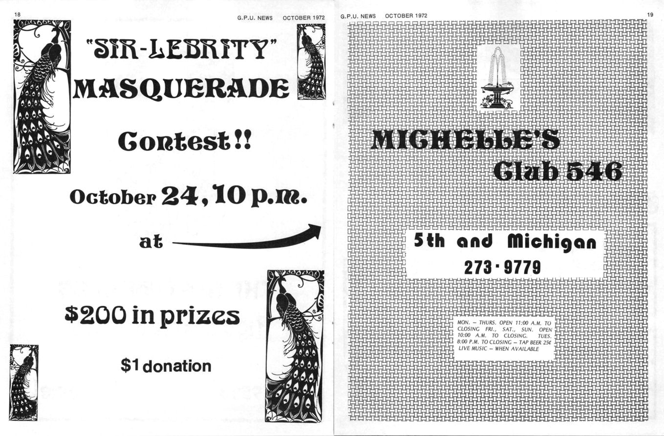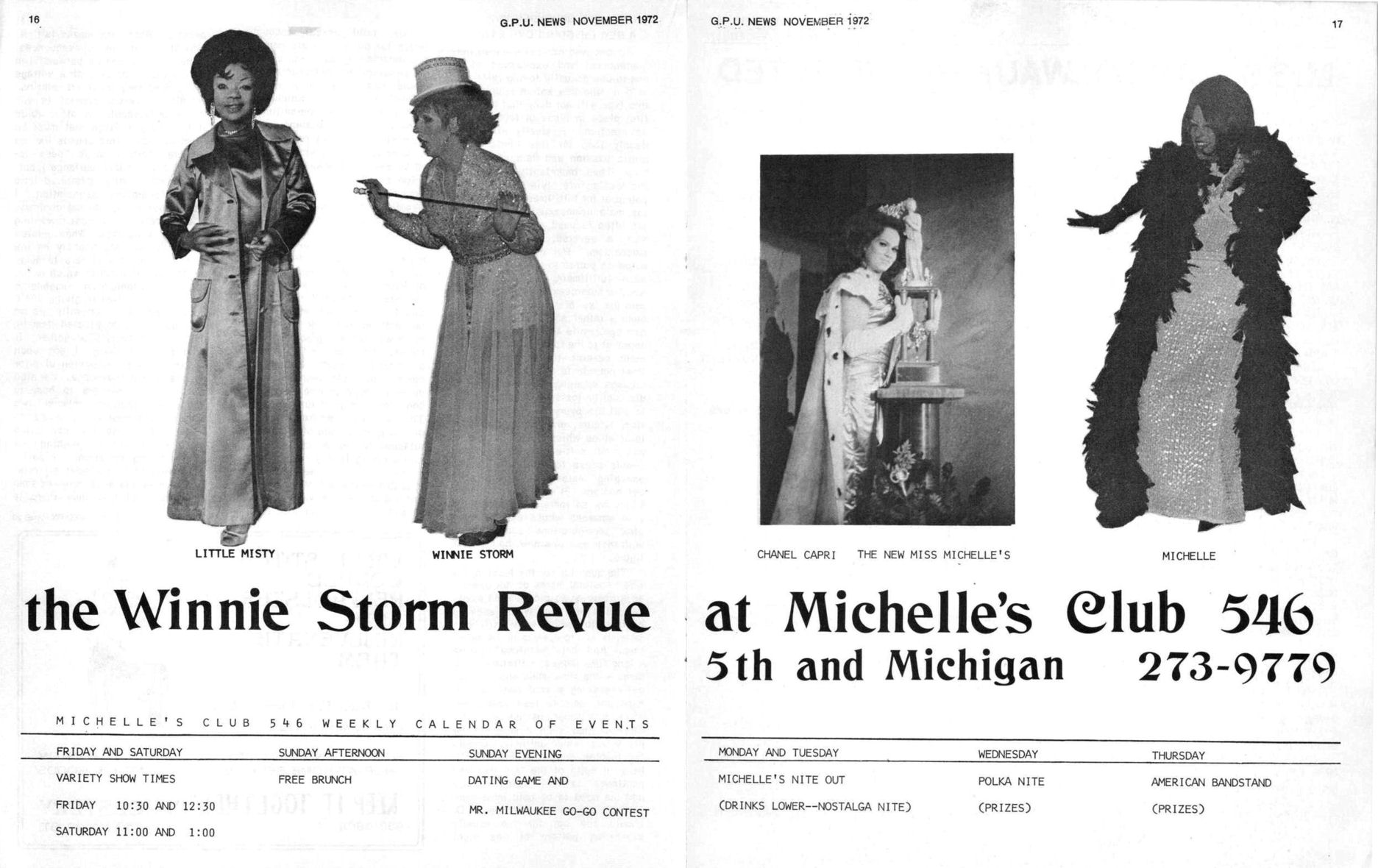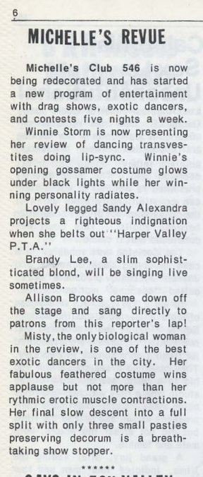 Michelle's Revue: Michelle's Club 546 is being redecorated, and has started a new program of entertainment, with drag shows, exotic dancers, and contest GPU News, Nov. 1972