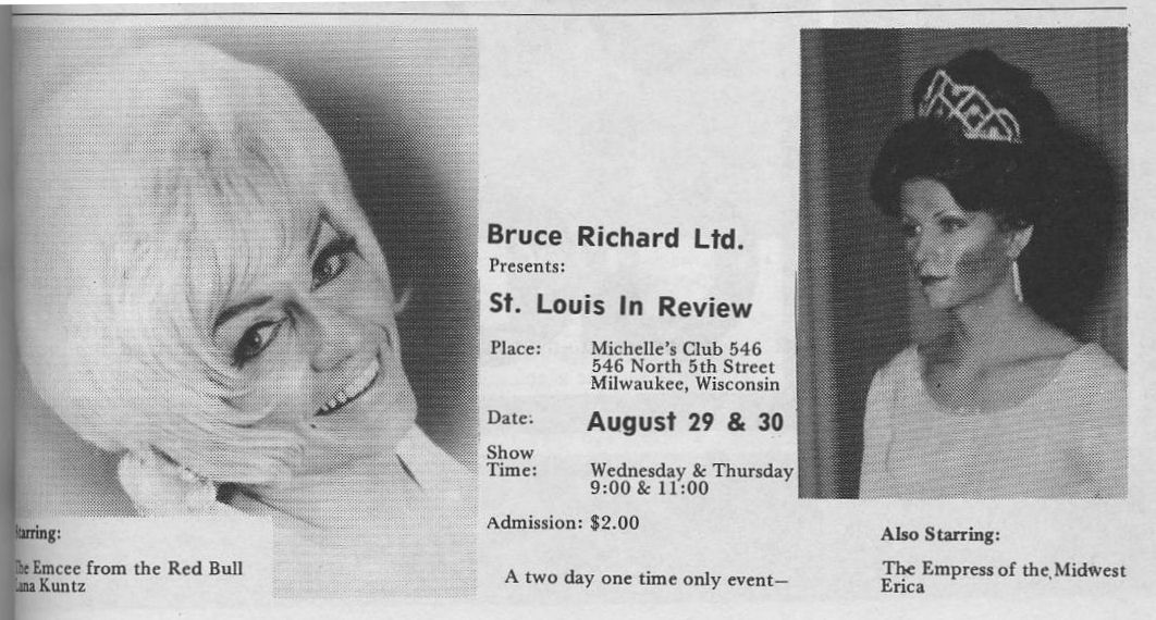 St. Louis Review Show at Michelle's Club 546: Emcee Lana Kuntz; and The Empress of the Midwest, Erica in GPU News, August 1973