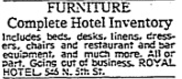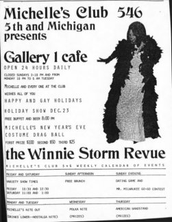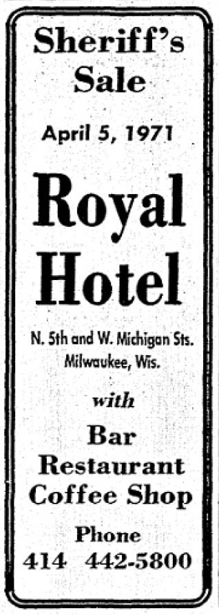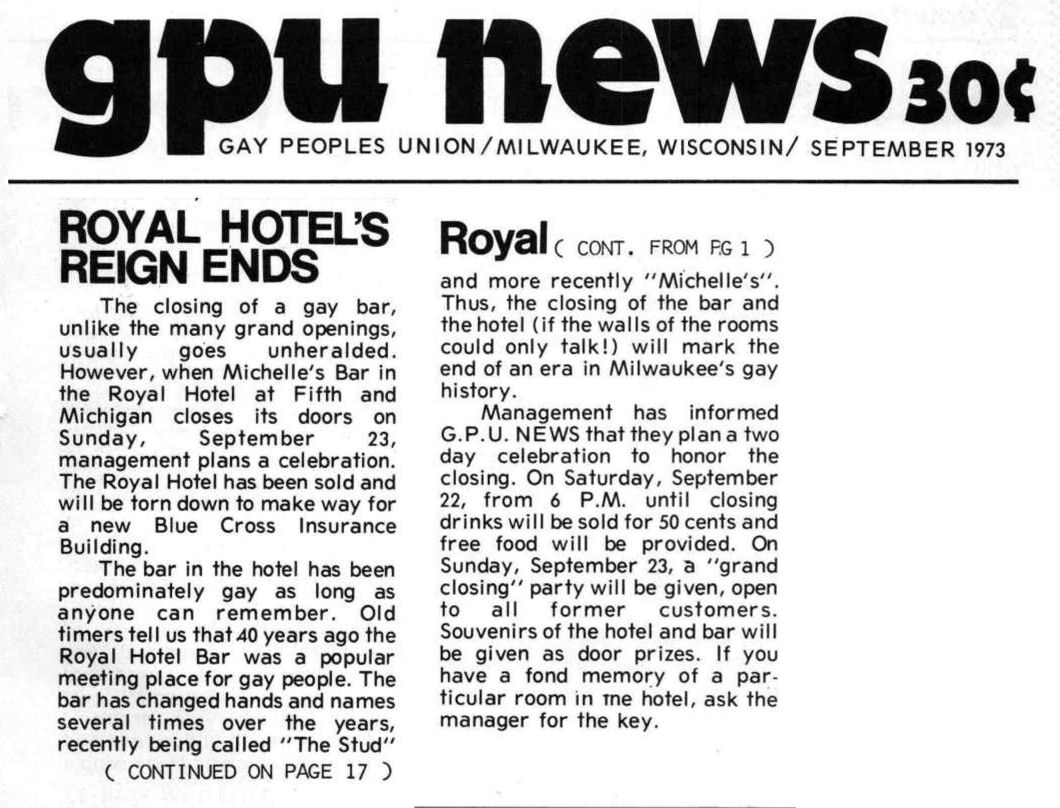 Club 546 was the name used for this long-time bar in its final years in existence. Located in the Royal Hotel at the corner of 5th and Michigan, the bar had long been a gay and lesbian bar, cafe, and meeting place, and continued to hold a strong clientele to its final days. This bar was known simply as the Royal Hotel Bar when it first began to be frequented by gay people. By about the mid-1930's it was already recognized as a popular meeting place for gay people in the Milwaukee area. It had various financial and business turns, and was sold in 1969 and after a renovation, briefly re-branded as The Buckskin Inn. But it still struggled and was sold at auction early in 1971. (See ad below for a sheriff's auction in 1971 connected to that failed venture.) Historian Michail Takach compiled the following history of the Royal Hotel for his book, "LGBT Milwaukee". (That book seeks to make the story of LGBT Milwaukee accessible, visible, and portable for future generations--before it is too late. The Royal Hotel and its bars is one of many early LGBT landmarks documented in the book.): From opening day on February 27, 1926, the Royal Nixdorf Hotel was a girl down on her luck. Original owner Ernest T. Nixdorf lost the hotel in the Great Depression, his daughter to an alienation lawsuit, and his wife to a self-inflicted gunshot. Reopening as the Royal Hotel in 1929, the 138-room lodging was the scene of continuous police activity. When runaway girls went missing, they were often found at the Royal. When bank robbers, liquor runners, and drug dealers were apprehended, they were usually caught at the Royal. When “deviates” were arrested, it was usually in the basement restroom of the Royal Hotel. After the 1931 closing of the St. Charles Hotel in City Hall Square, the Royal inherited its manager, staff, and reputation for relaxed morals. By the mid-1930s, gays and lesbians began to gather informally at the hotel cocktail bar and café, taking advantage of an open, accepting atmosphere. The bar manager openly provided financial and civil support for anyone arrested in “bathroom busts.” By 1968, the Royal was so derelict that the Milwaukee County Board sought to convert the hotel into a jail. Plans collapsed, and the Royal was sold in 1969. Eager to change the hotel’s image, the new owner renamed it the Buckskin Inn. After $100,000 in renovations, the Buckskin still did not attract new clientele. The building was sold at sheriff’s auction in 1971 to Western Bank, which narrowly outbid the Balistrieri family.By October 1971, when the GPU News began publishing its monthly GPU News, the bar space in the Royal Hotel really "came out of the closet" and opened its first full-force, liberated gay bar, 'The Stud'. They advertised in the new 'GPU News' as 'The Stud Club' with a "large dance floor". By late 1972 is was advertised as Michelle's Club 546, sometimes mentioning both a Gallery I and Gallery II, with the former being a 24 hour Cafe with more casual sandwiches etc., and the latter being a more formal Dining Room. Michelle’s was incredibly popular, offering variety shows, go-go dancers, polka parties, drag balls, and a 24-hour café. Whether known as The Stud, Club 546, or Michelle's, this space was unabashedly an out-and-open gay bar. Researcher Michail Takach discovered on NewsBank in Feb-2020 that "Misty Dawn, early transgender superstar and unlikely civil rights activist, moved on to striptease performances at Michelle's (at the Royal Hotel) when the Ad Lib bar went back to all-girl shows in 1972 and the City of Milwaukee eliminated misogynistic laws targeting B-Girls and female impersonators -- making it far more easy for straight and gay bars to host drag shows." But Milwaukee officials began redevelopment negotiations in 1970, and finally agreed on terms with Blue Cross Blue Shield in 1973 to build a new Insurance headquarters building on the site. According to an article in the September 1973 issue of the GPU News, Michelle's bar would be closing its doors for the last time on Sunday, September 23, 1973, after some 40 years of being a haven for gay people to meet and socialize- surely the end of an era. At the closing party, guests received keys to their most memorable rooms as parting gifts. The hotel was flattened in 1974. “So there goes the shabby old Royal Hotel, and good riddance,” noted the Milwaukee Journal. “That’s the best kind of blight elimination.” But such a sad end to one of Milwaukee's first true LGBTQ landmarks. |