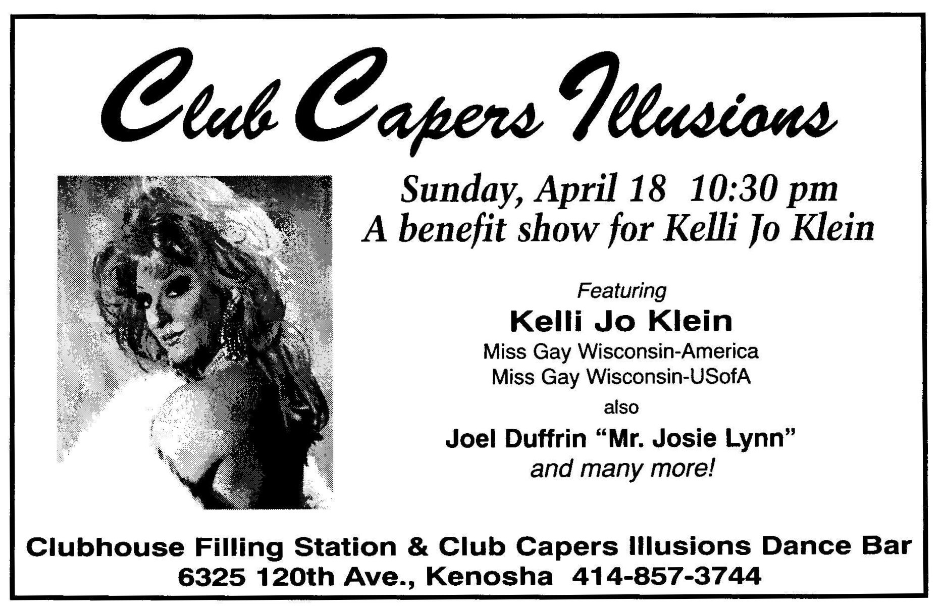 Otherwise, very little is known about this bar. It was apparently some sort of "complex", with some advertisements reading simply "Clubhouse Filling Station", and others also using the term "Club Capers Illusions" as a dance bar. There is also one photo of a 'Ms Gay WI USofA Pageant' held at Capers/ Illusions in 1999.