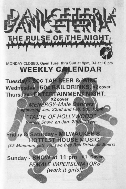 27th Street Danceteria was another in a long line of bars opened and managed by Chuck Cicirello, perhaps the most prolific of gay bar owners in Milwaukee's history. Chuck previously operated the Neptune Club, then the legendary "Factory" bar and two other follow-ups to that (Factory II and 3). This location was not new to LGBTQ bars however. The building had been the Lost & Found from late 1978 to Sept. 1984, known as "Milwaukee's First Women's Disco" and "Wisconsin's Largest Women's Bar (where everyone is welcome)". The bar then reopened under new ownership as the Music Box, which only lasted from October 1984 to February 1985. Chuck took a chance on the bar hoping for at least as long a life as the Lost & Found. Originally opened in March 1985 as a juice bar to make for a place for all ages (including underage people) to meet, mingle, and dance, 27th Street Danceteria advertised as the "first private late night juice club" and "Party 'til Dawn" with closing time shown as 5am and 6am some nights-- well past the 2pm closing of bars service liquor. Photos from opening night in 'In Step' magazine vol. 2-07 showed Scott Olson as manager and Kim Zwelbahmer as DJ. But the bar ran into a legal dilemma when it was discovered that dancing was not allowed past midnight unless the location held a liquor license. It was thus forced to apply for a liquor license to make dancing available up to bar-closing time. It reopened as such in May 1985, with the formal "Grand Opening' of the reopened bar held Saturday August 3. Originally attracting all gays and lesbians (due to Chuck's previous mega-bars, the Factory bars), 27th Street Danceteria eventually become known more as a black gay/ lesbian bar and dance club. The bar closed in June 1987, disappearing from Bar listings that month. |