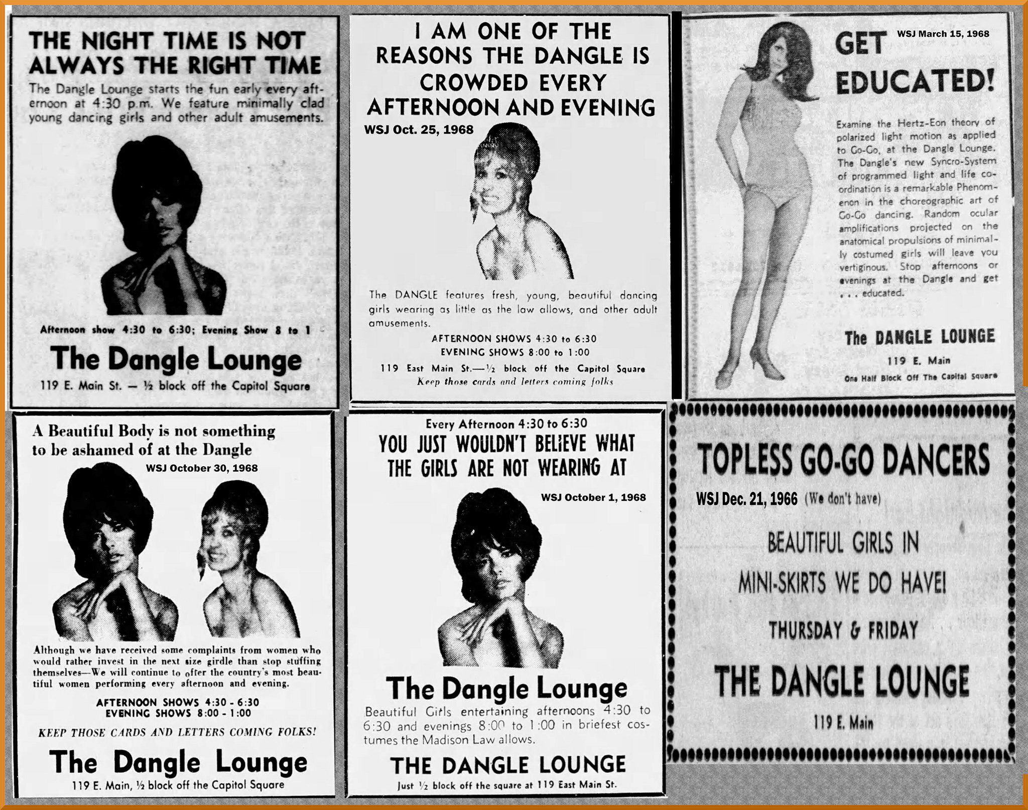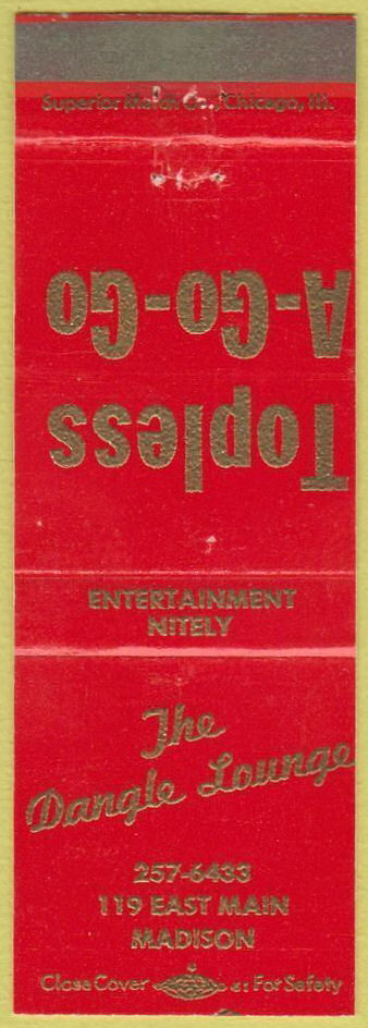 Eddie Ben Elson announced his candidacy for Dane County District Attorney on the Dangle Lounge stage- nude, except for a strategically placed flower. And 'The Isthmus', Madison's long-running alternative newspaper, was born at the Dangle Lounge in 1976 as a collaboration between bartender Vince O'Hern and Capital Times columnist Fred Miverstedt.