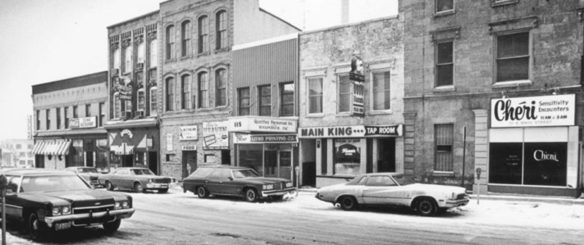 By 1977, Main and King Streets were an open-air sex market with two strip clubs, a topless bar, an adult bookstore, and several massage parlors. Pimps and prostitutes freely worked the streets. State employees were often mistaken as sex workers and solicited by men circling the square. One of the city's first female police officers, Chris Still, said "I wouldn't consider walking alone in the area back then."
