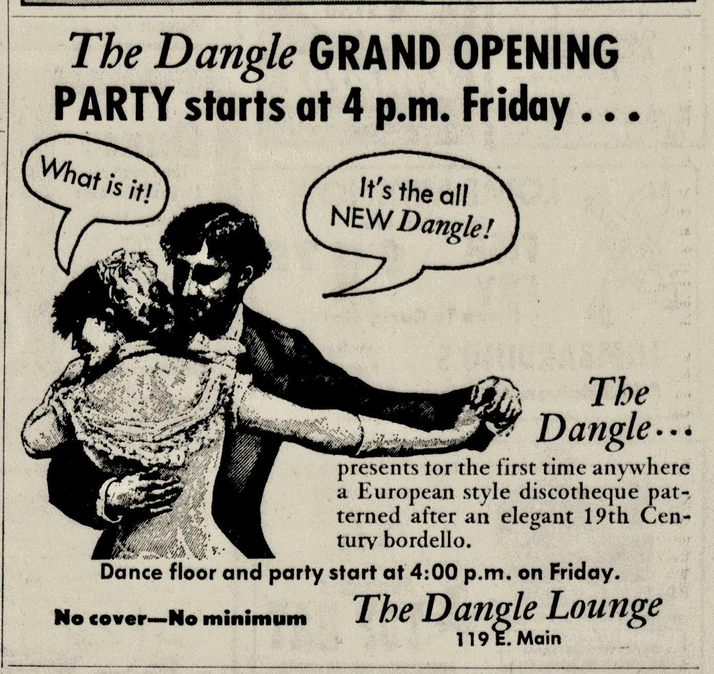 The Dangle opened as a piano bar, but business was slow. One night, a server got up on the piano, danced suggestively, and took off her shirt. The crowd went wild, and business exploded. The Dangle was seen as a herald of the Sexual Revolution and a counterculture hotspot.