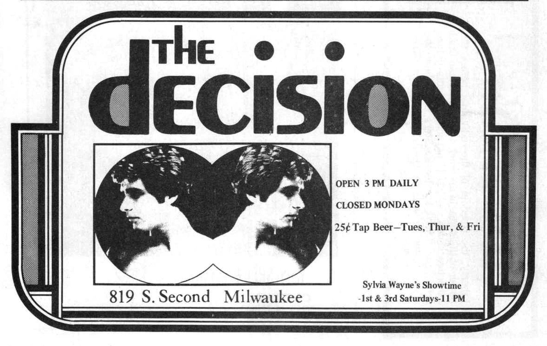The Decision bar is largely a mystery. We have located only a single advertisement for the bar as "Decision", in the April 1976 issue of "GPU News". Its only other mention in LGBTQ media of the time is the August 7, 1976 issue of "GLIB Guide", which describes a new business "Hideaway" as: "Two young guys, Mike and George, host cozy male rumpus room." The "Summer Brings New Bars" column in that same issue goes on to say that "Across the street from the Black Forest (bar and restaurant), the bar that was formerly the Descision (sp) was reopened by two young owners and renamed the Hideaway." So the bar as "Decision" appears to have existed for only a month or two (or perhaps even just weeks) in early 1976. This location has been host to a long tradition of LGBT establishments. The first was apparently "Friendly Bar" (1944-1947). It was operating as 'The Hustler' in the early 1970s, which may also have been somewhat gay friendly (additional research is needed). But its run as well-documented LGBT establishments really began when it was briefly opened as 'The Decision' in early 1976. Next it was Hideaway for the last six months of 1976, after which for a time no longer housed a gay business. Its string of housing LGBT businesses resumed with the relocated Mint Bar II/ Angelo's (1986-1991), followed by BJ's Mint Bar (1991-1993), Zippers (1993-1998), and finally Fluid in 1998-- which is still open in 2024. More information about this business is welcomed from anyone who can contribute it. |