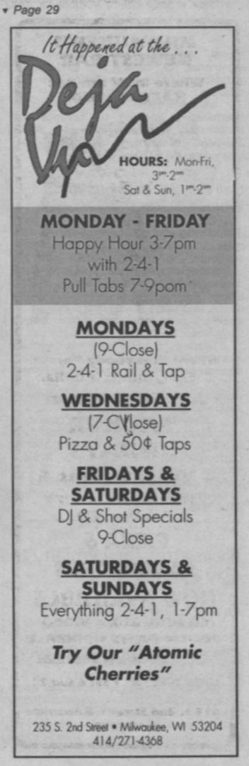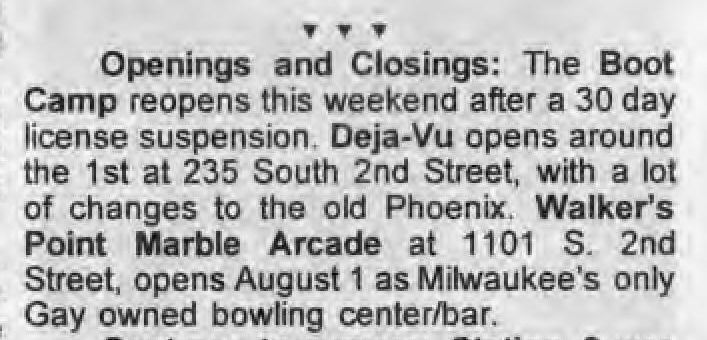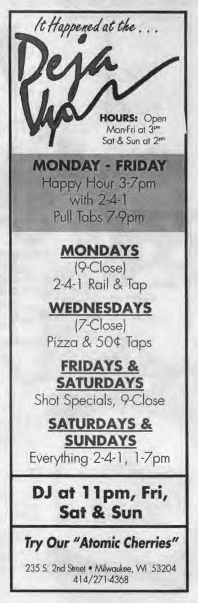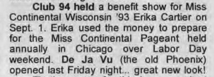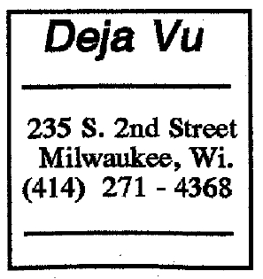 Deja-Vu was a short-lived lesbian bar, in the space previously occupied by The Phoenix. This location was the southern anchor of an area of several gay bars in a 1 block area: also including C'est La Vie, Gary's/ Circus/ Club 219, and the BallGame to the north. To the best of our knowledge, Deja-Vu existed for less than a year, from August 27(?) 1993 to between April and June 1994. The bar is not seen in bar listings after 'In Step' vol. 11-10 (the May 19-June 1, 1994 issue). In the 1990's the area had lost ground as a gay mecca, mostly due to the neighborhood. The Club 219, which for a while was the largest and most popular gay dance club in Milwaukee, was eclipsed by La Cage, and that area (about 8 blocks to the south, around National Avenue) became the center of gay bars and activity. The neighborhood in this area also began to became gentrified, with condos and art galleries moving into the area; these detracted from the closed "gay neighborhood" feeling, and also greatly restricted availability of parking. This space was first known as an LGBT bar when a popular bar called Oregon House occupied the space, followed by the long-lived Phoenix. Over the years, this space was occupied by at least six LGBT bars: Oregon House (1976-1978) More information about this business is welcomed from anyone who can contribute it. |