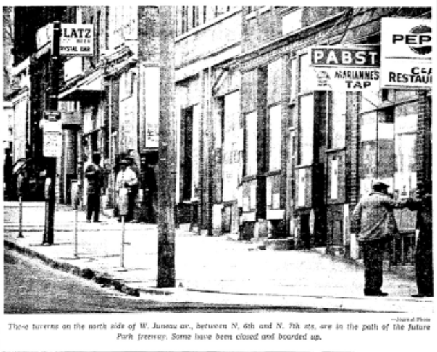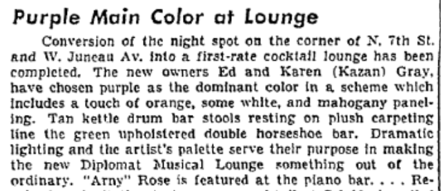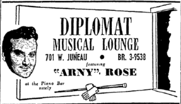 The building that was to become widely known in gay men's memories as "The Diplomat" was built in 1916 by Gustav Frey and spent its earliest years as one of the last Pabst Brewing Company tied saloons. After Prohibition and the tied-house ban, the tavern began a 50-year journey through almost endless name and format changes. During the 1940s, the bar was a popular live music venue called "Thelma's Back Door." It became known as "The Diplomat" when Jim Koconis notes in his August 16, 1958 "Nightlife Chatter" article in the 'Milwaukee Journal' newspaper that new property owners Ed and Karen Gray had redecorated the old bar in flamboyant colors - purple, orange, white and green -- which made a real, loud fashion statement. The Diplomat Musical Lounge was peak midcentury kitsch. At the time, West Juneau Avenue was a tired, rundown and slightly rough stretch of taverns, stretching all the way from Water Street to the Pabst Brewery. No wonder that the Milwaukee County Expressway Commission targeted so many nearby properties -- even those outside the freeway's path -- for "blight removal." Opening a high end cocktail lounge in this neighborhood was a gamble for 1958. Thanks to aggressive advertising, the bar was an immediate, tremendous success. So why did the bar lose its license after only two months? Police testified that Ed Gray was a resident of Detroit, not Milwaukee, and was allowing "unlicensed persons" to operate the bar. The real story was that the Diplomat welcomed homosexual customers in large numbers -- and police suspected the local operators were "aunties" hired to bring in gay business. The bar reopened as the Aristocat Musical Lounge in February 1959. However, police soon discovered the new licenseholder was Adam Lisheron, brother of Ed Gray's lawyer, Frank Lisheron. The license was revoked again in January 1960 as the committee "feared a subterfuge operation." On March 1, 1960, the Common Council ordered Adam Lisheron to sell the business or lose his liquor license. The Diplomat / Aristocrat was cited several times for serving diluted liquor-- something commonly done at gay bars of this era, because gay clients were unlikely to complain. When inspectors found three diluted bottles of whiskey during a January 1960 visit, bartender Frank Lisheron was charged $150 for "mixing drinks in the bottle." The location reopened in July 1960 as Mr. Kelly's, featuring brass jazz bands for several years. It was later known as Gallery Lounge (1961) and Rickey's Yum Yum (1963) with long periods of vacancy in-between and afterwards. But its time as a gay men's mecca for a quiet and discrete drink was largely over, having lasted just the few years as The Diplomat Musical Lounge starting in 1958 through its brief run as Aristocrat Musical Lounge until it closed early in 1960. While brief, the Diplomat/Aristocrat era was a very significant one. The Pink Glove was during this same timeframe and usually gets all the credit for being the first "deliberate gay bar" (marketed as catering to gay people) but from all accounts of the men who were there, something similar was going on with the Diplomat as well. Contributors remember this as a "New York style piano bar" and "high end cocktail lounge" that came and went quickly. At a time when word of mouth was the only "gay guide," someone sure got the word out to the gay community that a new bar was opening. The building survived until 1989. Its later history is recounted by Michail Takach: The Flame Nightclub, opened by Derby Thomas in 1946 at 1315 N. 9th St., moved here in April 1964. The liquor license was renewed in July 1964, with the caveat that a 30-day notice could be served if freeway construction was ahead of schedule. Yet, somehow, the property evaded demolition as it was deemed to be "saveable." Derby Thomas died in October 1964. His widow, Loretta Whyte, chose to reopen The Flame after his death, but it didn't last long. By November 7, 1965, the Milwaukee Journal commented: "Until recently, about a dozen taverns operated on the north side of Juneau Ave. between N. 3rd and N. 7th Sts. But Tavern Row on W. Juneau Ave. isn't much of a temptation anymore to the man with a heavy thirst. Most of the small, dimly lit taverns that stood nearly shoulder to shoulder on the north side of the avenue are now dusty, vacant shells waiting to be torn down. Neon lights still twinkle outside a few, but only a few." "The invasion of freeways accomplished what police crackdowns and the clamor of neighborhood and civic groups could not achieve: a weeding out of the taverns from this area. The land has been taken for the Park Freeway, due to be completed in 1971." "It was probably the longest block in Milwaukee for the man with a thirst. The area has long been the target of police. Call girls operated from many of the taverns, few of which could ever possibly meet health codes." But somehow the corner building at 701 W. Juneau survived this round of demolitions, perhaps partly because of its historic status as a Pabst Brewing Company tied house. By October 1966, the building was again vacant -- and remained vacant until it became Irene's Club Continental sometime in 1969. Irene's was the scene of scandal in August 1972 when three off-duty people officers provoked a disturbance at the bar, made racial remarks and chased and struck an African-American bartender. Operator Irene Spivey Salter was convicted several times, including allowing minors and prostitutes to loiter in the bar, and for being the inmate of a gambling house. By 1979, the building was a popular MATC hotspot known as "Z Bar," or the Z-Building Pub and Grill. In August 1989, MATC voted to purchase four blocks of land, including the Z-Building Pub, to expand its downtown footprint. Down went the historic Z-Bar, to be replaced with a parking lot. Curiously, 701 W. Juneau had survived the near-total demoliton of West Juneau Avenue's Tavern Row in the 1960s because of its historic "status" as a Pabst Bre