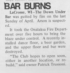 The May 1977 issue of GPU News contained a full page article and photo, "Down Under Bar is Born in La Crosse". The article mentioned that bar's first annual gay extravaganza, held April 1st-3rd. The weekend, entitled "A Bar Is Born", was planned and directed by owner Patrick Trussoni and manager Joshua Oliver. Located about midway between Chicago and Minneapolis, the festivities were planned as a means of introducing gay talent from the Chicago area to the upper Wisconsin and Minneapolis areas. According to the article, over on thousand people were in attendance over the course of the weekend. The bar's success appears to have been very short-lived (about 6 months). The bar was gutted by fire on the last Sunday of April 1977 (April 24)-- just 3 weeks after its extravaganza weekend. According to the June 1977 issue of GPU News, "A recently installed dance floor, a beer garden, and the upper floor and bar were destroyed". We have thus far been unable to locate any reference to the bar in other Wisconsin LGBT media, so it's likely the bar never reopened. The bar was listed only in the 1978 issue of the Damron national gay guide, but disappears from Damron after that. It does however appear in the 1981 and 1982 GAIA national Gay guides, likely due to early reports that were not removed after the fire. More information about this business is welcomed from anyone who can contribute it.