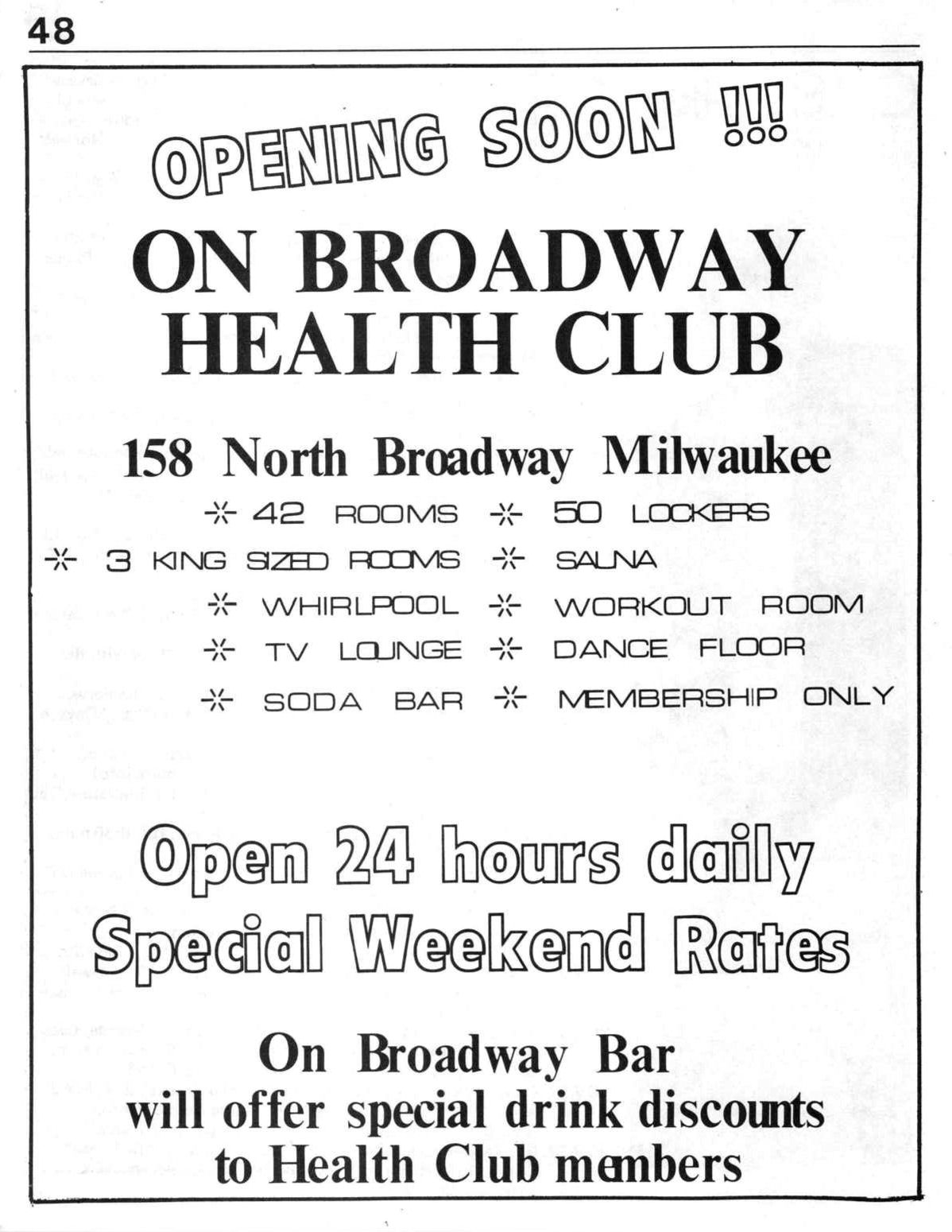 Ad for Health Club references 'On Broadway Bar' at bottom of ad