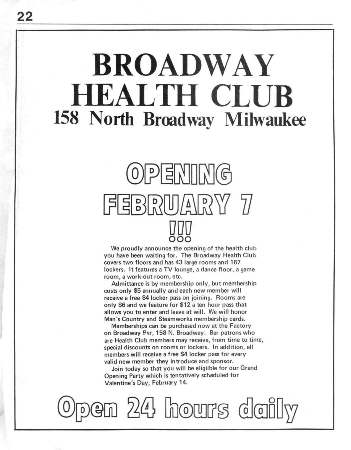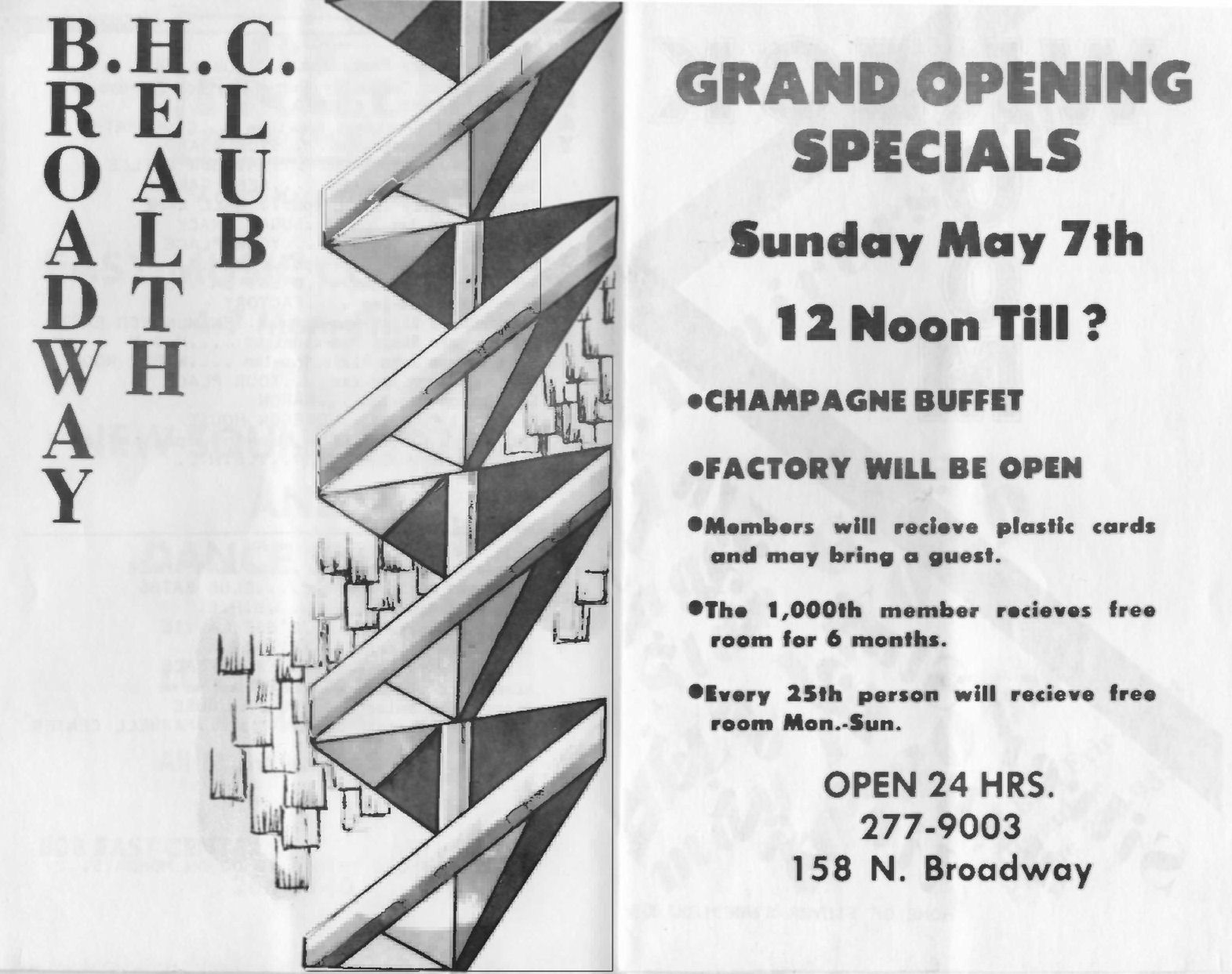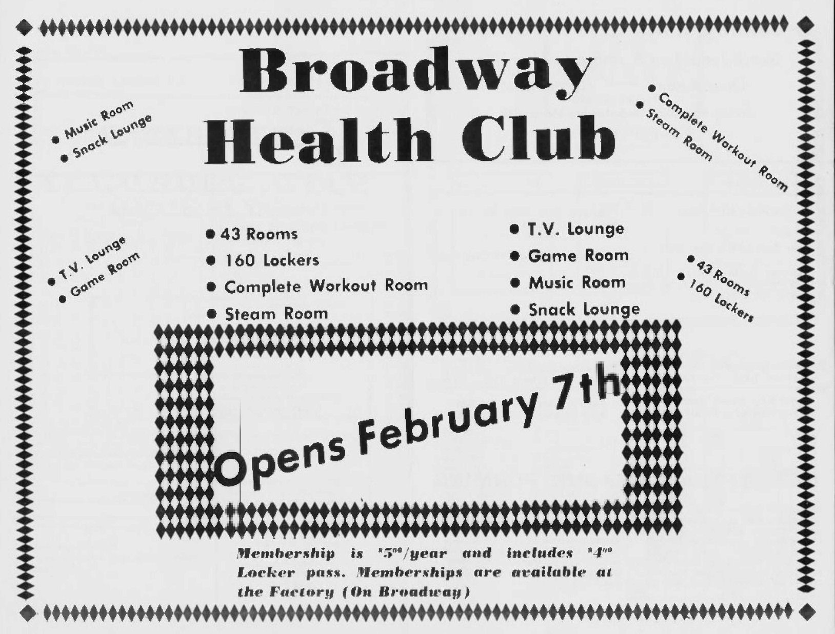 Ad announcing opening of Broadway Health Club (BHC) above the Factory