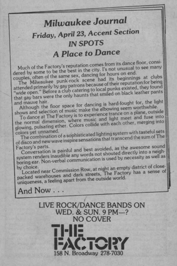 Ad: reprinting Milwaukee Journal praise of The Factory