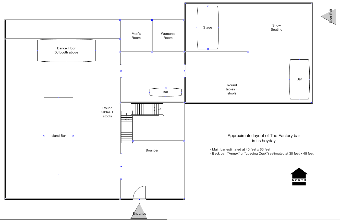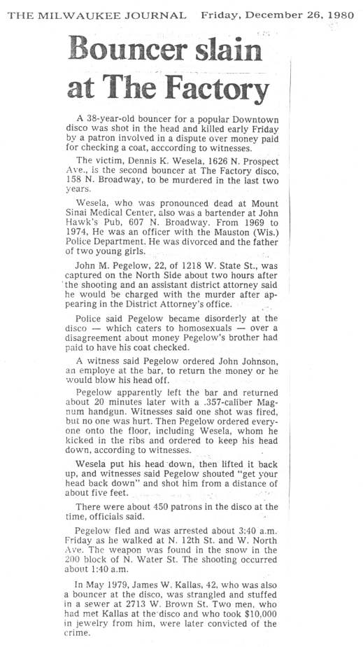 Starting around September 1975, the Factory was also known as The Inferno; initially a large devil's head (or dragon's head) was suspended over the dance floor, which periodically snorted 'smoke' or fog over dancers. A January 1976 ad in GPU News calls the bar "Devilishly Devine", and the August 7, 1976 issue of the local "GLIB Guide" describes the business as follows: "Boogie down with the snorting dragon and nightly gang. Weekends offer second dance floor." But the August 28, 1976 issue of "GLIB Guide" followed up with: "The dragon is gone. The Inferno reopened after a remodeling right after the first issue of Glib had been distributed. So the listing on the Inferno was quickly dated. The look is now mirrors and lots of colored lights." Then in mid-1977, another attempt was made to rename the bar; this time to On Broadway. While advertising used that name ("On Broadway- Devilishly Divine") for the next few months, customers still routinely called it The Factory. By the time the owner opened the Broadway Health Club above the bar in February 1978 (see below), it was again advertising as "The Factory". The Factory is also remembered as generous in specials and giveaways. For example, at New Years Eve parties, there were frequently handouts to each patron (such as the plastic hats given away for New Years 1981 and 1982, shown here.) During a good part of its run, the Factory also included an additional back room with a second full-service bar and game room. Connecting through the beer bar, this room, early on called the Marquee Room, was used for additional dancing and quieter visiting during busy hours, and most notably to host meetings and with a stage for performances. Several 'drag' contests and drag shows were held there, as well as musical performances and benefit shows. (See sketch of layout.) This back area was later called "The Loading Dock". In February of 1978, owner Chuck opened the upstairs in the same building as a men's health club/ spa (aka bath house), the Broadway Health Club, which was raided on numerous occasions by the then notoriously homophobic Milwaukee Police. There were two tragedies associated with this bar. The first was in May 1979, when a bouncer, 'Tiny' (James W. Kallas) disappeared after leaving the bar, and was found dead a week later. Then, in December 1980, a patron returned to the bar with a pistol after an arguement, and after ordering all patrons and employees to the floor, shot and killed the doorman/bouncer, Dennis Wesela. The later killing stirred up the gay community, prompting more community awareness and the attention of the District Attorney. The Milwaukee Journal, Milwaukee's daily newspaper, featured the Factory as its 'Accent' section's "IN Spot" on Friday, April 23, 1982, describing it as follows: A Place to Dance Much of the Factory's reputation comes from its dance floor, considered by some to be the best in the city. lt's not unusual to see many couples, often of the same sex, dancing for hours on end. The Milwaukee punk-rock scene had its beginnings at clubs attended primarily by gay patrons because of their reputation for being "wide open." Before a club catering to local punks existed, they found that gay bars were the only haunts that smiled on black leather pants and mauve hair. Although the floor space for dancing is hard-fought for, the light shows and selection of music make the elbowing seem worthwhile. To dance at The Factory is to experience trance on a plane, outside the normal dimension, where music and light meet anmd fuse into into glowing, pulsating ether. Colors collide with each other, merging into colors yet unnamed. The combination of a sophisticated lighting system with tasteful sets of disco and new wave inspire sensations that transcend the sum of The Factory's parts. Conversation is painful and best avoided, as the awesome sound system renders inaudible any words not shouted directly into a neighboring ear. Non-verbal communication is used by necessity as well as by choice. Located near Commission Row, at night an empty district of close-packed warehouses and dark streets, The Factory has a sense of uniqueness, a feeling apart from the outside world. It was a shock to the gay community when The Factory announced it would be closing. But the days of disco were already in decline, and competition had opened up from what was first "Gary's" in 1975, and then Club Circus in 1976; that same bar would eventually become Club 219 in 1981. The relentless competition required drastic changes and the response was to close and look for another venue with a fresh look. This bar was followed by two other Factory bars opened by Chuck: the Factory II in 1982 at 130 E. Juneau; and the Factory 3 on North Broadway north of the expressway. While both popular in their day, neither matched the long-term appeal, and no bar in Milwaukee has ever come close to the legendary status, of the original "The Factory". The history of all three "The Factory" bars, and Chuck Cicirello, was published on the OnMilwaukee.com website in 2024. (A book, "LGBT Milwaukee" by Michail Takach, seeks to make the story of LGBT Milwaukee accessible, visible, and portable for future generations--before it is too late. The Factory is one of many early LGBT landmarks documented in the book.) Recollections: The following are recollections of others who have been kind enough to submit their personal memories to the webmaster. You are welcome to do the same! The Factory - The first gay disco I was ever in, on Halloween night, 1973. On that night, I was taken to the factory by a guy I had just met through a personal ad. Upon entering the Factory, the assistant foreman and the union steward from the company I worked at were standing in the foyer. Great shock for me. I moved quickly into the bar to get lost in the crowd and stepped on the gown of a drag queen who nearly punched me. Remember the dragon/bull at the dance floor (no one could decide what it was supposed to b