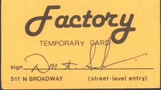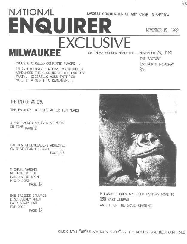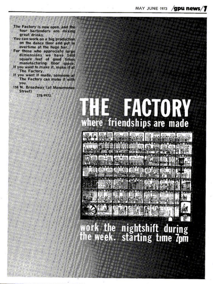 Owner Chuck Cicirello (also going by the name 'Chuck Balestreri') opened this bar shortly after closing his previous venture, the Neptune Club. An Advertisement for The Factory first appeared in the April 1973 issue of GPU News. The Factory is THE Legendary Milwaukee Bar- it is remembered for its large size and high ceilings, innovative decorations and schemes, and was one of the first in the Midwest with a DJ and light show (this was pre-disco!). Thus The Factory was perfectly positioned to be a smash hit when the age of disco came. It opened with 2,400 square feet of public space, and about doubled over time. Its advertising originally read "If you want to make it, make it at The Factory". During virtually its entire run, the main room of the bar featured a huge island bar with service on all four sides. To the right of the dance floor was a small section (behind the entrance lobby and stairs) with a small beer-bar tap (for special events) and the restrooms. At various stages of decoration, some of the legendary designs of the Factory included: