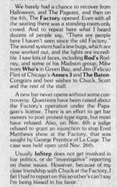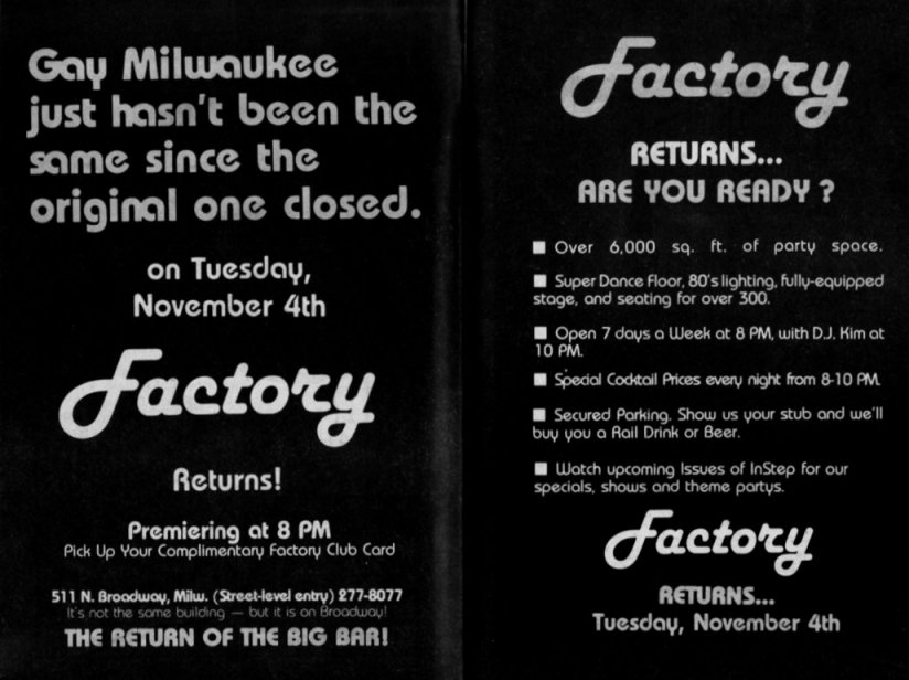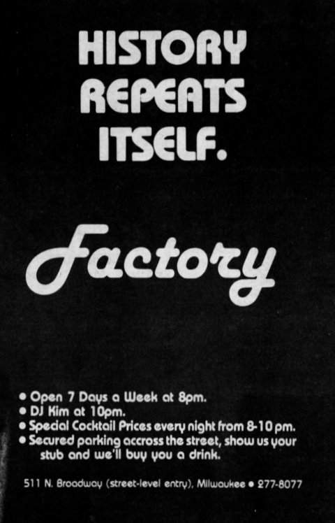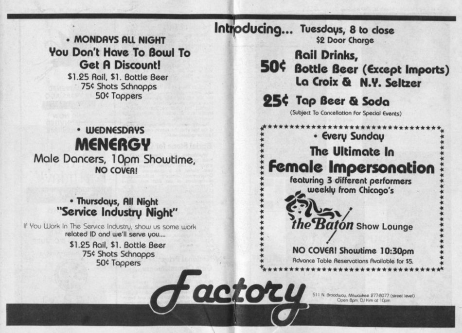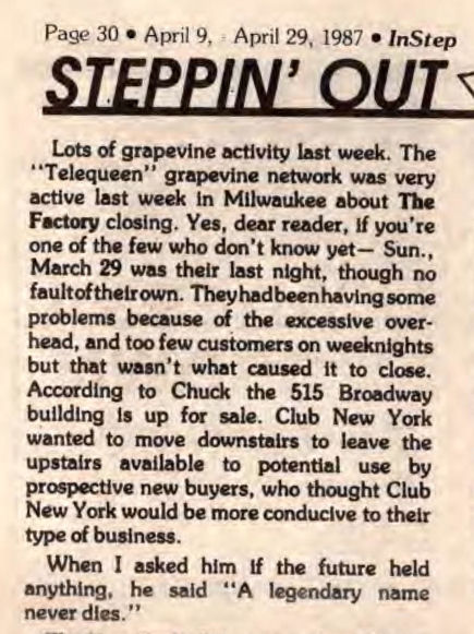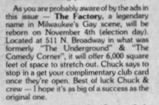 This is the 3rd bar by the name "Factory" opened by Chuck Cicirello. Located in a downtown warehouse building on a historic block, with 6,000 square feet of space, the bar had high ceilings excellent for disco lighting. The bar made an excellent venue for shows, with a large stage, plenty of seating, and excellent lighting and sound system. This bar was located in the same building as the Papagaio bar (1981-August 1987), which used the address 515 N. Broadway. The first "Factory" was located in an old manufacturing/ warehouse building, with a large wide-open space for the bar and a large dancefloor, and high ceilings. Opened just before the disco craze, it was perfectly positioned to be Milwaukee's disco palace. It reined for 10 years. Chuck's next bar was called "Factory II"- but it was not as well received. Factory II was housed in a smaller building, with lower ceiling. Although somewhat popular, it never had the same appeal, or the ability to attract the same types of crowds- and Factory II closed in a little less than 2 years. This Factory, the 3rd incarnation, was an excellent attempt to get back to the original concept. Advertising used phrases such as "Milwaukee hasn't been the same since the original (Factory) closed", and "The return of the Big Bar", and touted the high ceilings, wide open spaces, and large footprint (over 6,000 square feet). It also advertised again simply as "Factory". Although briefly popular, largely by patrons who remembered the original Factory bar a few blocks south, as well as for its show, the bar didn't retain its appeal compared to the popular La Cage dance club, located farther south. For some, the parking problems this close to downtown was one issue. The high overhead also was a problem, as there were too few customers on weeknights to cover overhead. More seriously, the building was up for sale by the owners, and they wanted to move "Club New York", a bar upstairs, to have the main floor space- forcing the Factory 3 out. The history of all three "The Factory" bars, and Chuck Cicirello, was published on the OnMilwaukee.com website in 2024. |