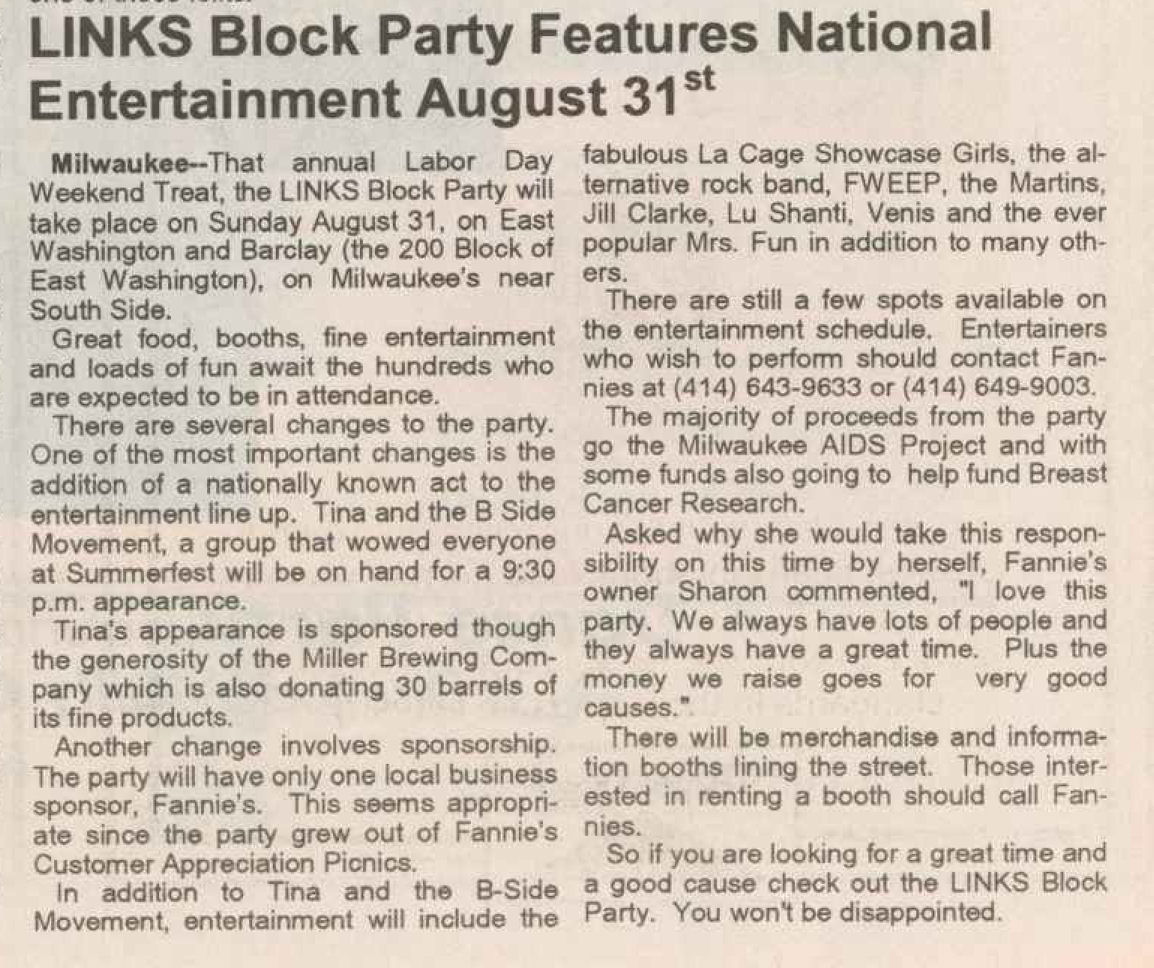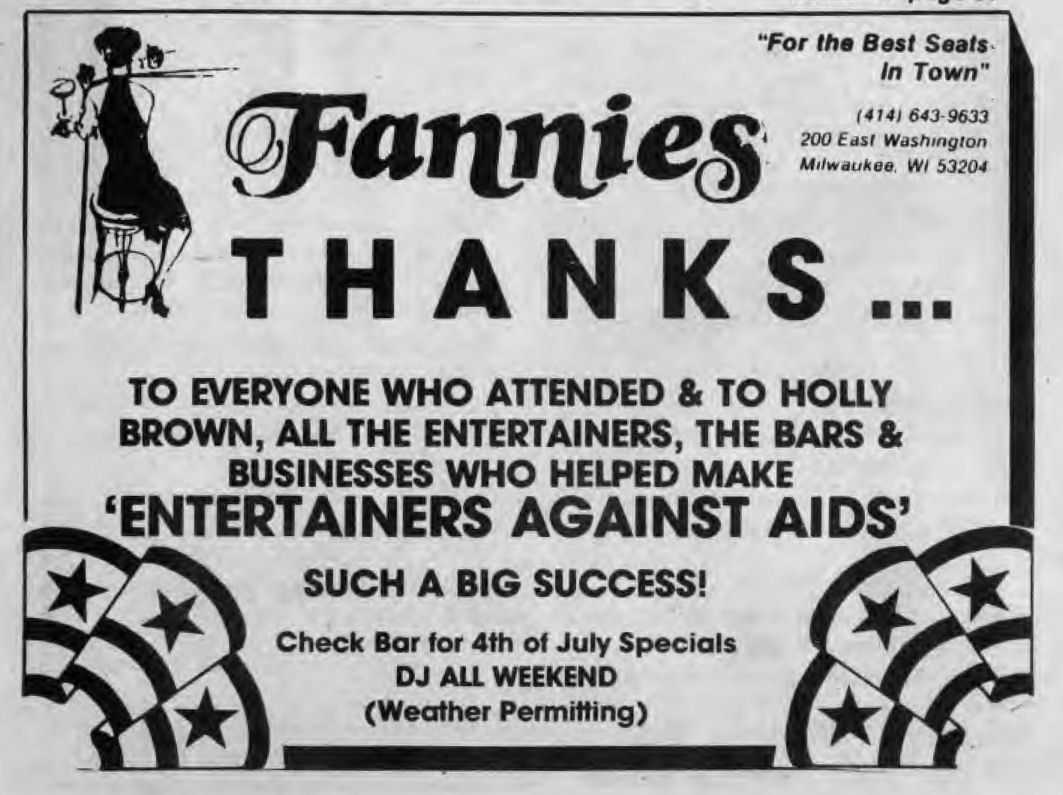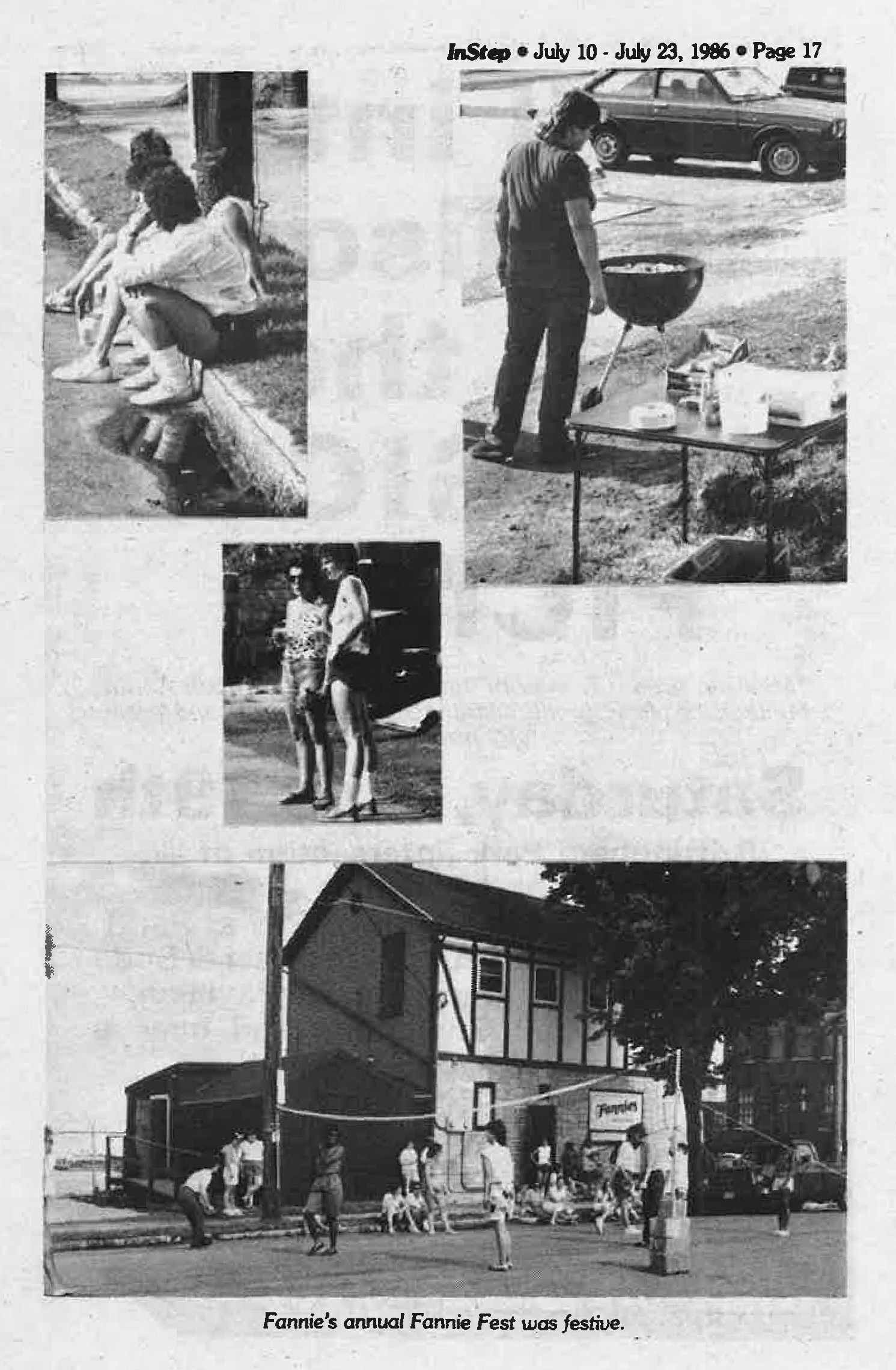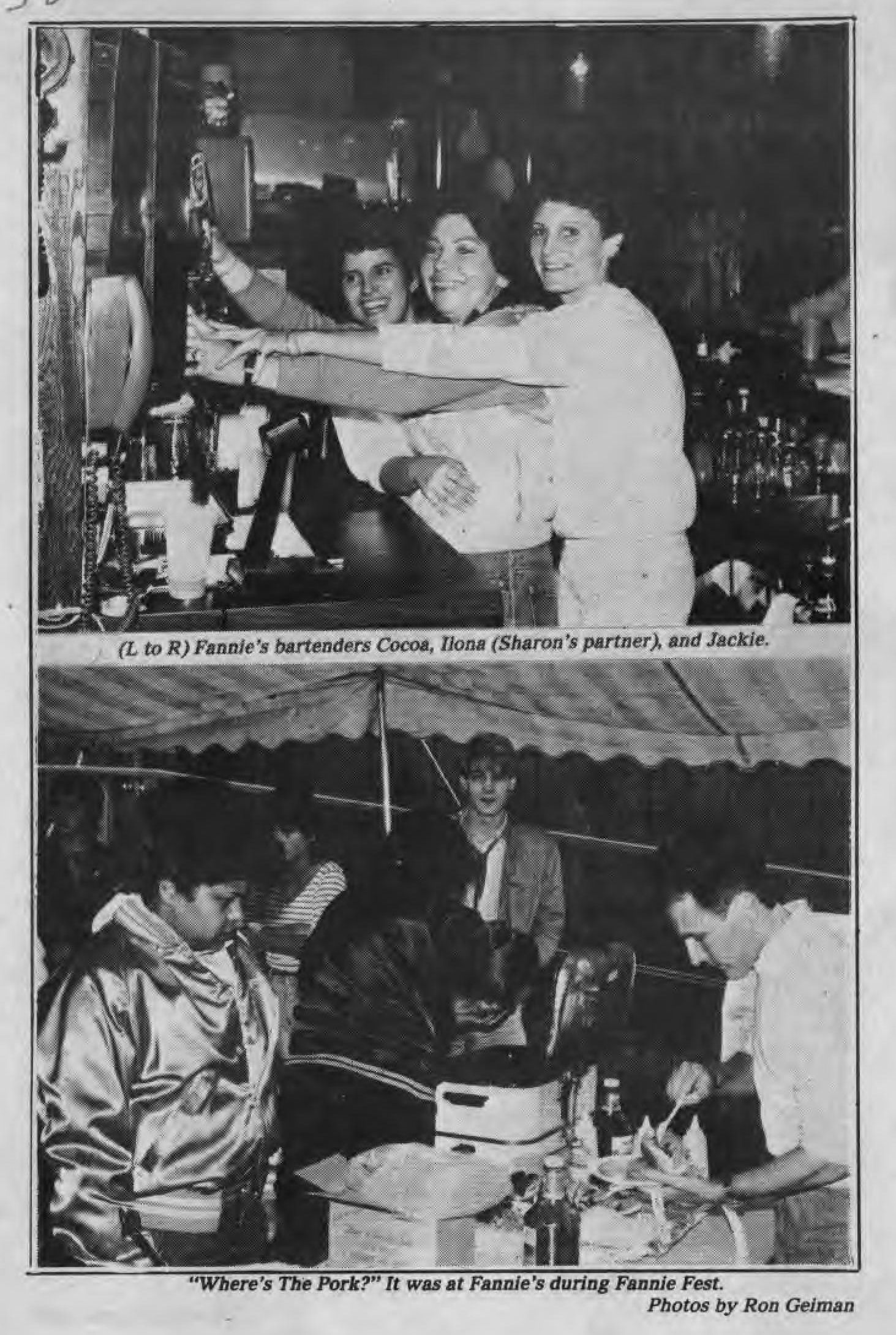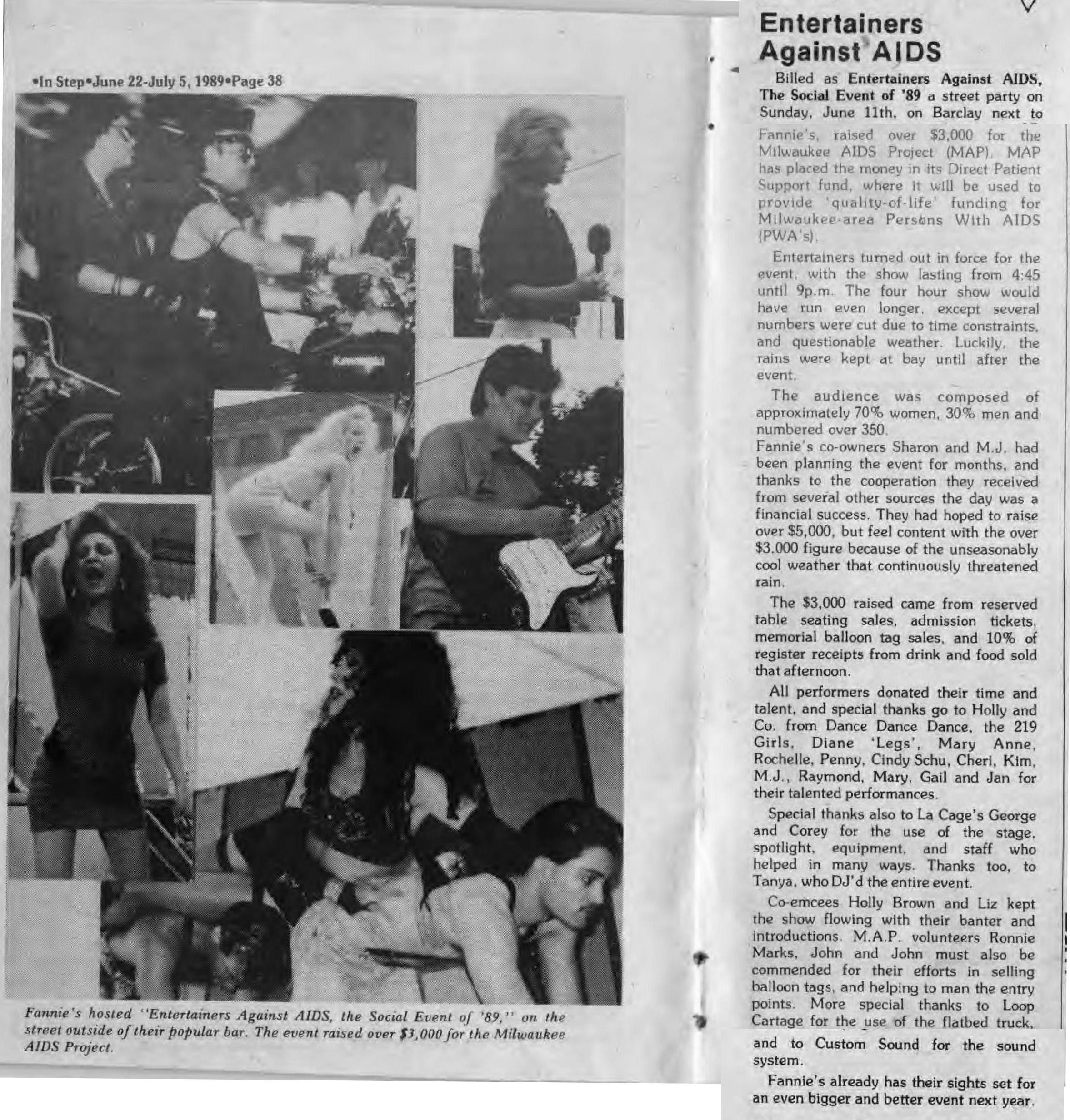 Photos, Article and Ad: 'Entertainers Against AIDS' fundraiser street party next to Fannies