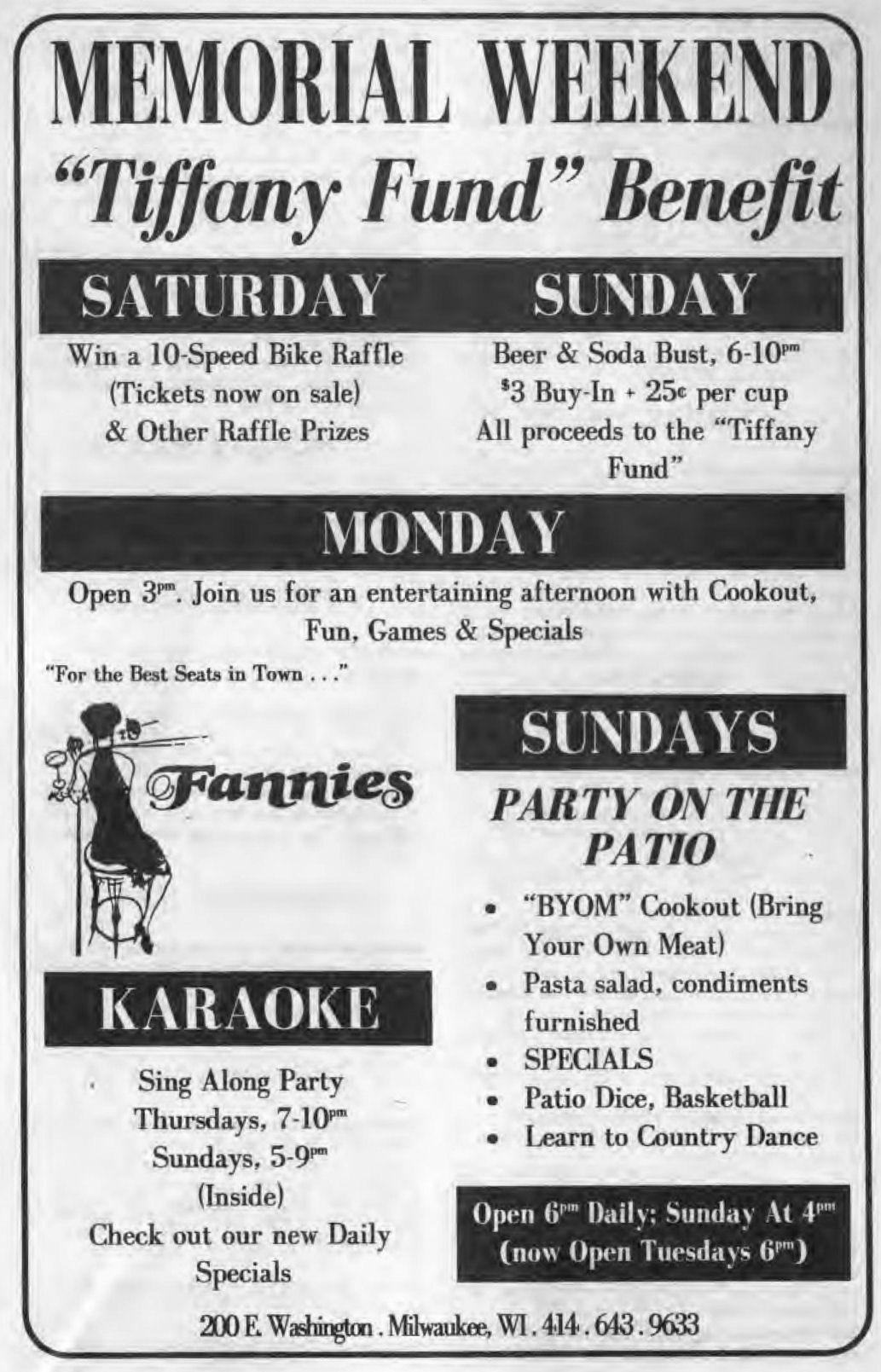 Ad: Memorial weekend, "Tiffany Fund" benefit