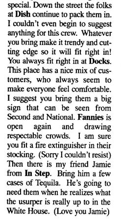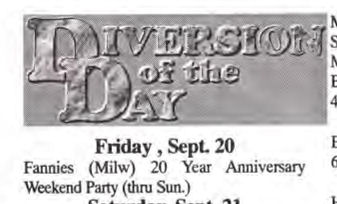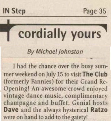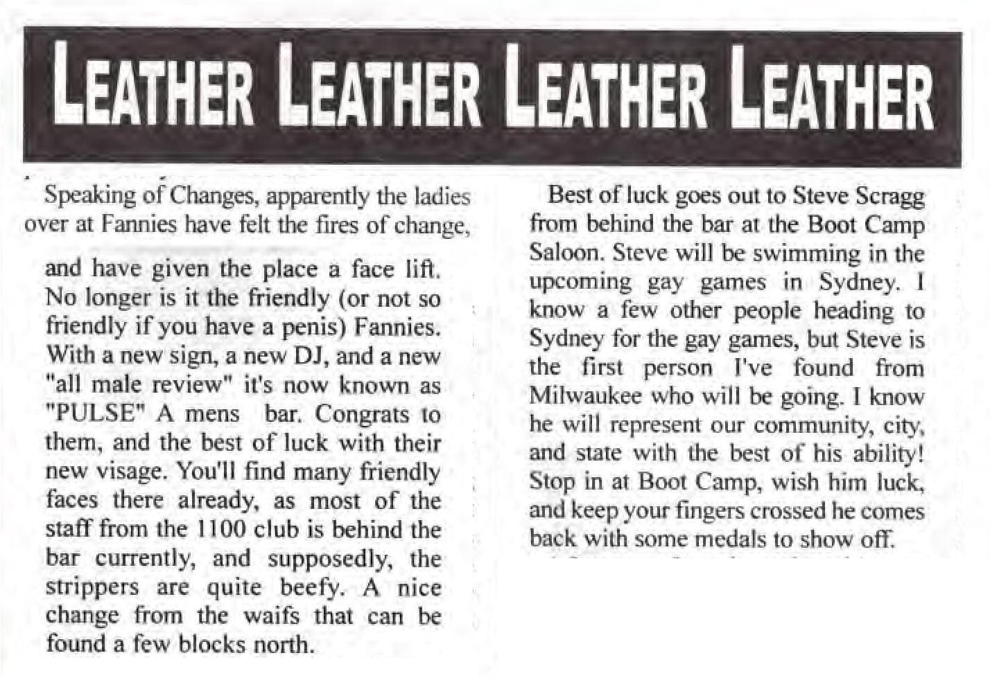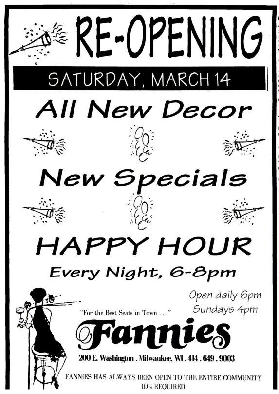 Fannies was opened as a lesbian bar in September 1983 by Sharon Dixon (who had previously been a business partner in at least one other lesbian bar, the Sugar Shack). (Prior to this, another local gay bar, 'Finale', had named one of their bowling league teams the 'Finale Fannies'). Owner Sharon Dixon recalls the popularity of the bar in an interview (see below). In addition to numerous theme parties, a "Fannie Fest' street party, cookouts and shows, the bar built a beautiful outdoor patio, fenced in to provide privacy. The patio became one of the bar's most popular features even when the business was eventually reopened under other names. Fannies is best known to some for its colorful and checkered history. Extremely popular with the lesbian crowd for many years, there were a few robberies, accidents and fires and a great deal of speculation about whether the owner was involved in one or more of them. The bar was closed several times for renovation after fires or other reasons. The most remembered incident is a fire at Fannies on October 28, 1997 which resulted in the bar sustaining extensive damage; at the time, it is said the bar was in disrepair and facing competition from a new lesbian bar, 'Dish', that was scheduled to open nearby. Owner Dixon was convicted of arson in January 2000 (In Step v17-03), but appealed. Throughout that time, the bar was fixed up and reopened in early 1998. But the rumors had hurt business, and by the year 2000, Fannies became more a mixed lesbian/gay bar, with a male DJ occasionally mentioning the different mix of songs he needed to master to cater to the male clientele. The bar seems to have been on rocky grounds however. The bar was no longer being listed in most issues of local LGBT publications' "bar guides". A mention in the daily calendar of Quest v7-09 for Friday June 9, 2000 simply said that "Fannies (Milw) reopens today, under new ownership and management". The July 2000 issue of In Step magazine (v17-15) mentions that the bar has been renamed 'The Club', and yet in Quest v7-21 (December 2000) a mention is made that "Fannies is open again and drawing respectable crowds". Quest continued to list daily events at 'Fannies' while In Step mentioned events as being at 'The Club/Fannies'. Confusion among patrons reined, and the media seemed just as confused so often left the bar off their listings (by any name)! By January 2002, the only mentions in media are of 'Fannies' again, 'The Club' name having been quietly dropped. In September 2002, the bar noted in the "Diversions of the Day" calendar in Quest v9-11 magazine that they would be holding a "20 Year Anniversary Weekend Party" on September 20, 2002 (the start of what would have been the bar's 20th year). But in the next issue of Quest (v9-12, October 2002), word that the bar had been remodeled and reopened as Pulse, a 'mostly gay' bar. The building at 200 E. Washington was the location of a total of six LGBTQ bars: